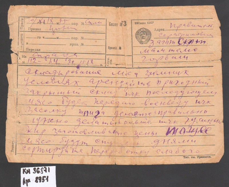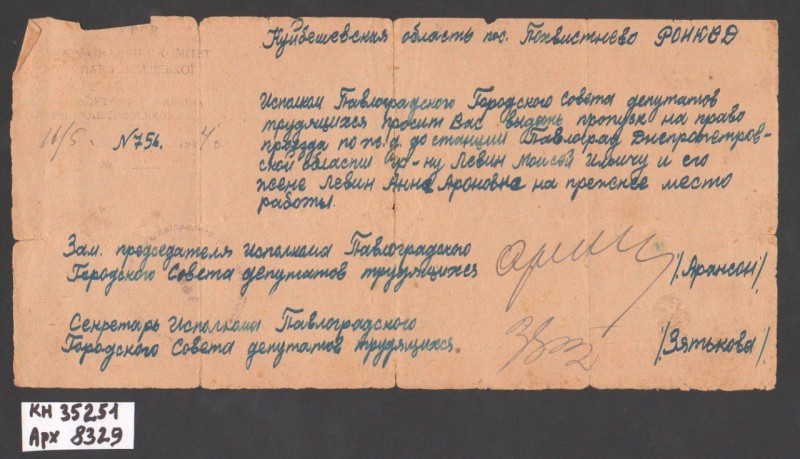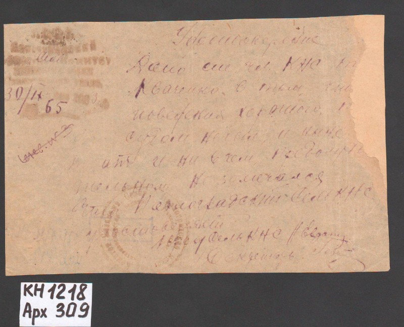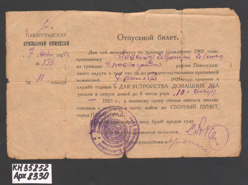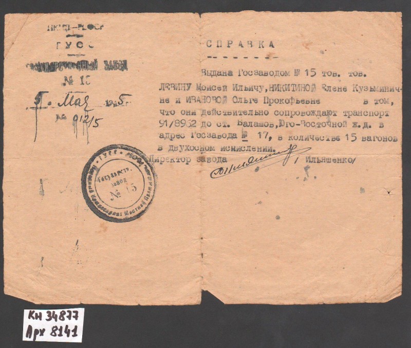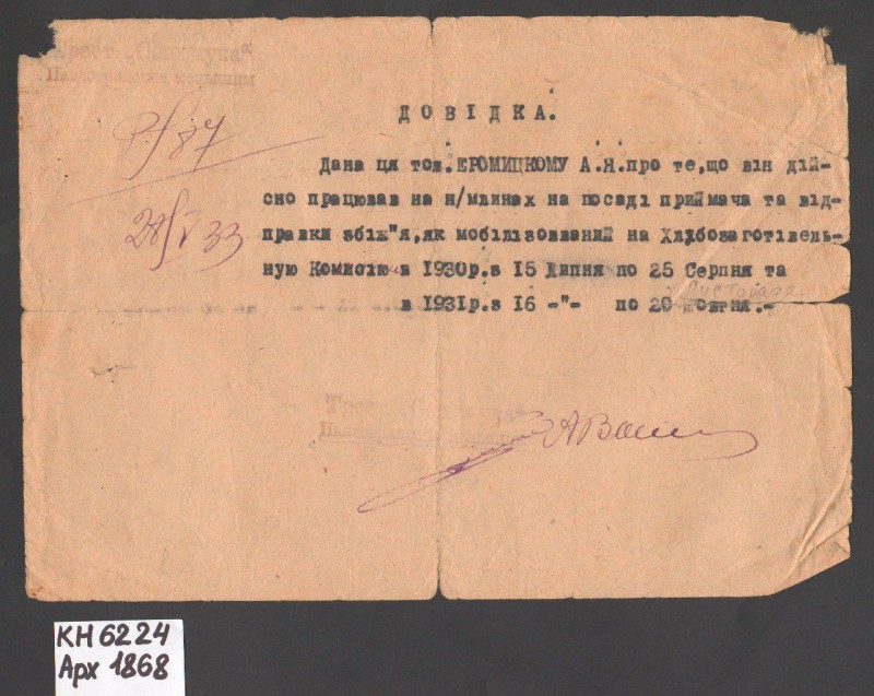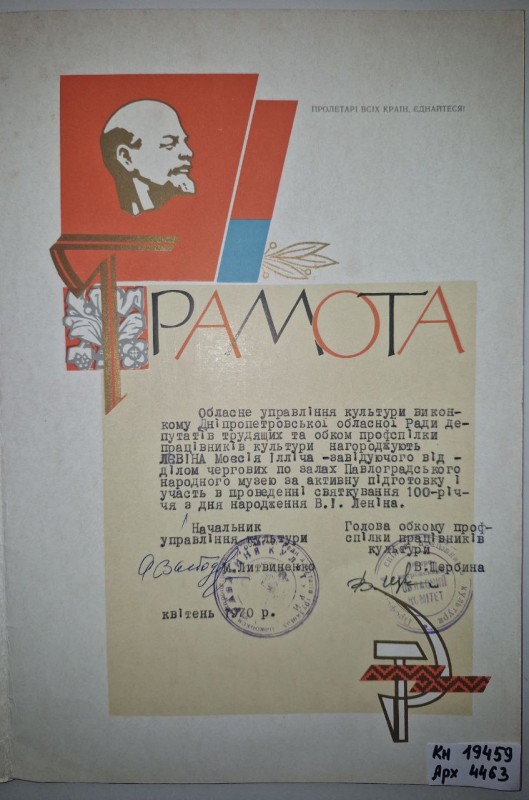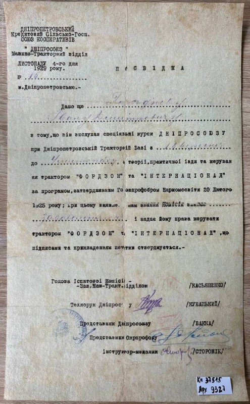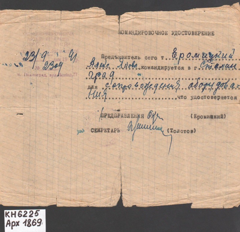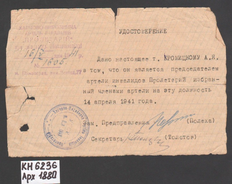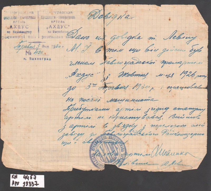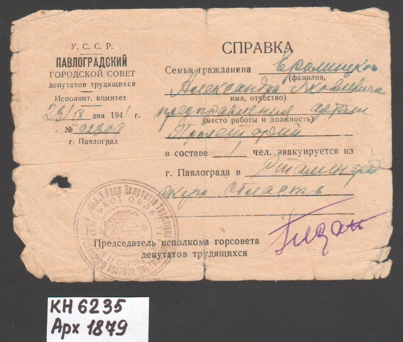 Акт про приймання виправдувальних документів грошового характеру від головного бухгалтера Павлоградської райконтори Петра Степановича Горбаша до керуючого Дніпропетровської обласної контори Заготскот М. І. Галінкіну. Акт надруковано на машинці, на одному аркуші . Завірено підписами та печаткою. Сталінградська область, м. Камишин, 3 листопада 1941 р.