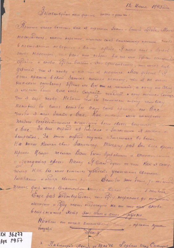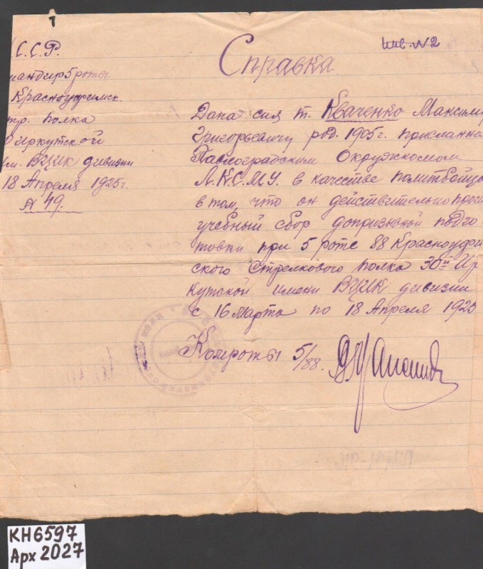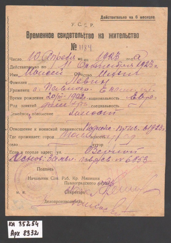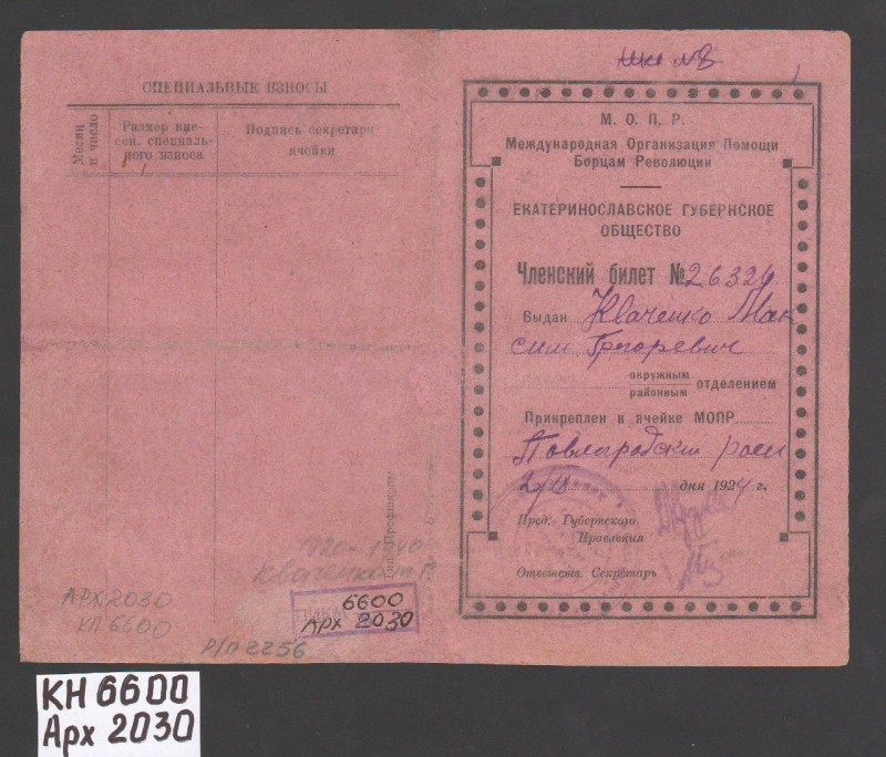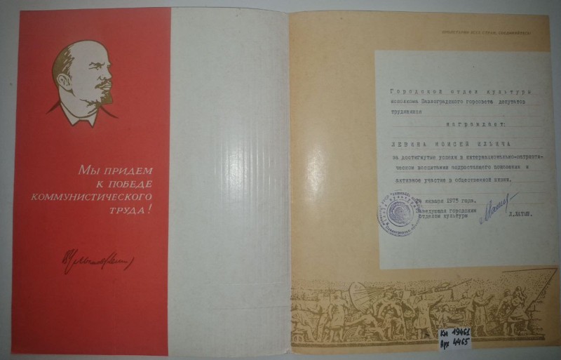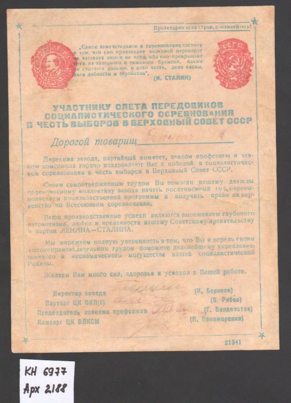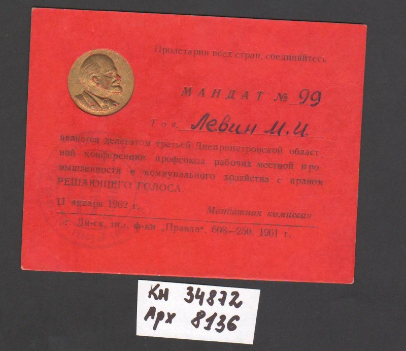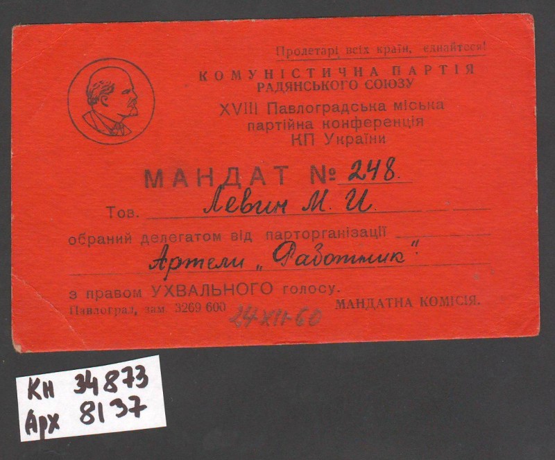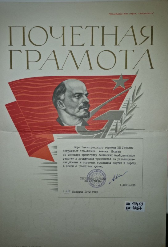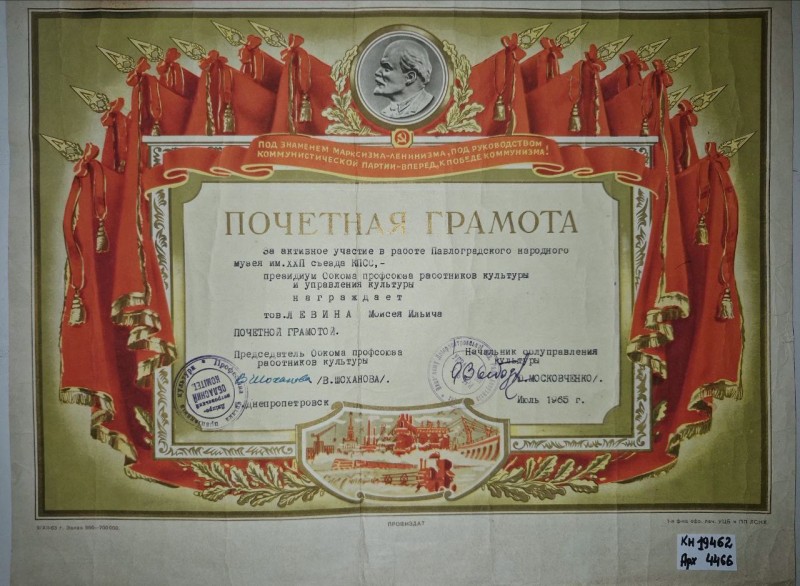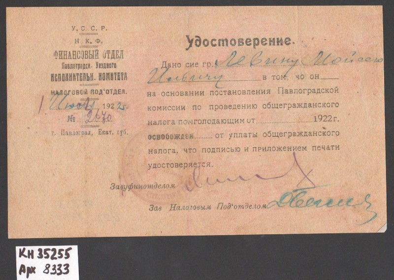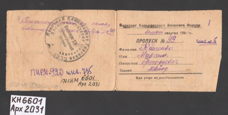 Акт про приймання виправдувальних документів грошового характеру від головного бухгалтера Павлоградської райконтори Петра Степановича Горбаша до керуючого Дніпропетровської обласної контори Заготскот М. І. Галінкіну. Акт надруковано на машинці, на одному аркуші . Завірено підписами та печаткою. Сталінградська область, м. Камишин, 3 листопада 1941 р.