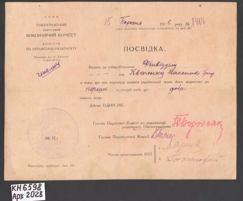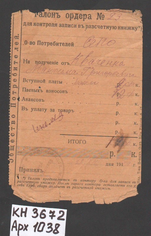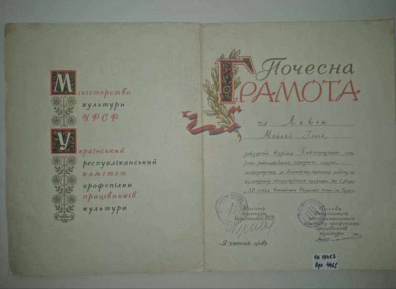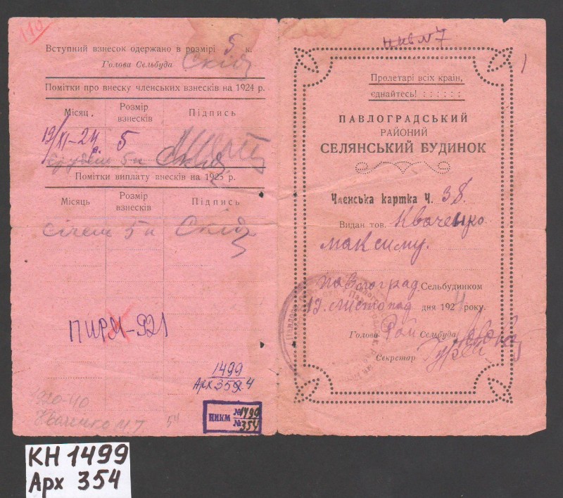 Акт про приймання виправдувальних документів грошового характеру від головного бухгалтера Павлоградської райконтори Петра Степановича Горбаша