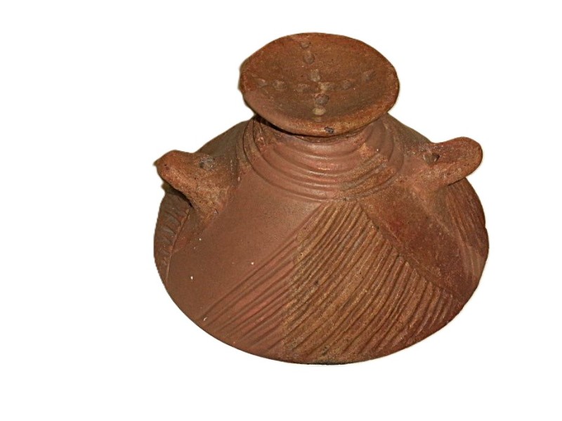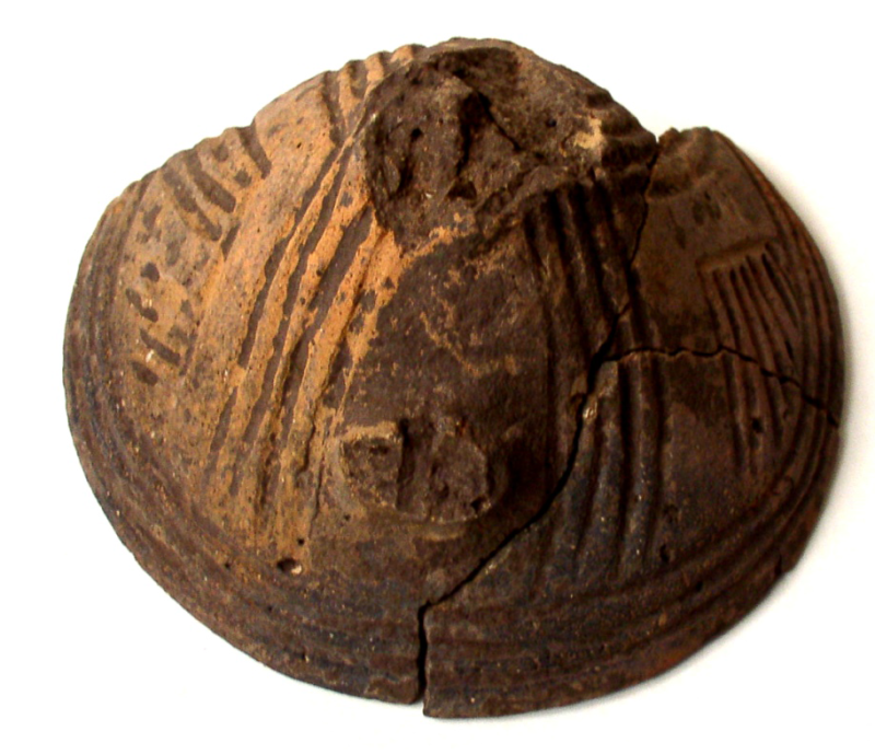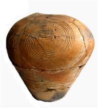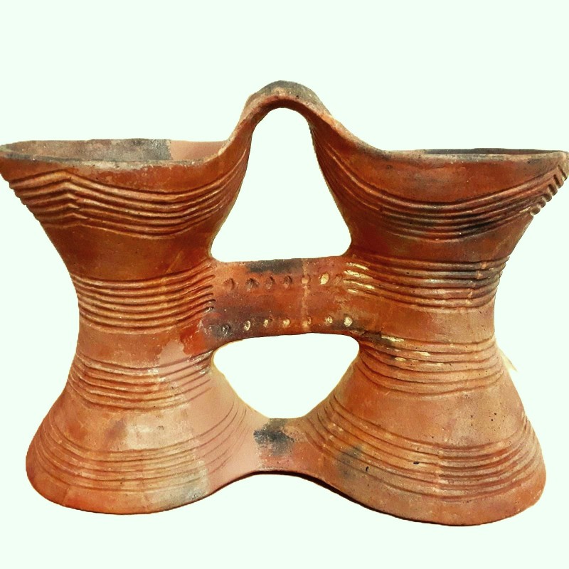 Біноклеподібна посудина («бінокль») має вигляд двох циліндрів з поставленими на них вгорі та знизу чашами конічної форми, які мають наскрізні отвори та з’єднані між собою трьома перемичками. Верхня перемичка піднята над чашами, з вигином. Середня та нижня – прямі. Орнаментальна композиція на циліндрах складається із трьох груп горизонтальних врізних ліній та однієї групи з дугоподібних, з’єднаних між собою під кутом – на верхніх чашах. Середня перемичка прикрашена двома горизонтальними рядами наколів (ямок). Поверхня виробу світло-коричневого кольору. Загалом, форма посуду нагадує дві людські постаті, що тримаються за руки з чашами на голові. Щодо призначення такого посуду, на думку археологів існує декілька версій. Оскільки були випадки, коли знаходили такі вироби з попелом та перепаленими кістками тварин на вівтарях у трипільських спорудах, є припущення про використання їх під час релігійних обрядів жертвопринесень. Постаті з чашами на голові, таким чином, могли символізувати акт жертвопринесення. Також, є припущення щодо використання їх під час обряду «поїння землі» - для викликання дощу або як подвійних барабанів. Отже, всі версії та припущення, зводяться до того, що біноклеподібні посудини – це форма культової кераміки трипільської культури кінця V – II пол. ІV тис. до н.е. Широко відомі після розкопок Хвойки В.В. у Середньому Подніпров’ї на поселеннях біля с. Трипілля, Верем’я, Щербанівка.