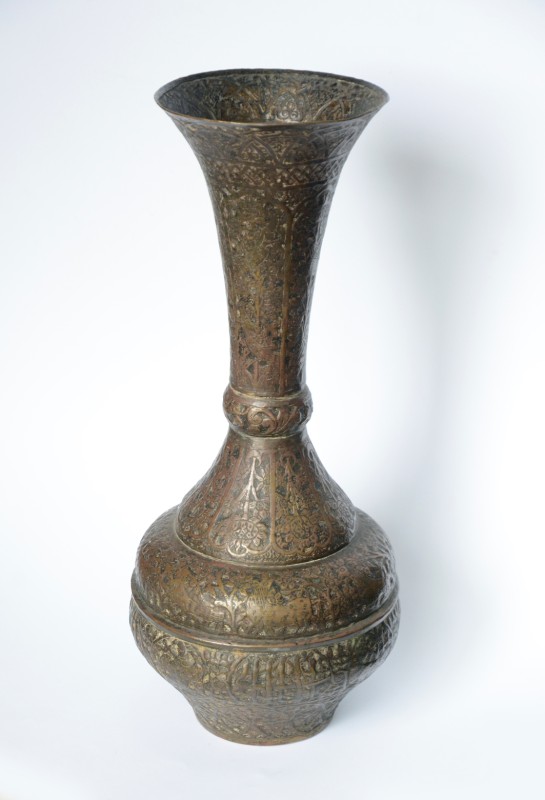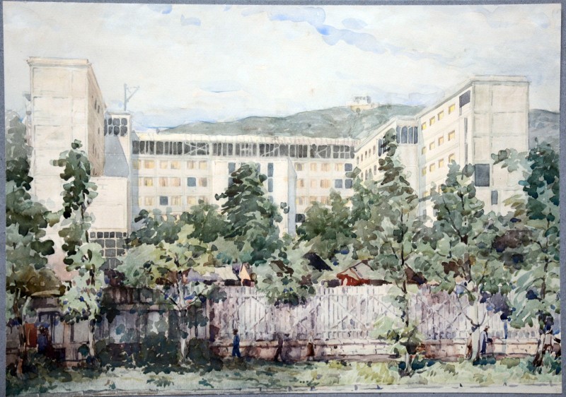 Чашка біла, циліндрична, розширена догори і скругленна до низу на високій профільованій ніжці. Ручка петлеподібна у вигляді двох з'єднаних рокайлей. По внутрішньому краю чашки, по тулову навколо пейзажу і по ніжці - відводка золотом. По тулову зображений архітектурний пейзаж з замком у сіро-зеленій гаммі.