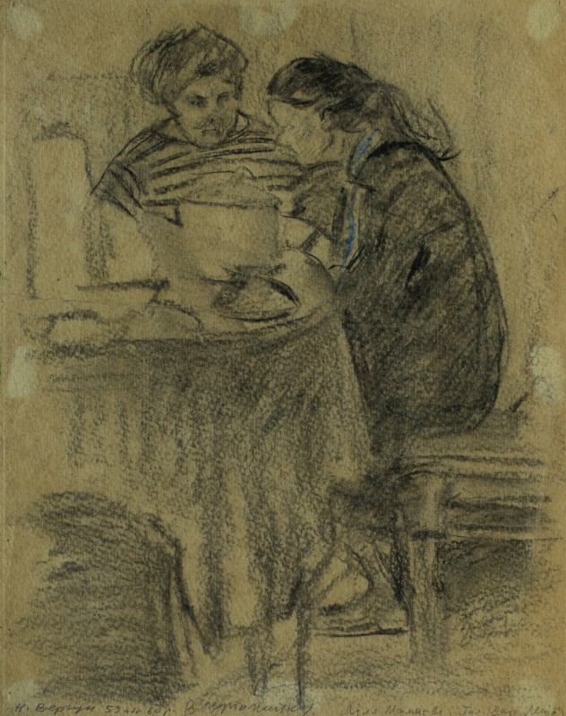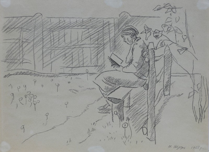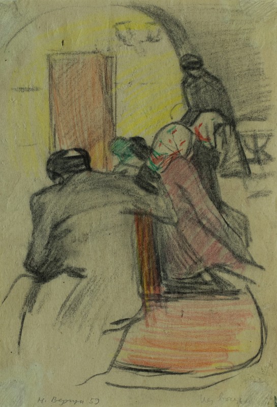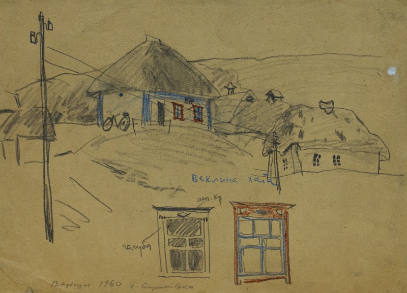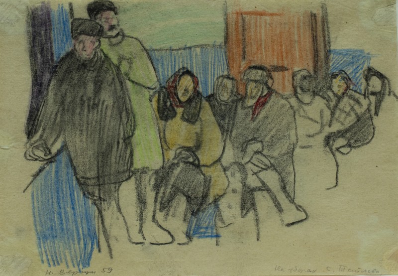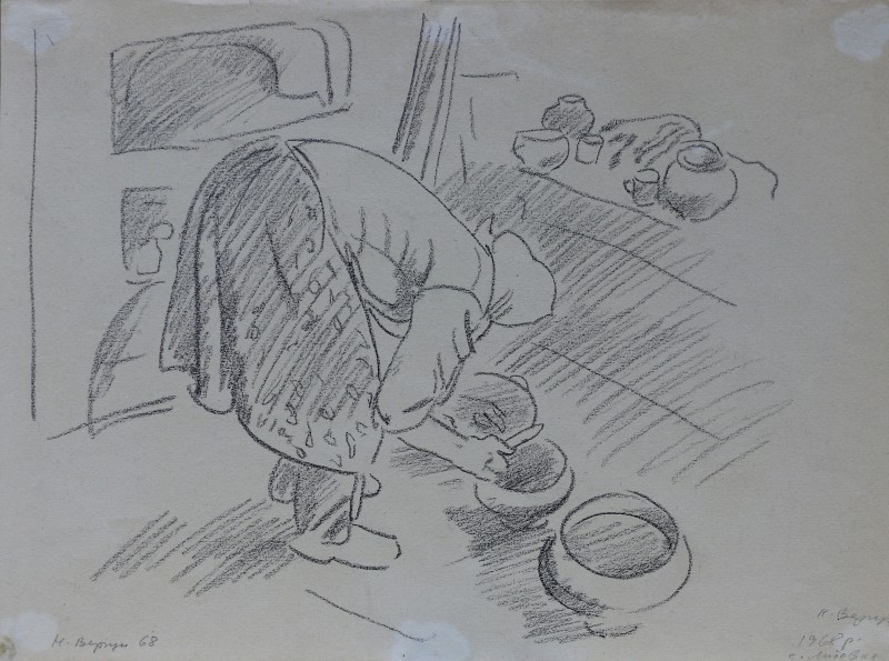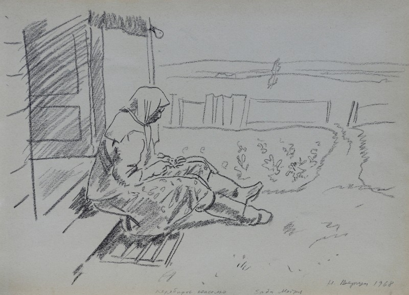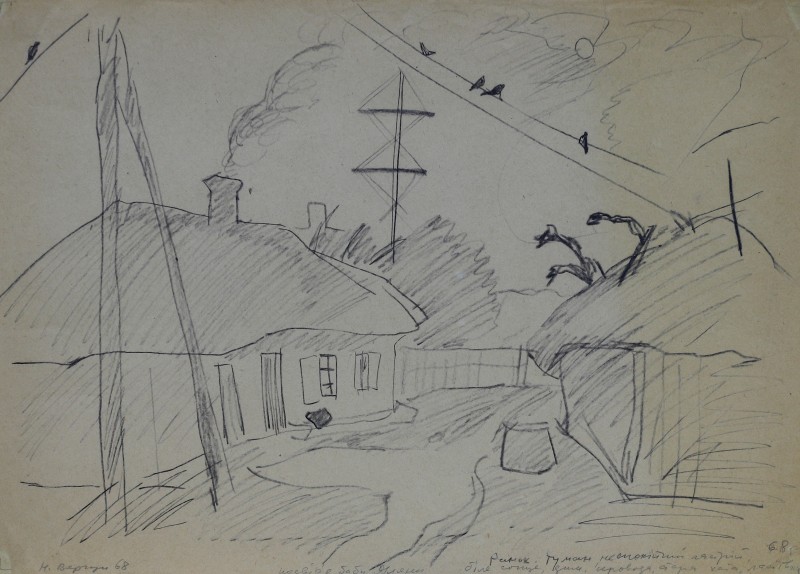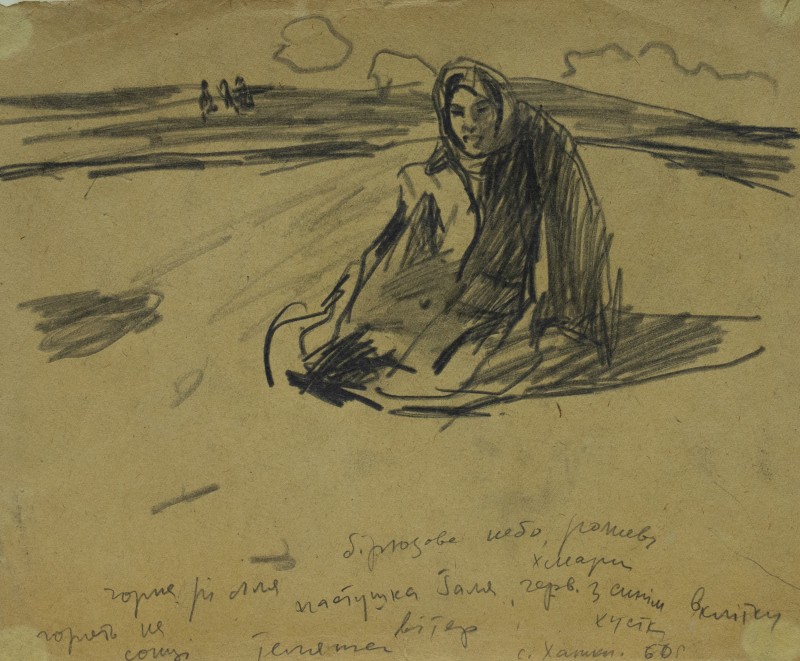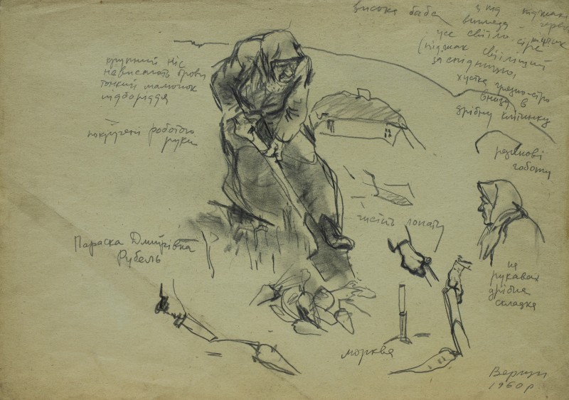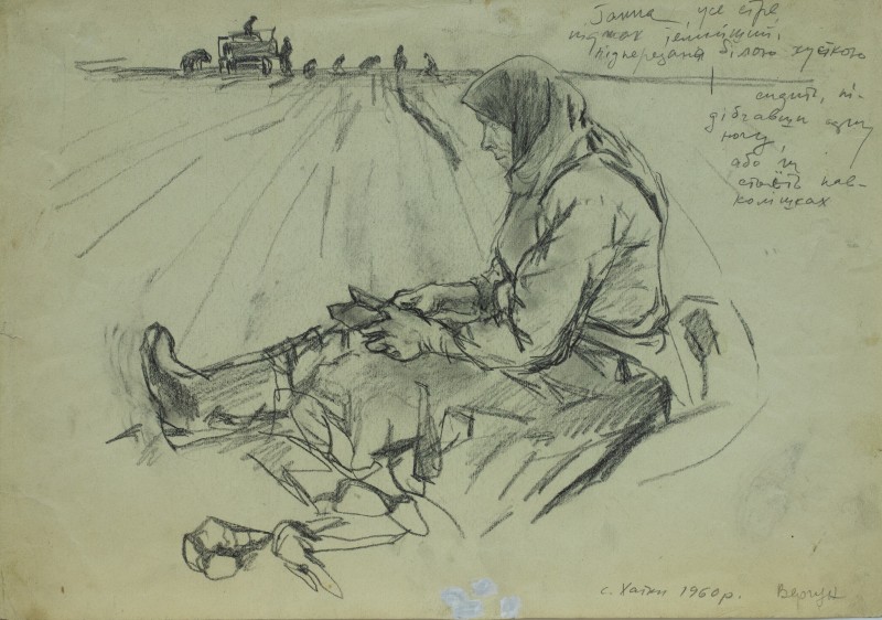На тлі поля в центрі анфас зображення старої баби у довгій спідниці, фуфайці, хустці, яка сидить по-турецьки зібравши ноги та чистить ножем буряки. Угорі ліворуч начерк рук з ножем та буряком.