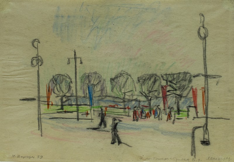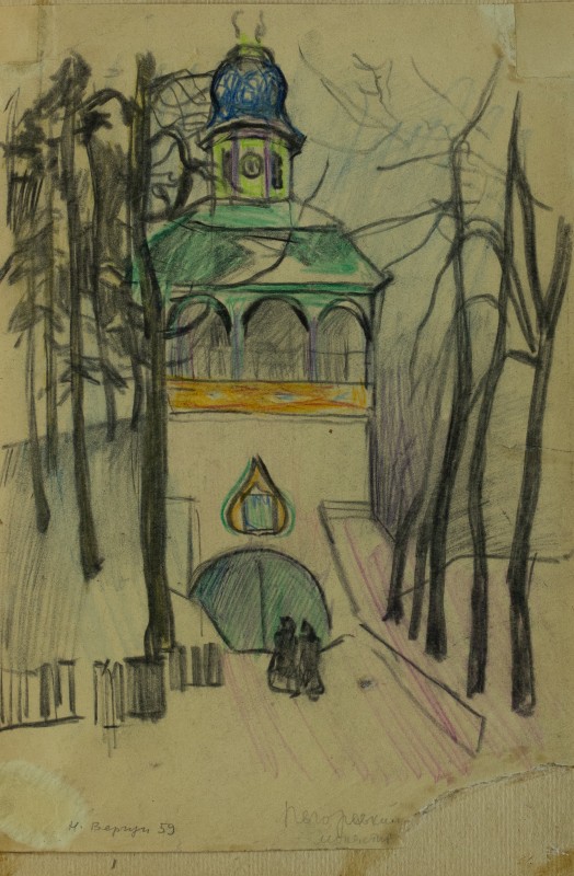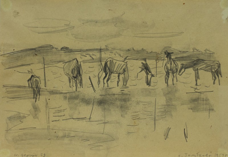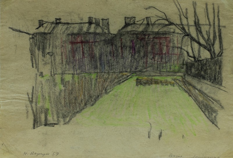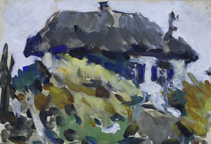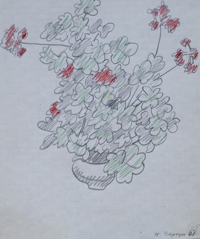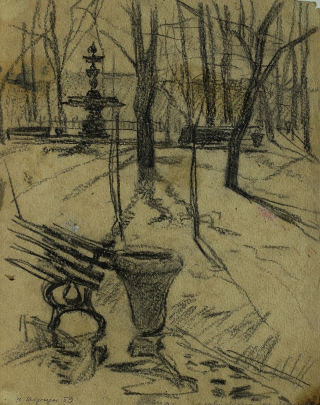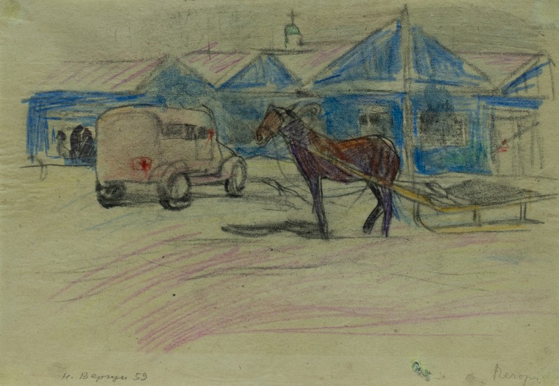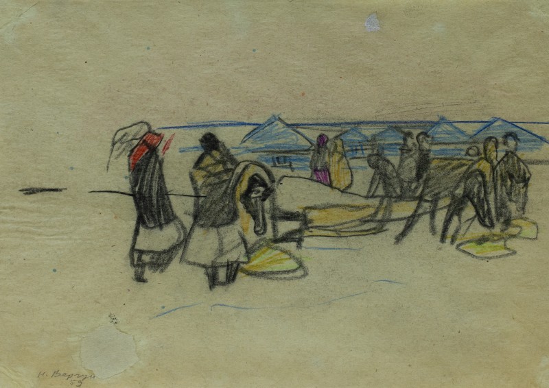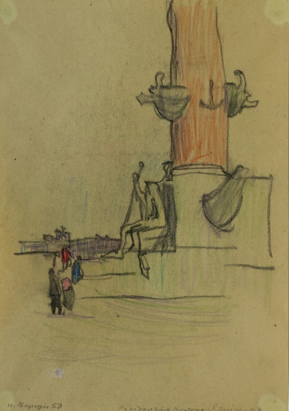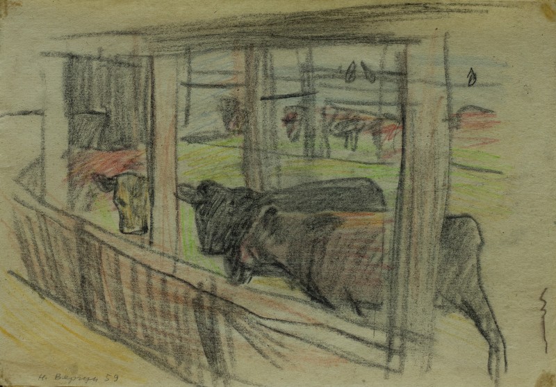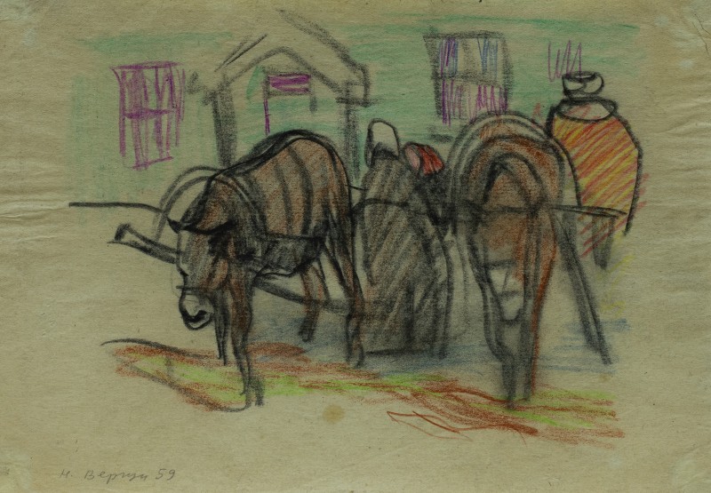 На тлі поля в центрі анфас зображення старої баби у довгій спідниці, фуфайці, хустці, яка сидить по-турецьки зібравши ноги та чистить ножем буряки. Угорі ліворуч начерк рук з ножем та буряком.