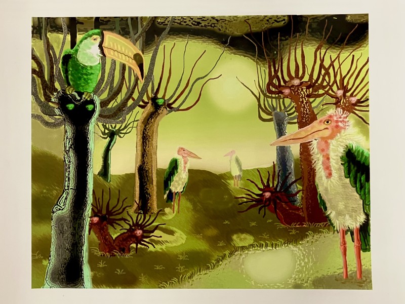 Робота виконана кольоровими олівцями, фломастерами та ручками на папері. Це деталізований твір, у якому автор ретельно опрацював кожного персонажа, кожну книгу, іграшку та прилавок. Кожна деталь промальована з великою увагою, що підкреслює кропітку працю автора.
