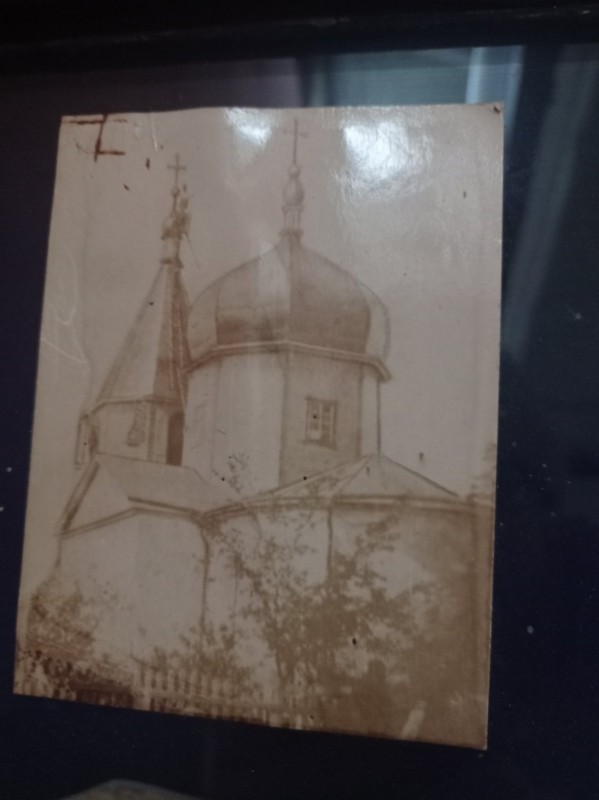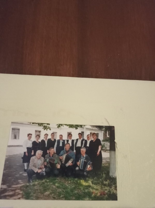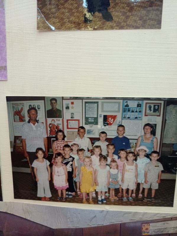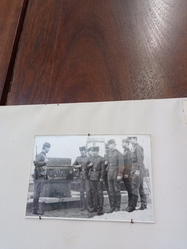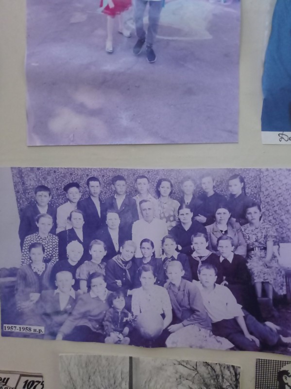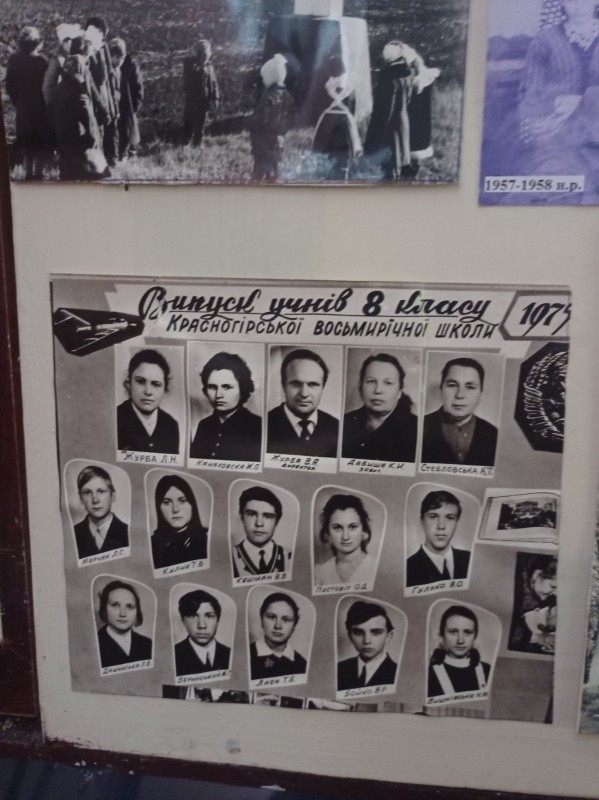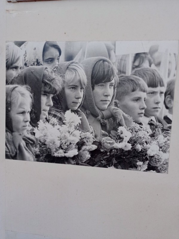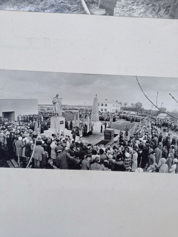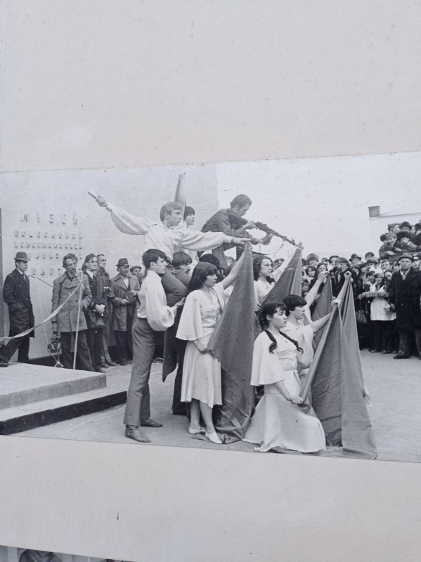 Фото чорно-біле на якому зображено жителі села Красногірка біля трибуни під час відкриття музею "Спартак".