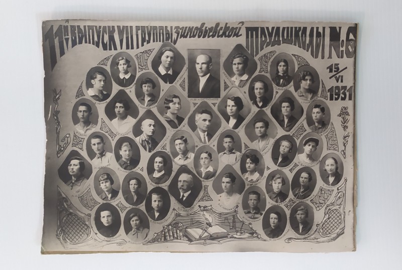 Фото чорно-біле, групове. Ударна бригада студентів, що дотерміново закінчила техматвідділ Зінов'євськогр Інституту Соцвиху