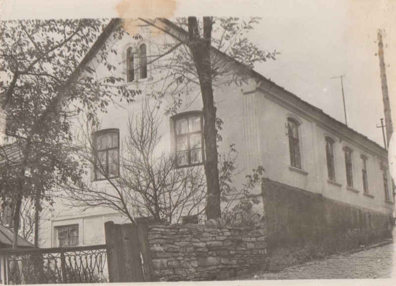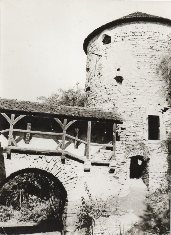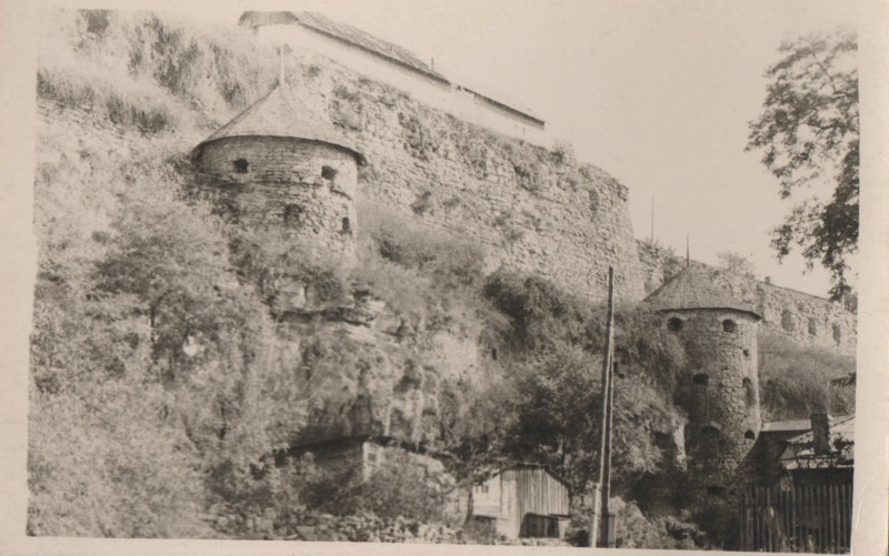 Фото: Каньйон річки Смотрич в місті Кам’янці-Подільському, 1996 р. Автор Бєлік Є.В. Фото чорно-біле, горизонтальне. Вид – документальна фотографія. Зображено ремонт дамби в каньйоні річки Смотрич на території Старого міста.