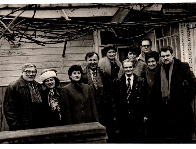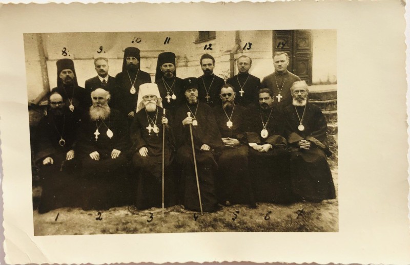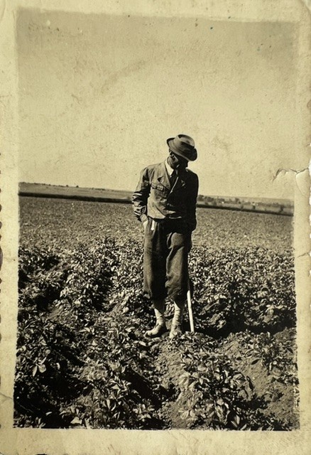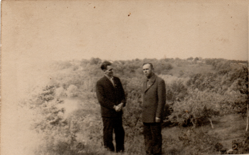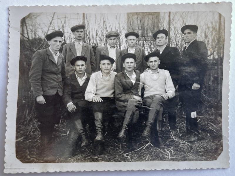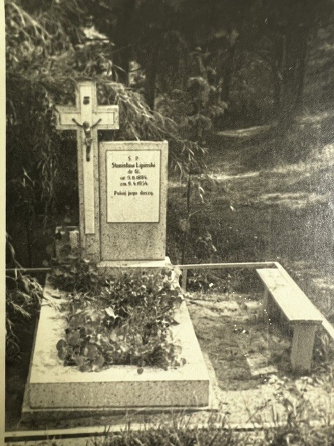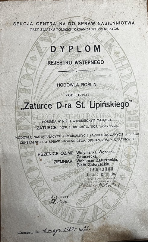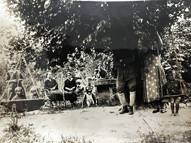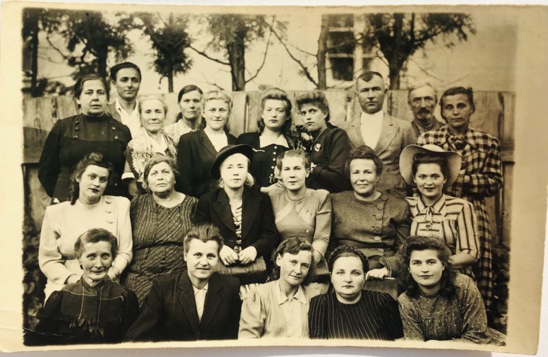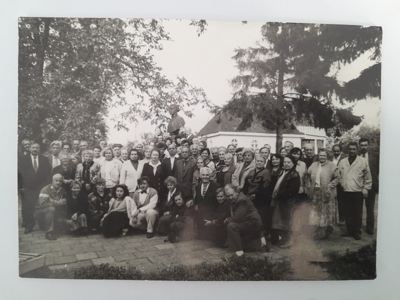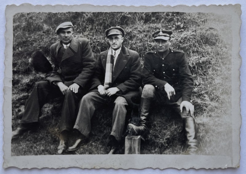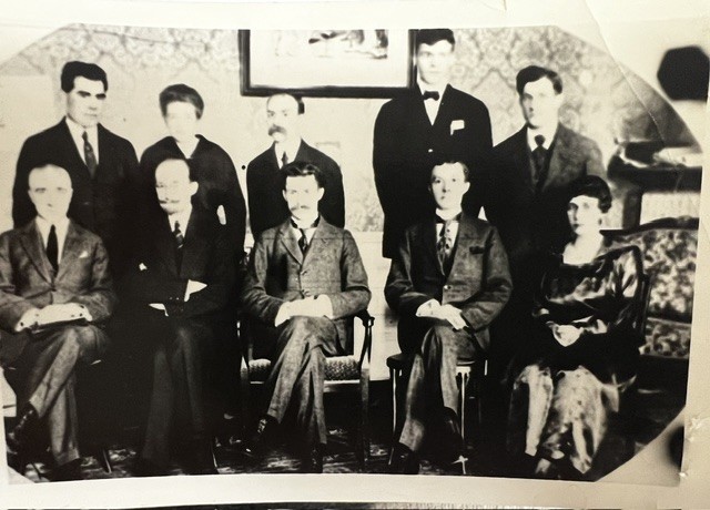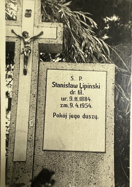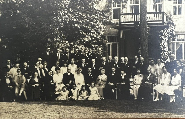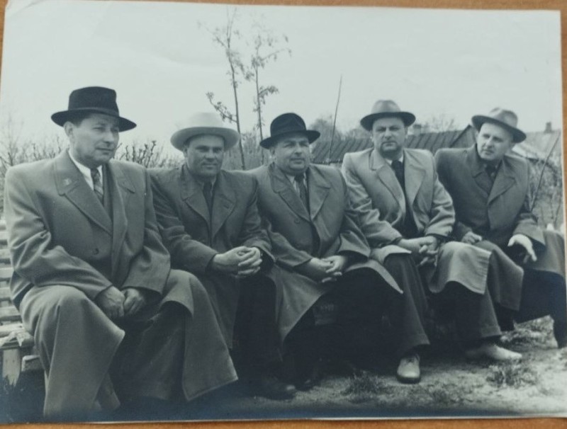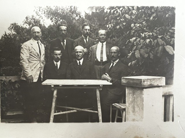 Фото ч/б, групове. Станіслав Ліпінський (другий зліва) з колегами за столом. Сімнадцять осіб (16 чоловіків, 1 жінка) сидять за столом, вкритим білою скатертиною, на столі -- вази з квітами та столові прибори. Чоловіки у костюмах, сорочках з краватками, жінка у блузці та спідниці. Фон -- виноградники, високі дерева.