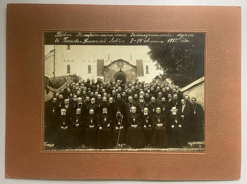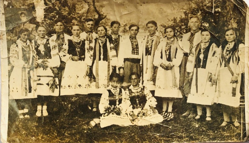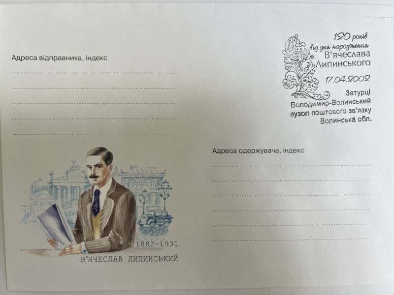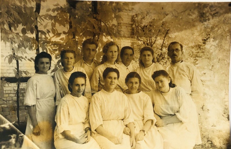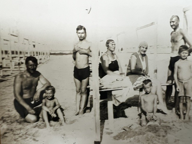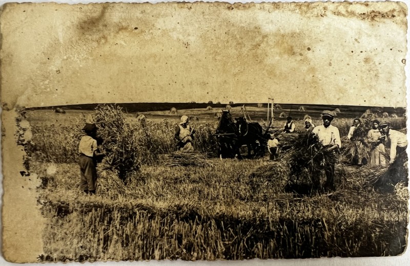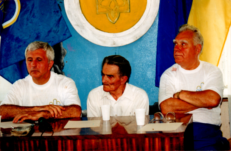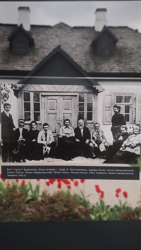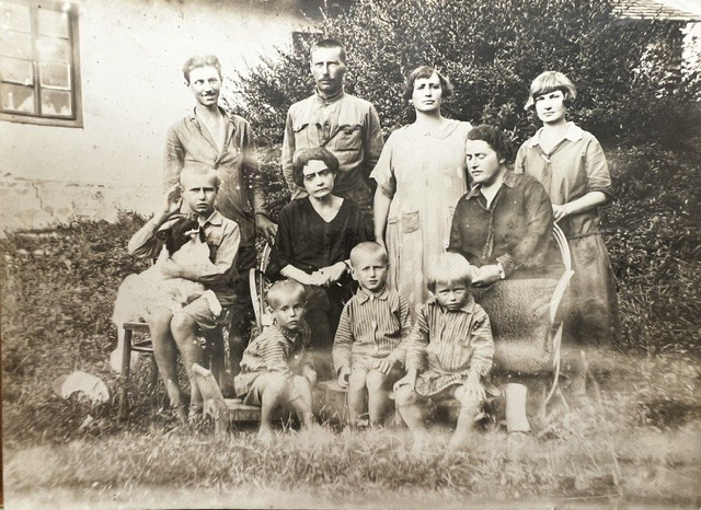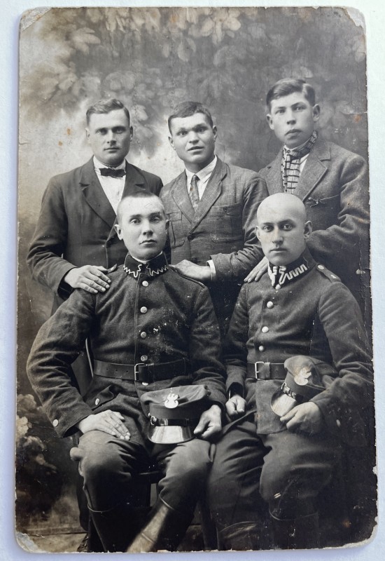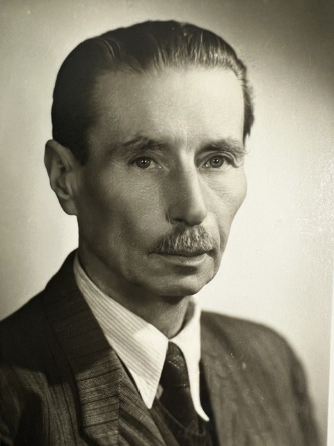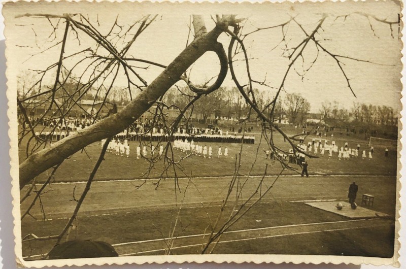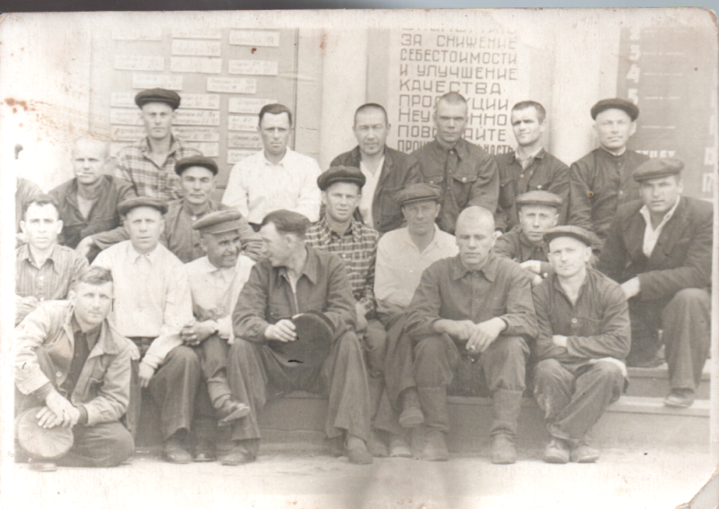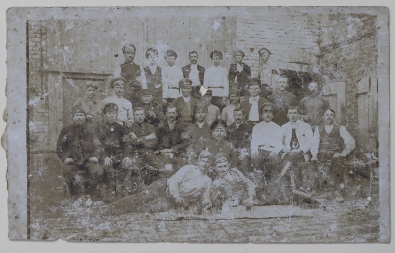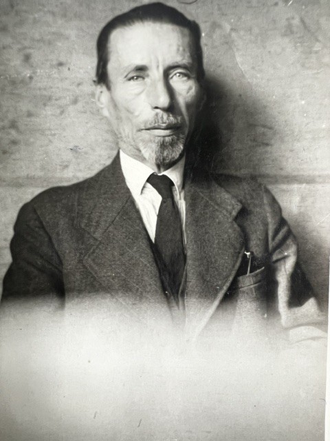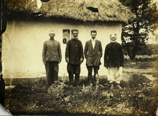 Фото ч/б, групове. Станіслав Ліпінський (другий зліва) з колегами за столом. Сімнадцять осіб (16 чоловіків, 1 жінка) сидять за столом, вкритим білою скатертиною, на столі -- вази з квітами та столові прибори. Чоловіки у костюмах, сорочках з краватками, жінка у блузці та спідниці. Фон -- виноградники, високі дерева.