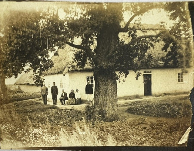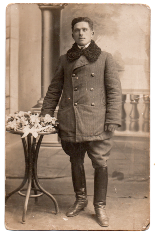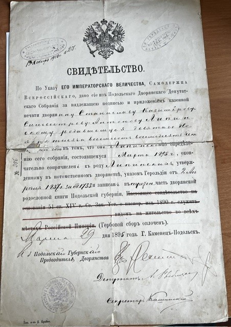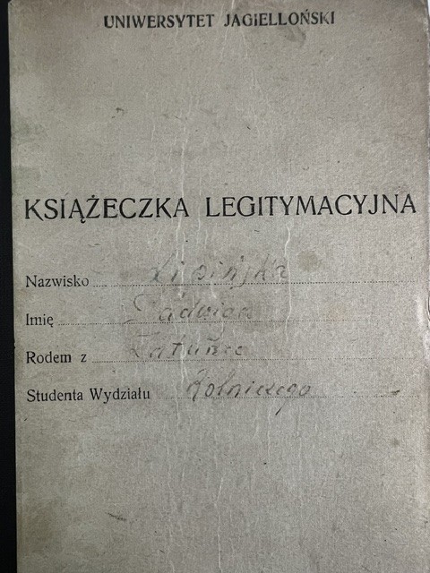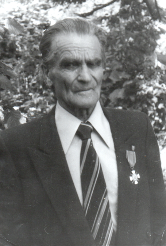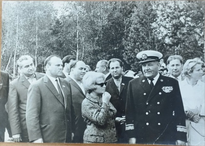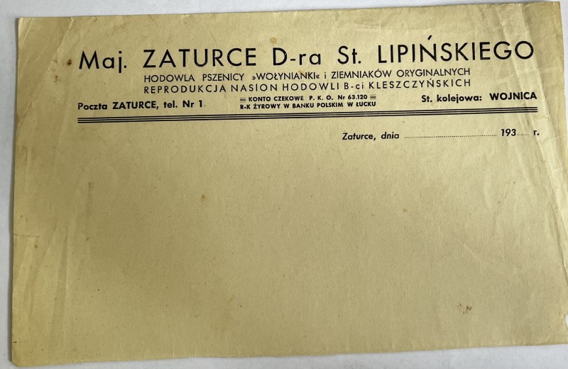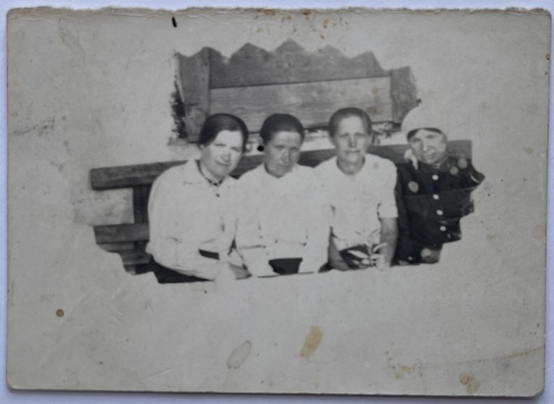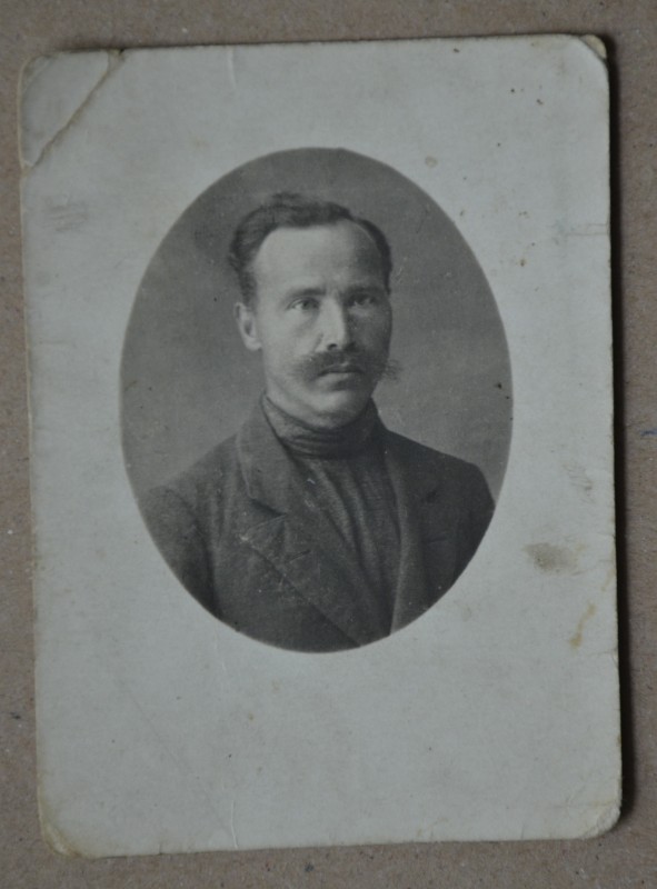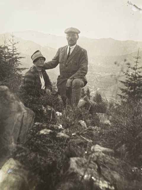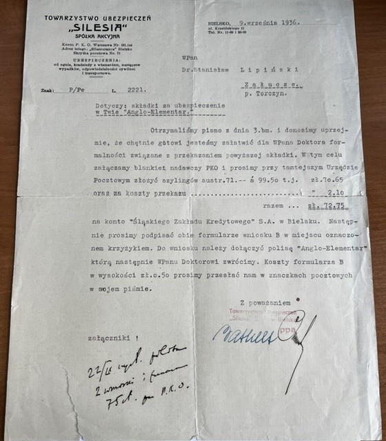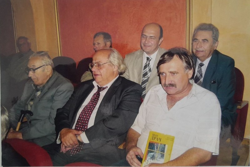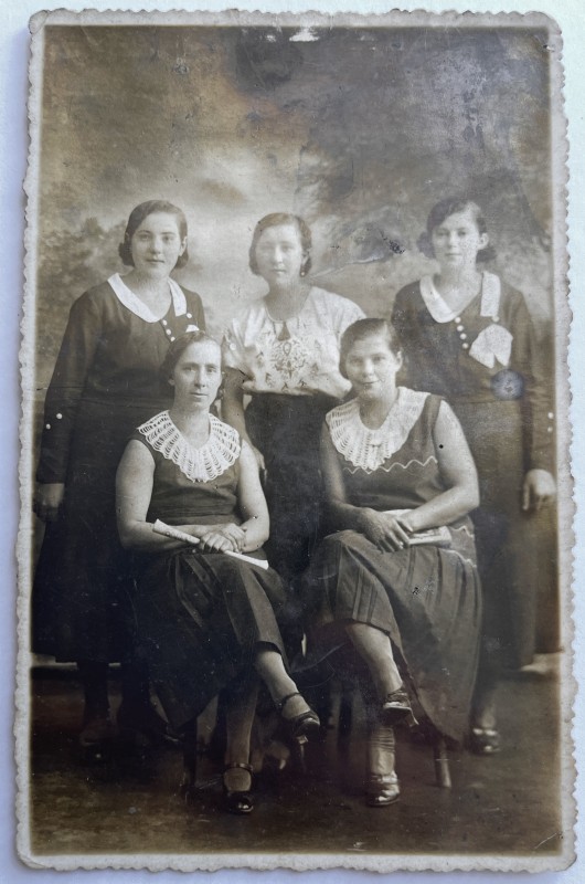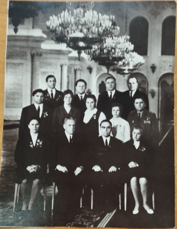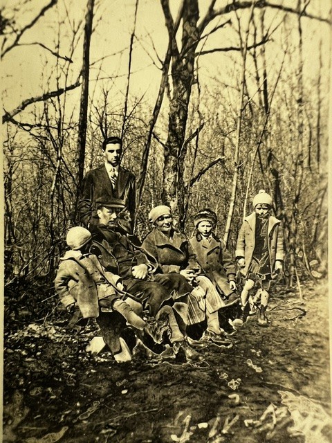Фото ч/б, групове. Станіслав Ліпінський (другий зліва) з колегами за столом. Сімнадцять осіб (16 чоловіків, 1 жінка) сидять за столом, вкритим білою скатертиною, на столі -- вази з квітами та столові прибори. Чоловіки у костюмах, сорочках з краватками, жінка у блузці та спідниці. Фон -- виноградники, високі дерева.