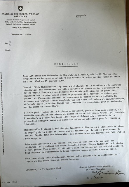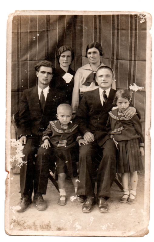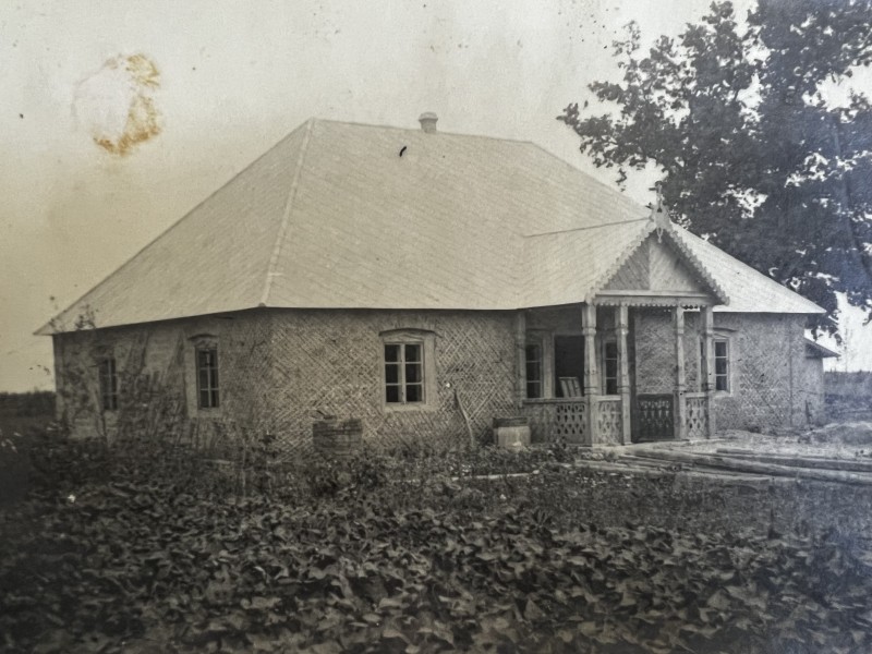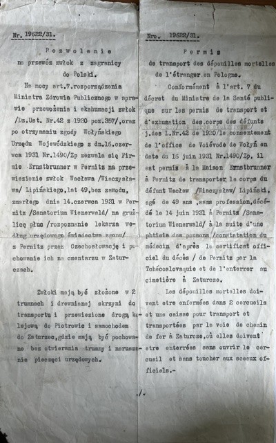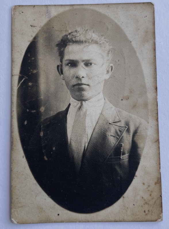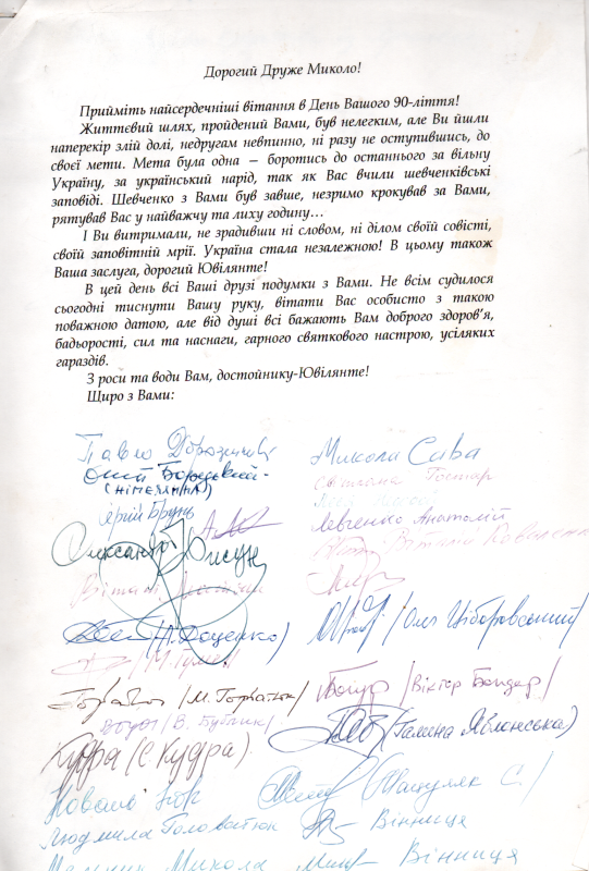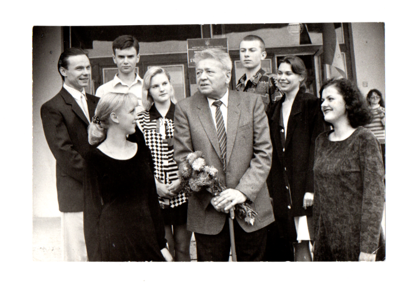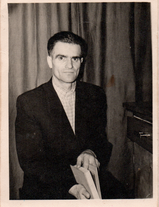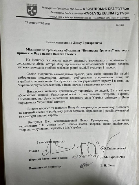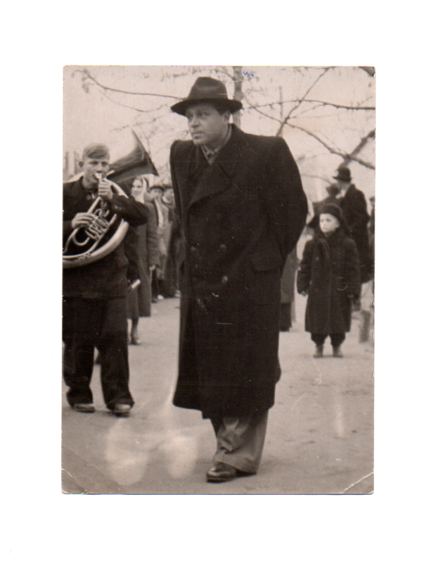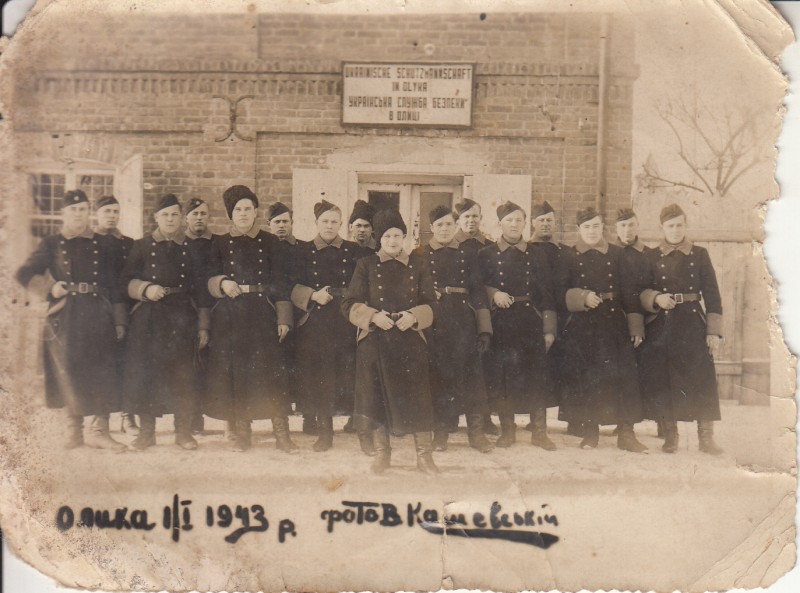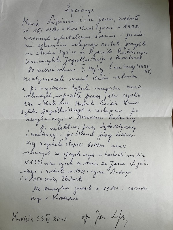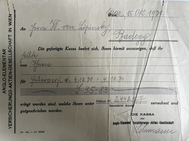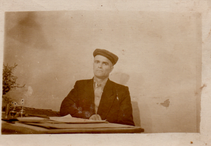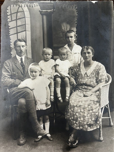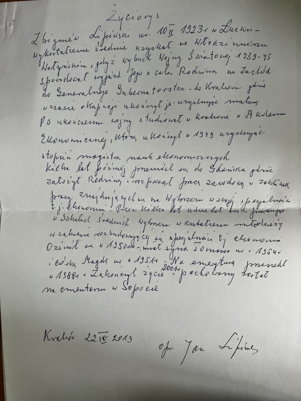 Фото ч/б, групове. Станіслав Ліпінський (другий зліва) з колегами за столом. Сімнадцять осіб (16 чоловіків, 1 жінка) сидять за столом, вкритим білою скатертиною, на столі -- вази з квітами та столові прибори. Чоловіки у костюмах, сорочках з краватками, жінка у блузці та спідниці. Фон -- виноградники, високі дерева.