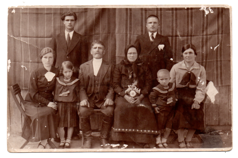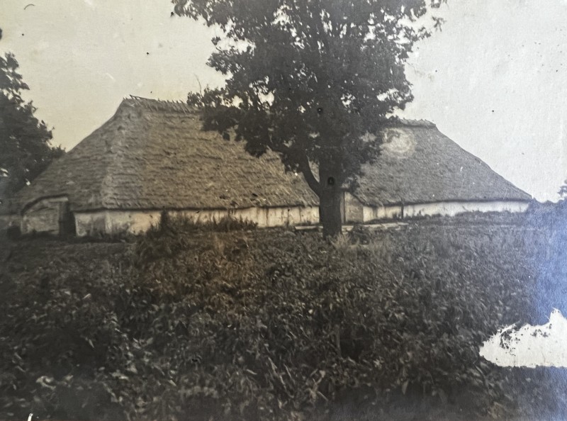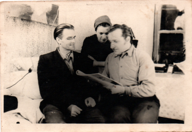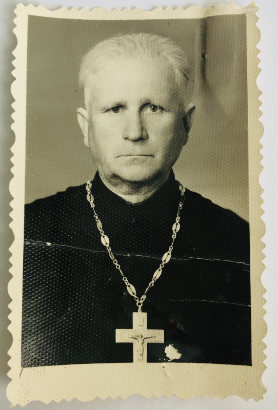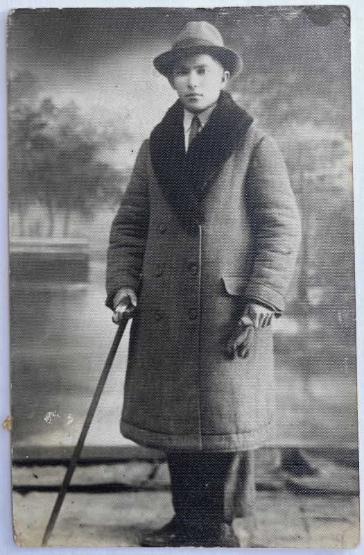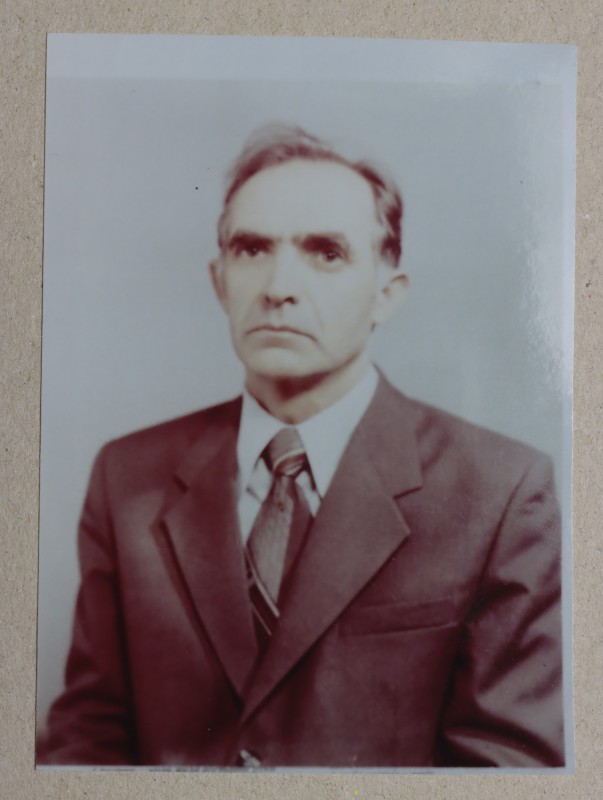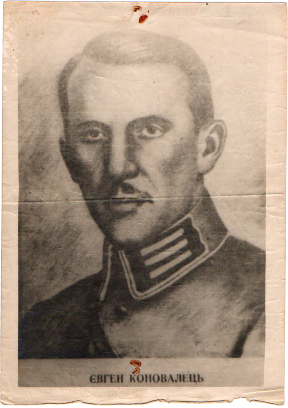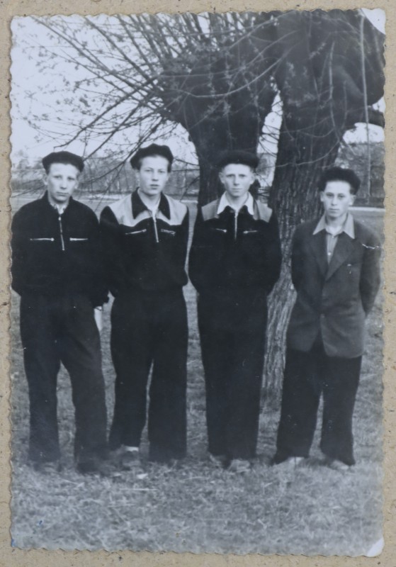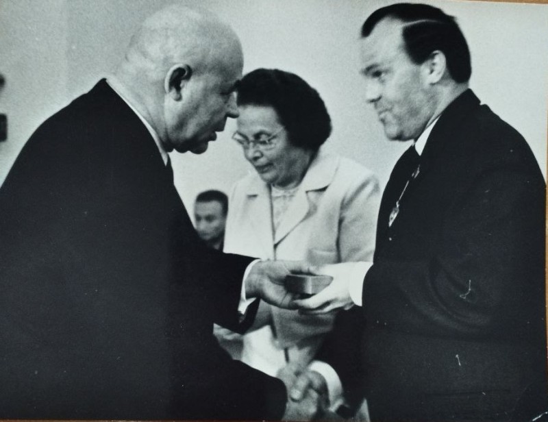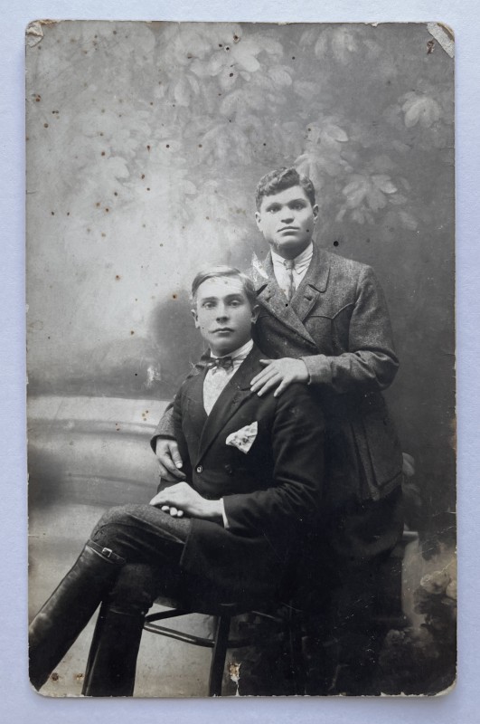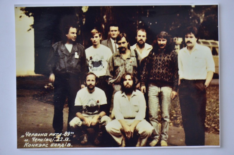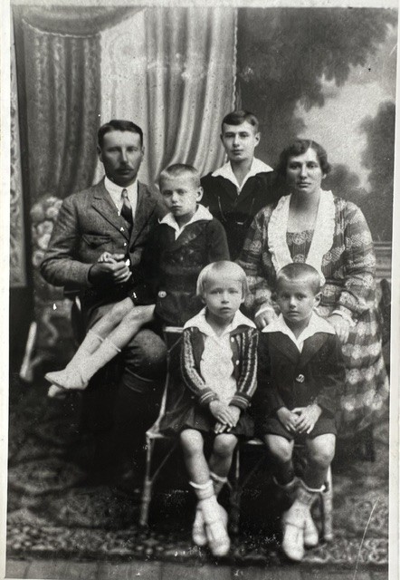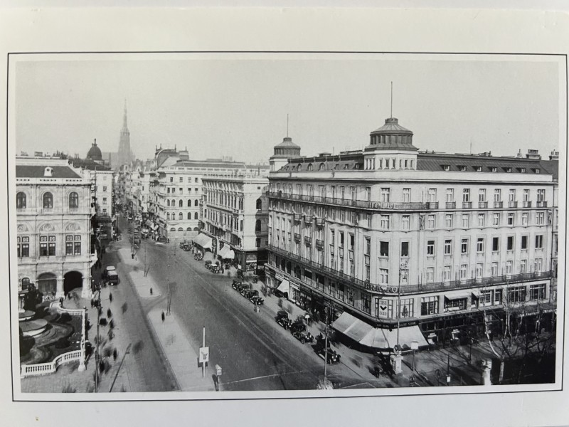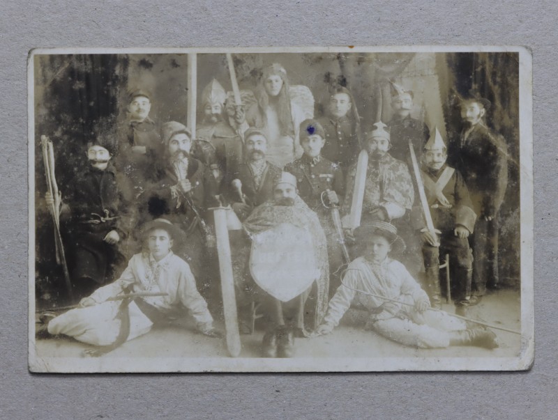 Фото ч/б, групове. Станіслав Ліпінський (другий зліва) з колегами за столом. Сімнадцять осіб (16 чоловіків, 1 жінка) сидять за столом, вкритим білою скатертиною, на столі -- вази з квітами та столові прибори. Чоловіки у костюмах, сорочках з краватками, жінка у блузці та спідниці. Фон -- виноградники, високі дерева.