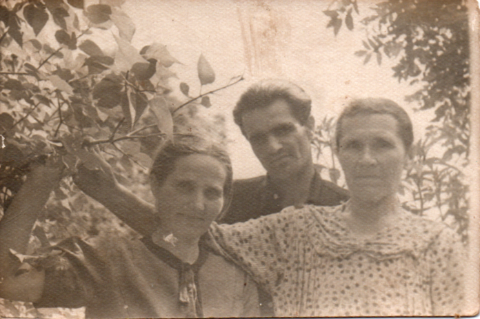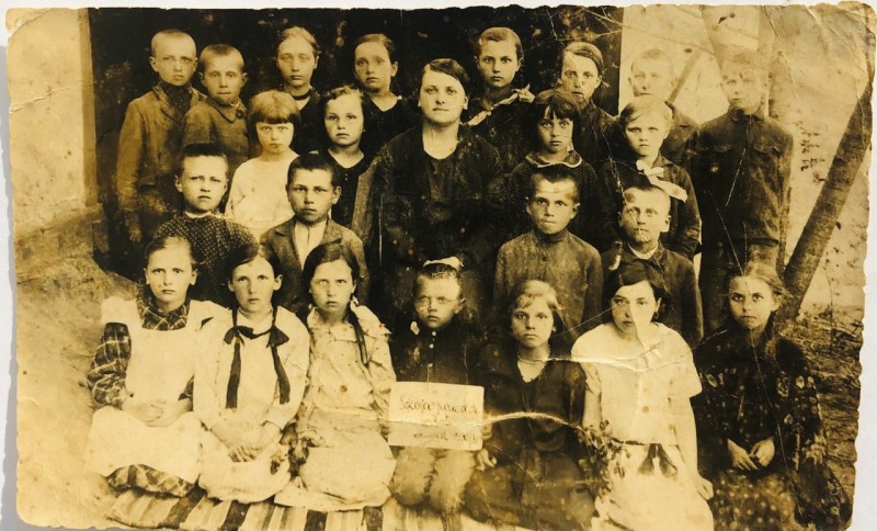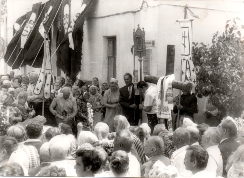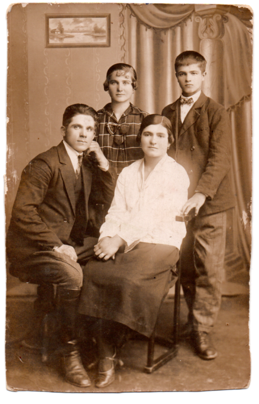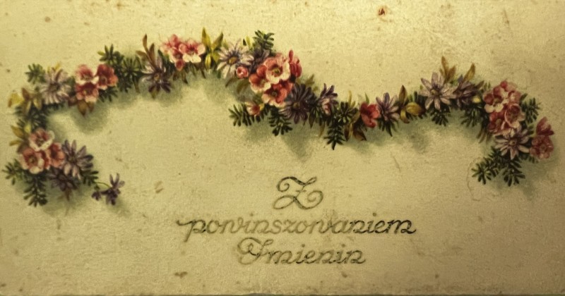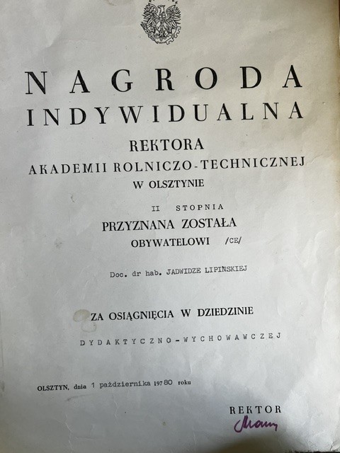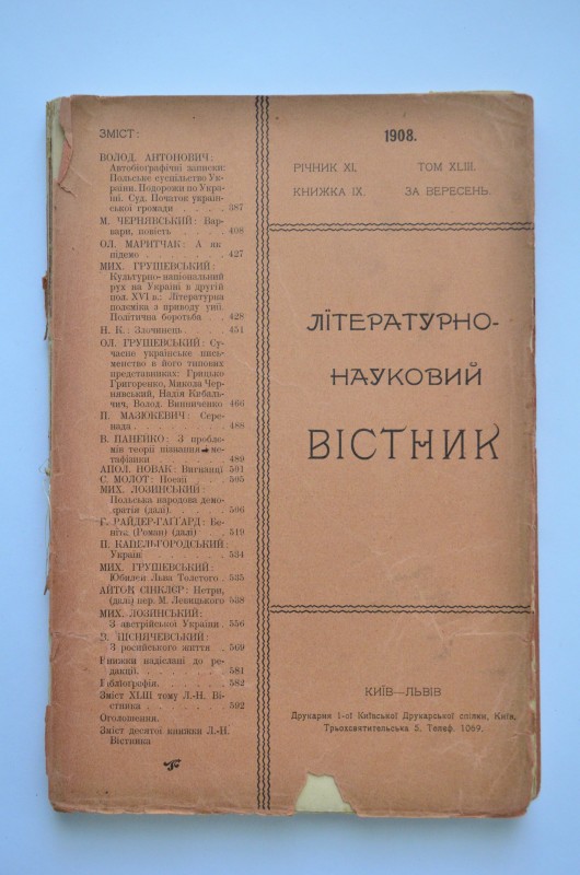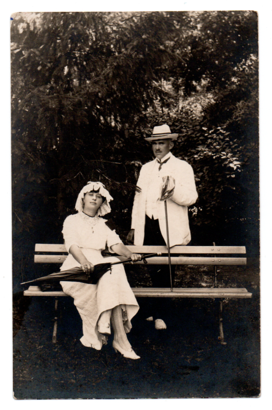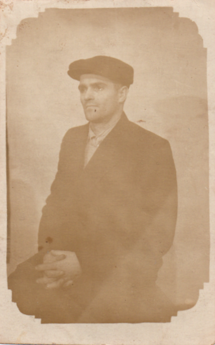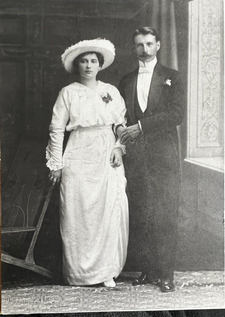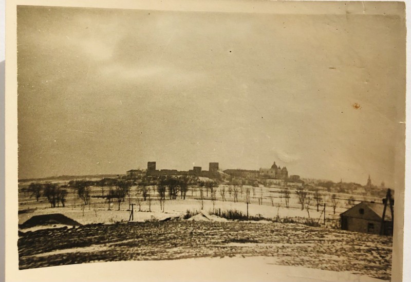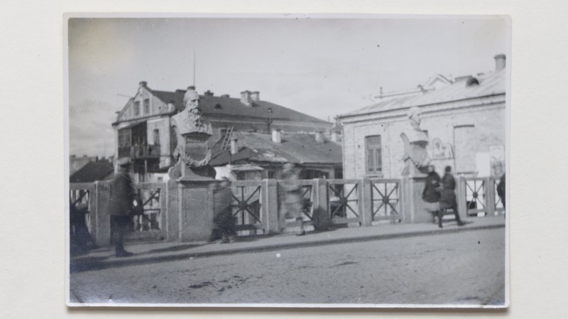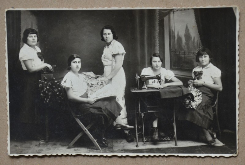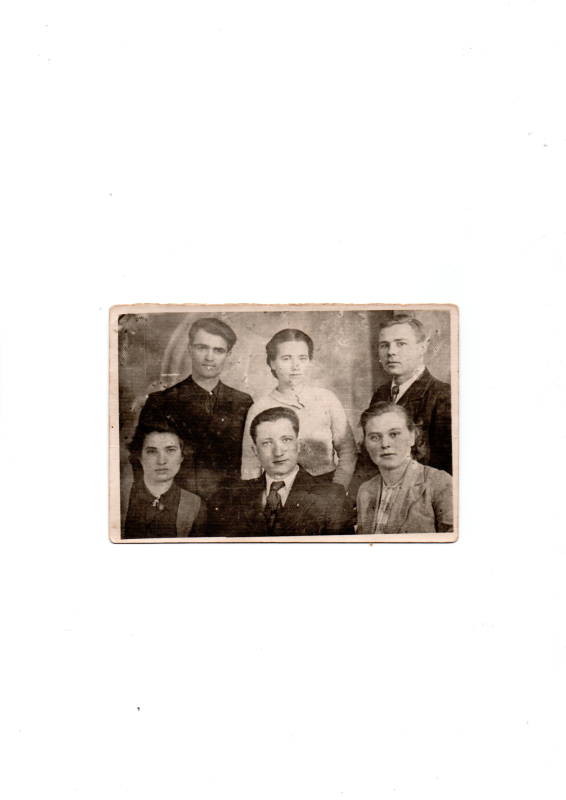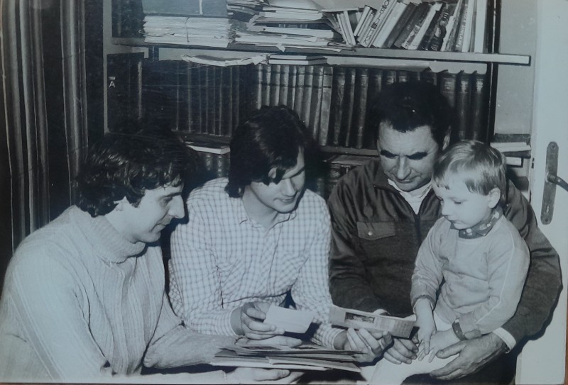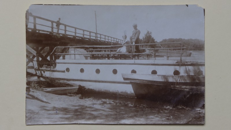 Фото ч/б, групове. Станіслав Ліпінський (другий зліва) з колегами за столом. Сімнадцять осіб (16 чоловіків, 1 жінка) сидять за столом, вкритим білою скатертиною, на столі -- вази з квітами та столові прибори. Чоловіки у костюмах, сорочках з краватками, жінка у блузці та спідниці. Фон -- виноградники, високі дерева.