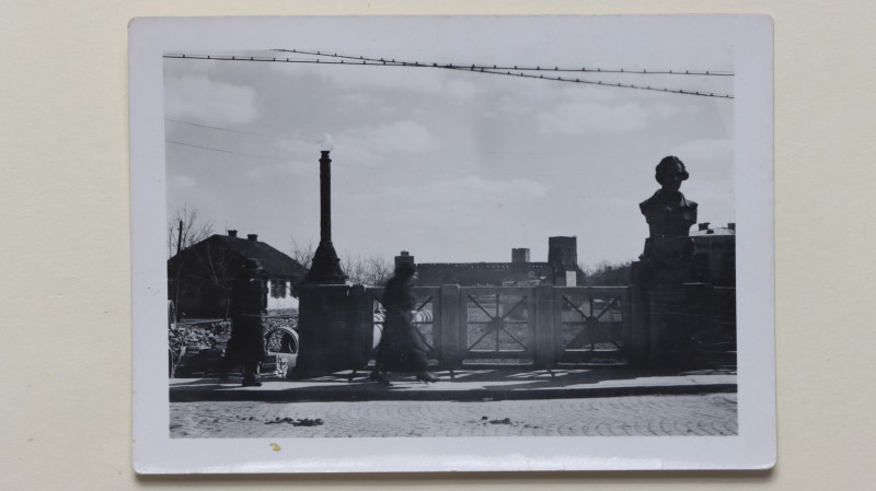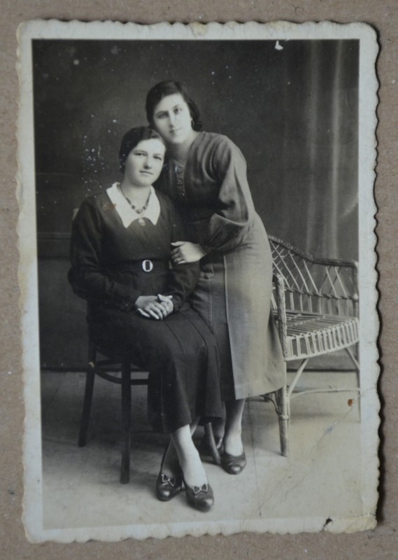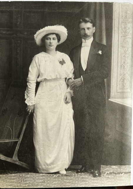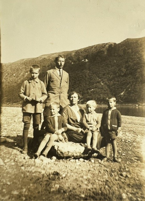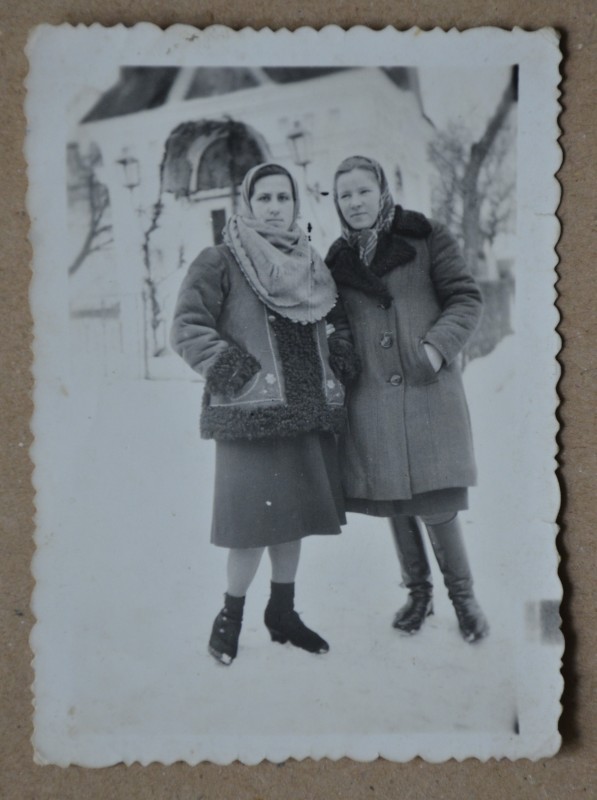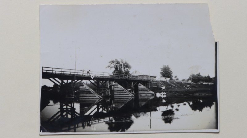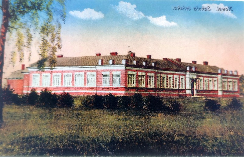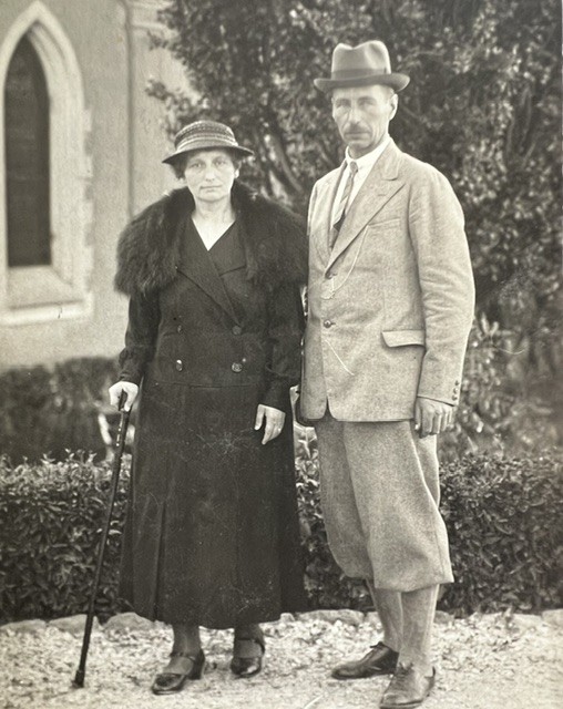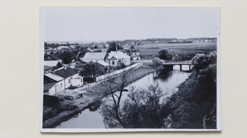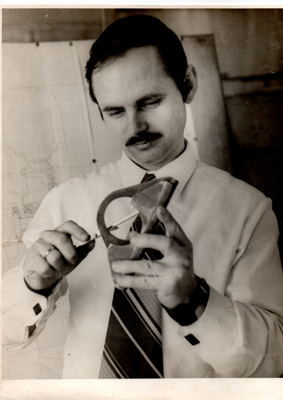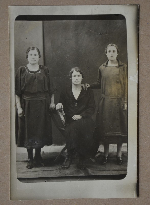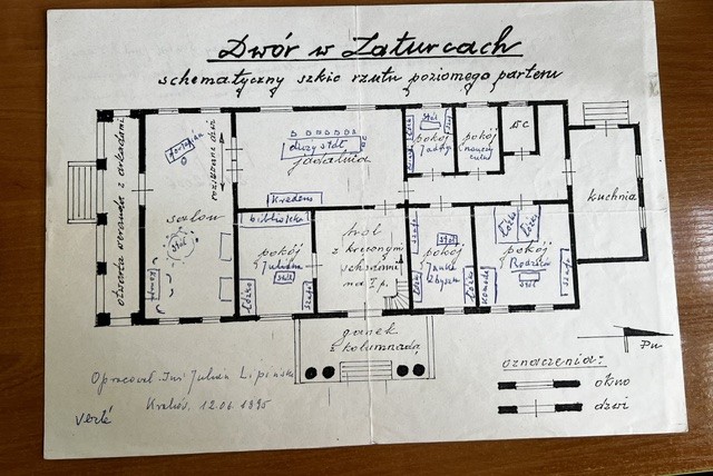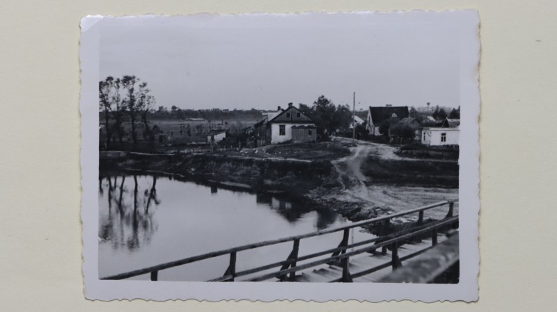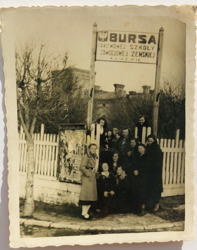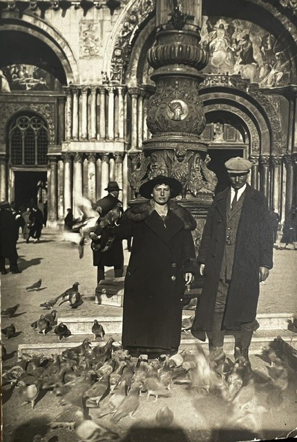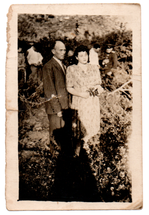 Фото ч/б, групове. Станіслав Ліпінський (другий зліва) з колегами за столом. Сімнадцять осіб (16 чоловіків, 1 жінка) сидять за столом, вкритим білою скатертиною, на столі -- вази з квітами та столові прибори. Чоловіки у костюмах, сорочках з краватками, жінка у блузці та спідниці. Фон -- виноградники, високі дерева.