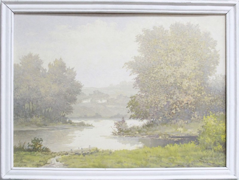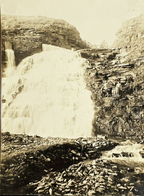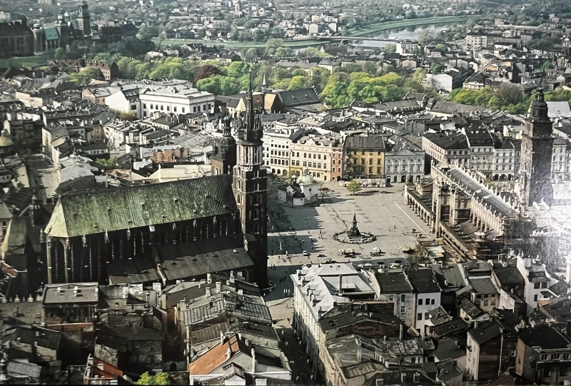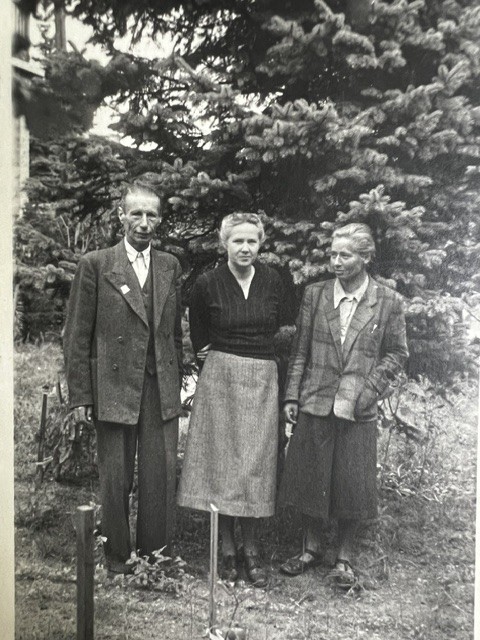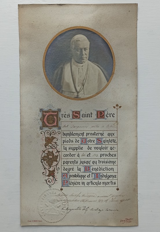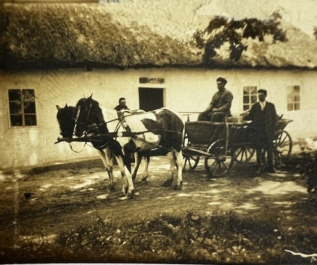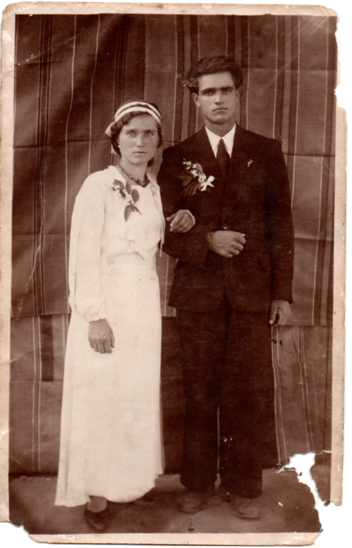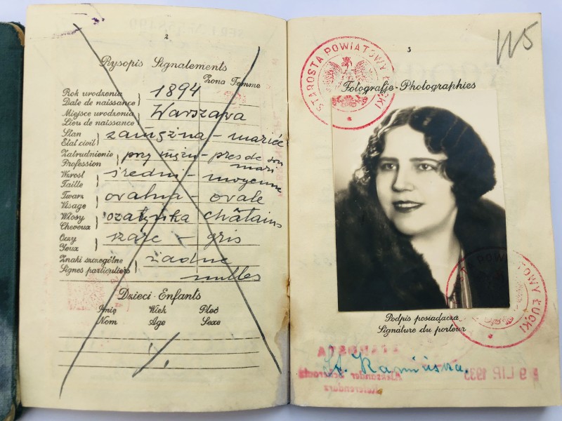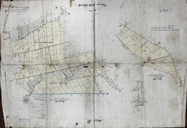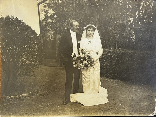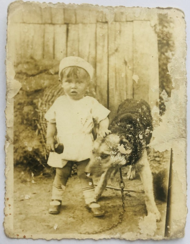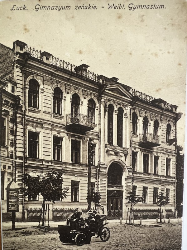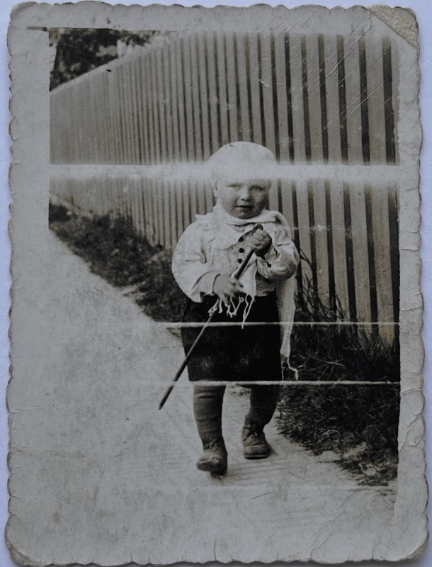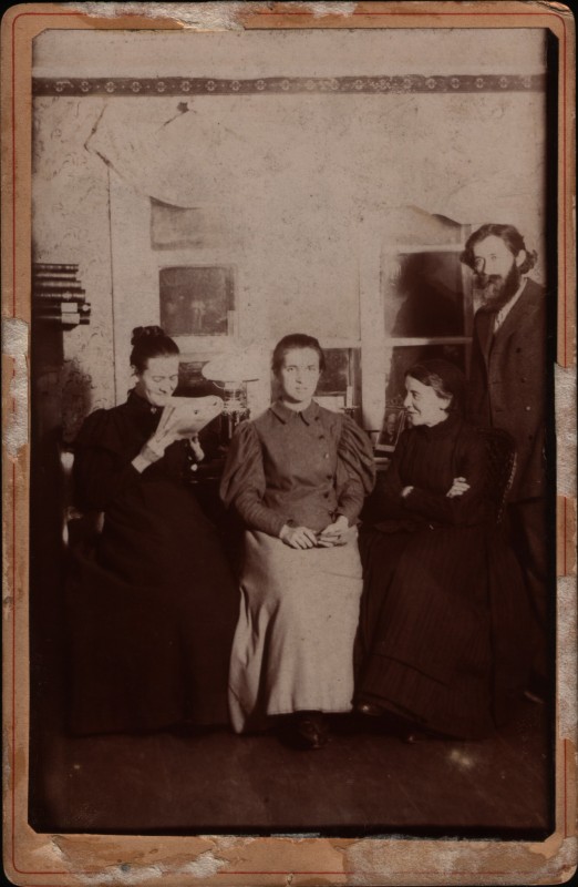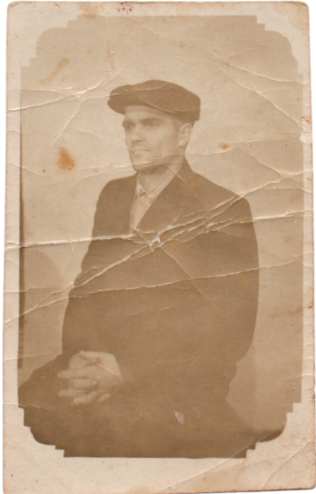 Фото ч/б, групове. Станіслав Ліпінський (другий зліва) з колегами за столом. Сімнадцять осіб (16 чоловіків, 1 жінка) сидять за столом, вкритим білою скатертиною, на столі -- вази з квітами та столові прибори. Чоловіки у костюмах, сорочках з краватками, жінка у блузці та спідниці. Фон -- виноградники, високі дерева.