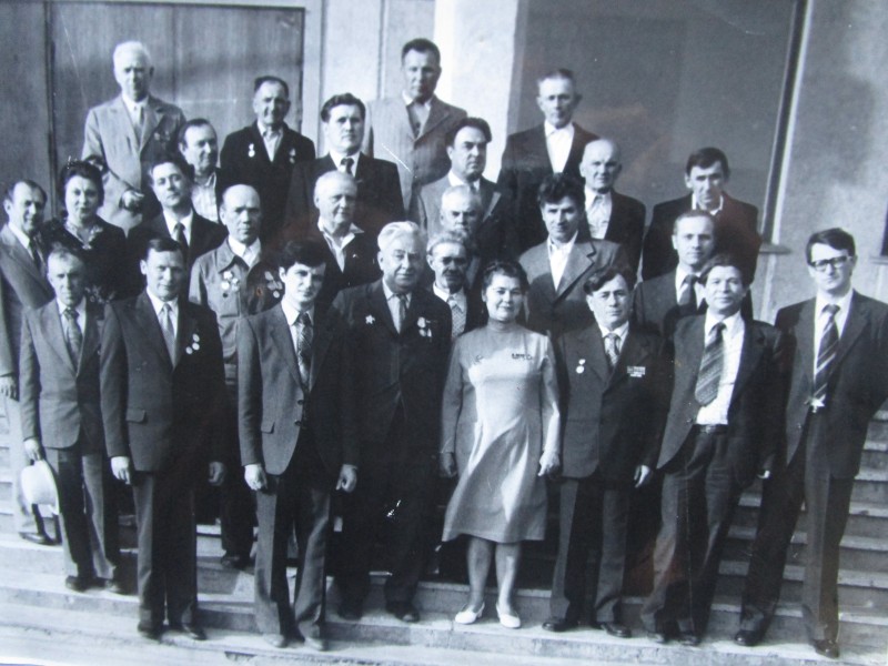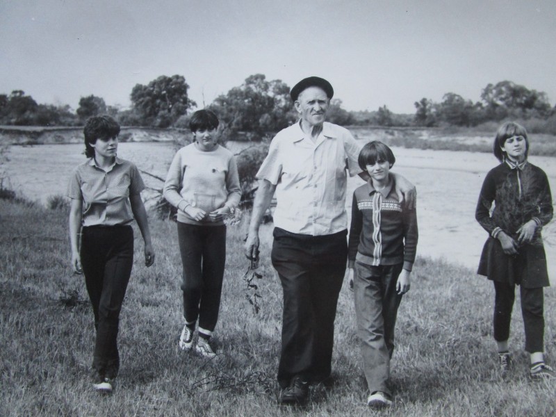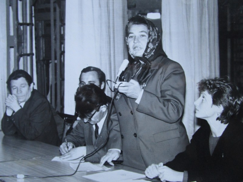 Семеренко Світлана Анатоліївна з кобилою Туєю. На фото жінка на повний зріст, стоїть боком, обличчям повернута до кобили, яку тримає за вуздечку. Одягнена у чорні штани і светр, волосся світле. Кобила темного кольору. На задньому плані біла цегляна стіна. Кінно-спортивний комплекс с. Халимоново, травень 1987 рік.