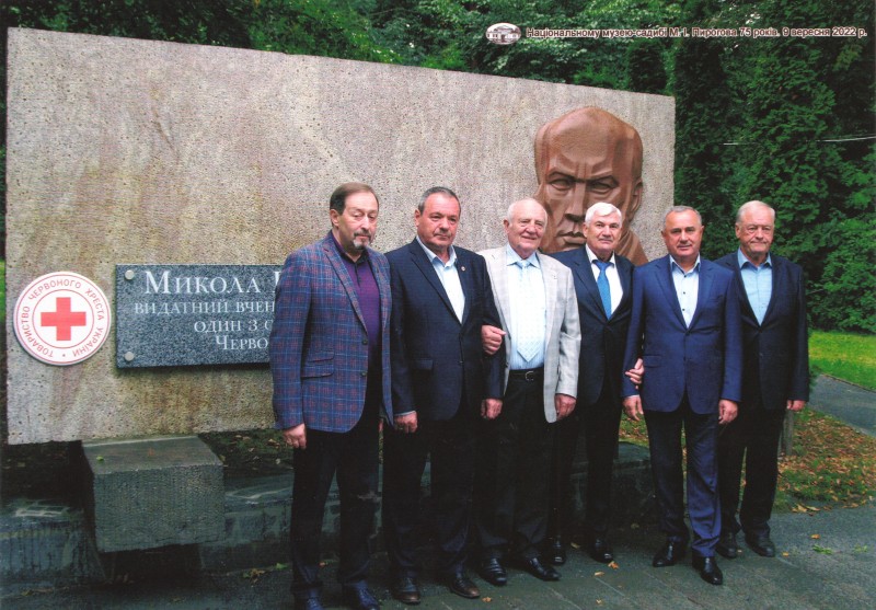 Фото документальне, кольорове, групове. Відображає промову з привітанням директорки закладу "Вінницький літературно-меморіальний музей М.М.Коцюбинського" Кравченко Лариси Василівни на урочистостях з нагоди 75-річчя Національного музею-садиби М.І.Пирогова 9 вересня 2022 року. На фото: актова зала Національного музею-садиби М.І.Пирогова; п'ять чоловіків та одна жінка стоять перед сценою. На першому плані: генеральний директор Національного музею-садиби М.І.Пирогова Турський Олександр Феодосійович (ліворуч; поворот вправо, профіль; руки опущені донизу); Кравченко Лариса Василівна (праворуч; 3/4 вліво, голова трохи нахилена до правого плеча; права рука зігнута в лікті - тримає вітальний адрес, ліва рука опущена донизу - тримає подарунковий пакет). Серед інших: Федоришен Олександр Юрійович (другий чоловік справа; 1/4 вправо; руки опущені донизу - кисті з'єднані на рівні живота) - директор КЗ "Музей Вінниці"; Гула Сергій Анатолійович (перший чоловік справа; голова - анфас; руки опущені донизу - пальці схрещені нижче живота) - заступник директора КЗ "Музей Вінниці" з наукової роботи. Усі зображені на повний зріст. Актова зала обладнана сценою, на якій знаходиться стіл президії, фортепіано, акустична система, ноутбук. Біля стола президії стоїть портрет О.Даїна, подарований музею. Сцена прикрашена червоними квітами з зеленим листям. На фото зверху зліва нанесено логотип музею та підтекстівку шрифтом коричневого кольору: "Національному музею-садибі М.І.Пирогова 75 років. 9 вересня 2022 р.". Фото надруковано на струменевому кольоровому фотопринтері "Epson Stylus Photo PX660" на матовому фотопапері формату А-5.