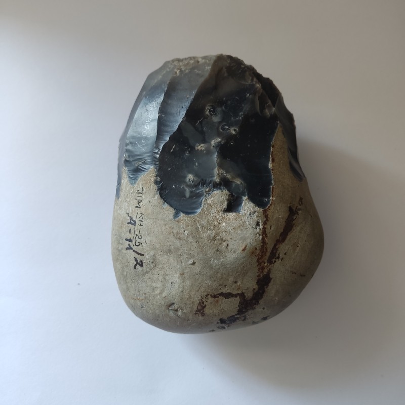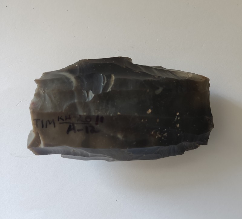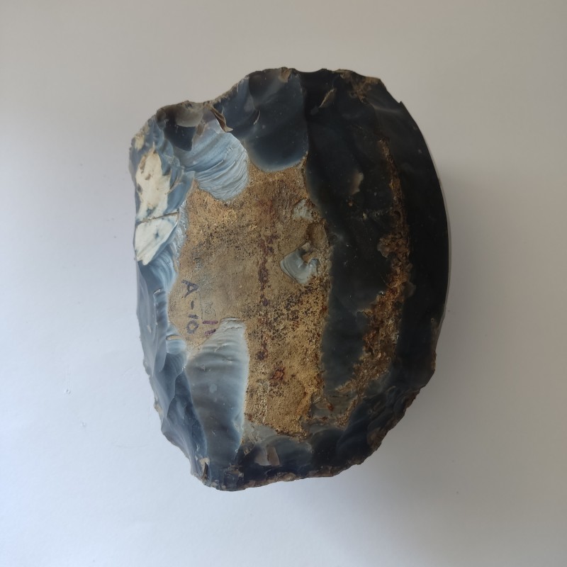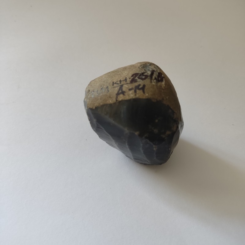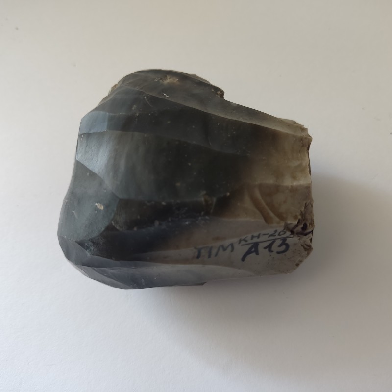 Гостроконечник. Крем'яне знаряддя праці з загостреними кінцями та краями, що використовувалося як мисливський ніж або спис. Вкритий патиною сіро-голубуватого кольору