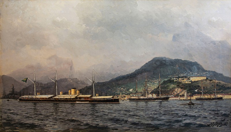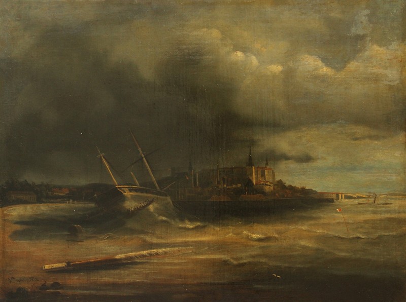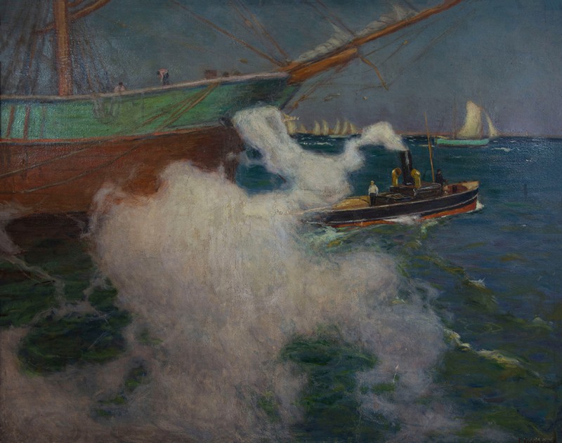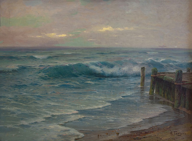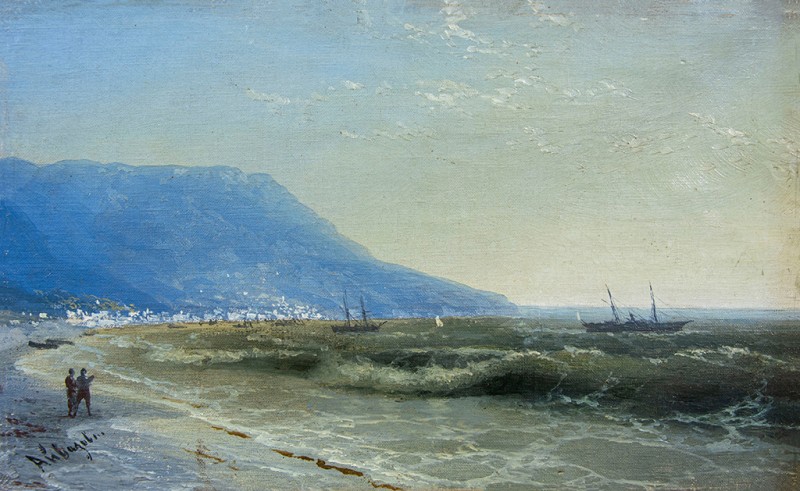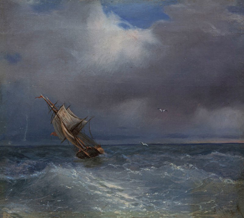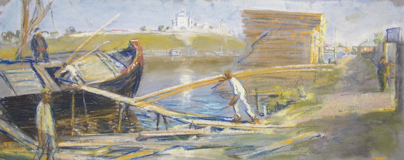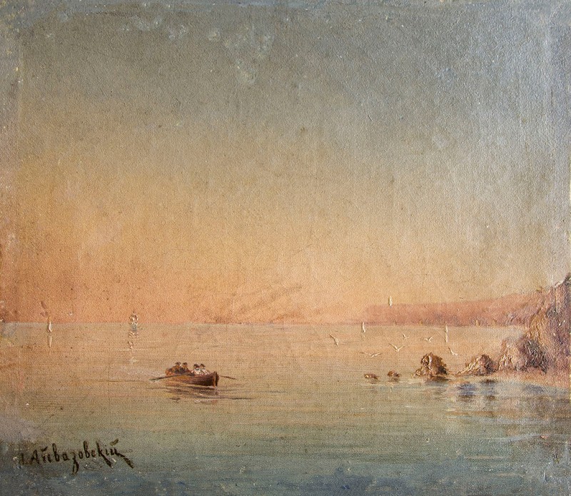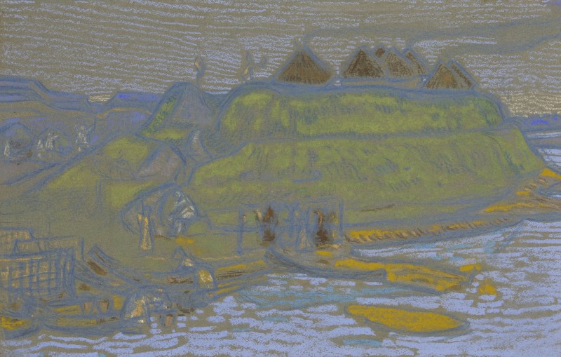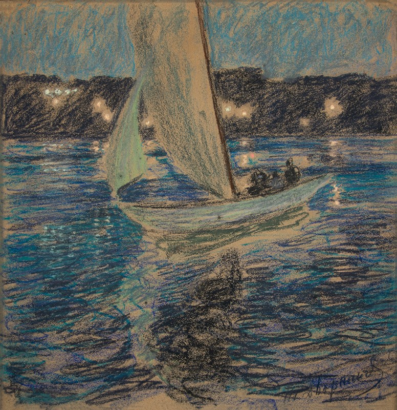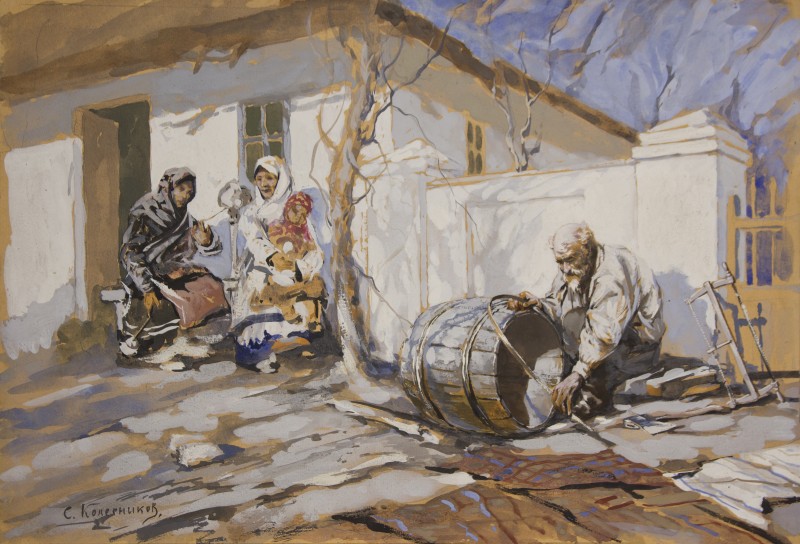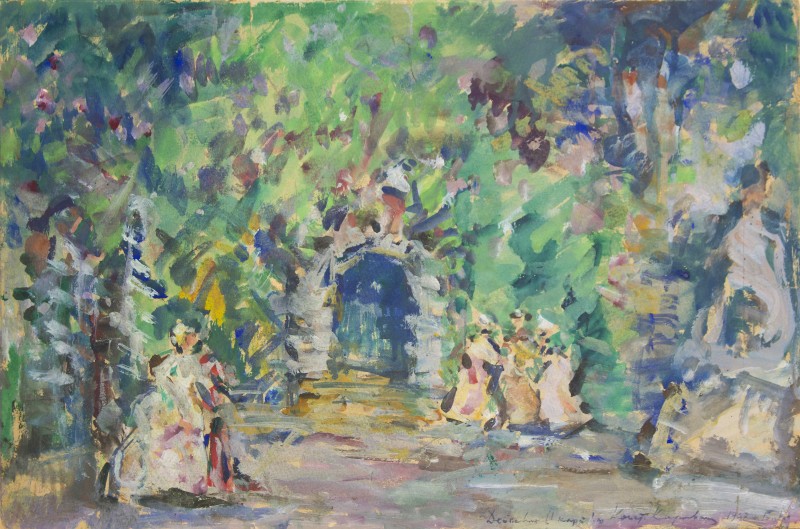 По центру листа на гойдалках, які підняті по діагоналі вверх вправо зображені п'ять фігур. Зліва дві фігури в помаранчевому одязі, справа - три. Внизу під гойдалками синє-зелені купи дерев, справа в далечині - домівка і дерева. Небо блідо-блакитне з білими хмаринками. Справа внизу олівцем: Н. Ульян 1903
