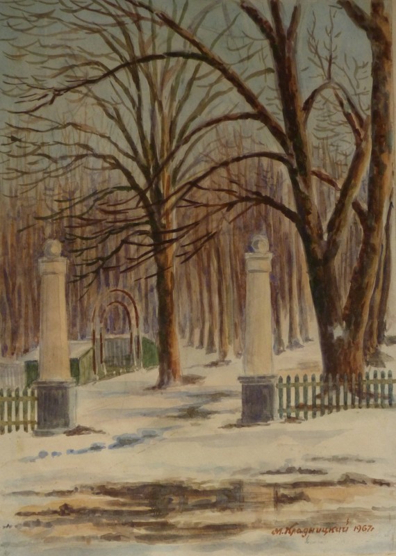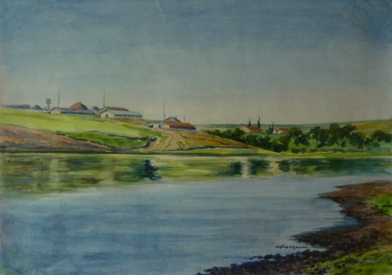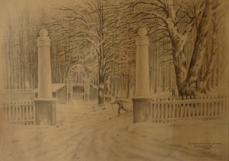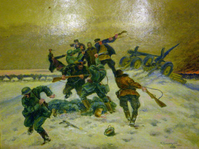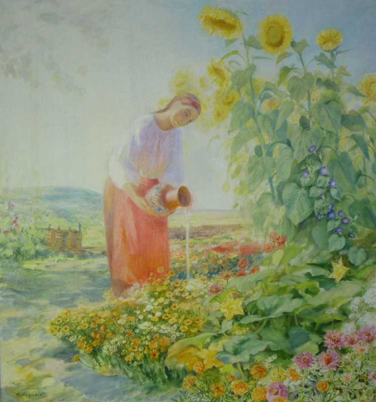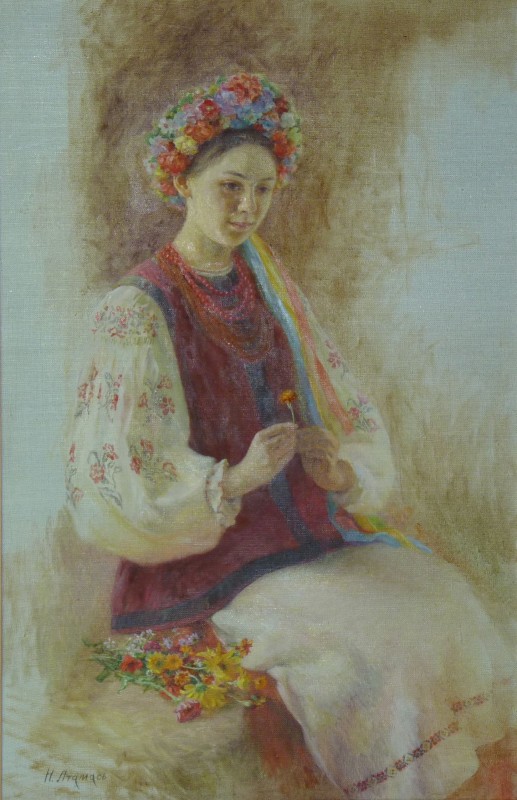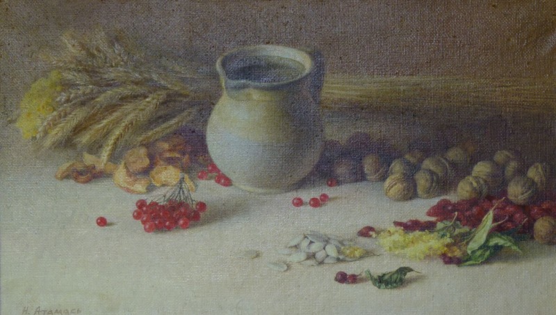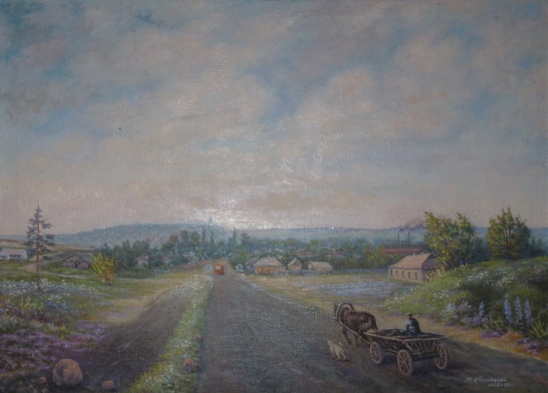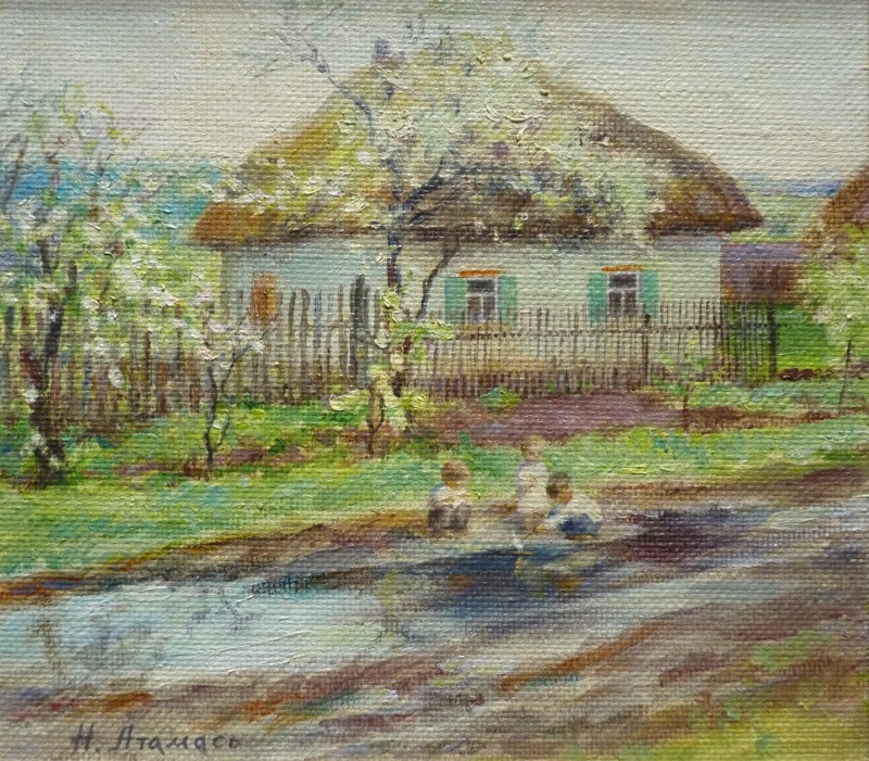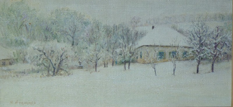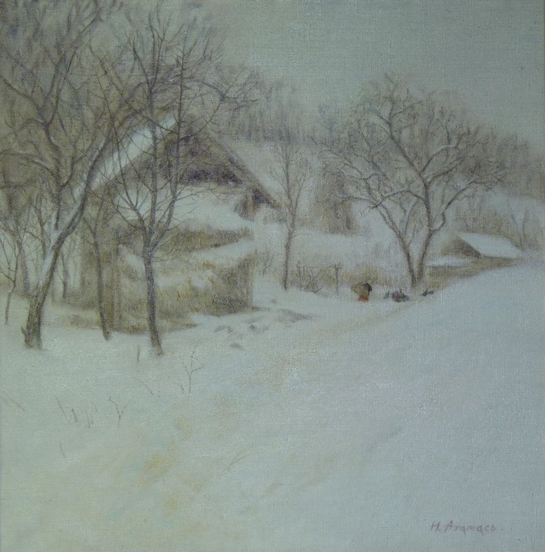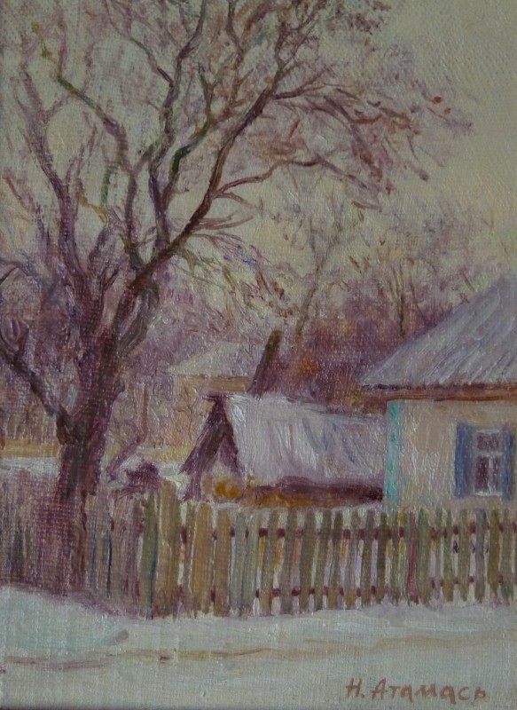 Зображення кольорове (домінують відтінки сірого, коричневого та білого кольорів), вертикальне, виконане олійними фарбами на полотні. На картині змальовано пейзаж зимового села. На передньому плані зображено дівчину, вдягнуту в кожух, вишиту сорочку, вишневу спідницю та червоний фартух, на голові жовта хустка, на ногах - коричневі чобітки. Дівчина несе на плечі коромисло з двома відрами. На другому плані - засніжені околиці села: безлисті дерева, плетені тини та глиняні хатки, вдалині на пагорбі видніється вітряк. В нижньому правому куті авторський підпис "Н.Атамась".