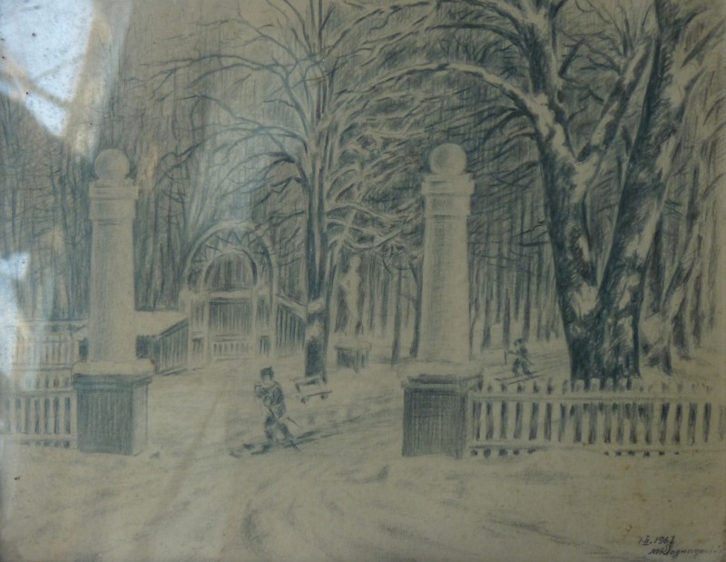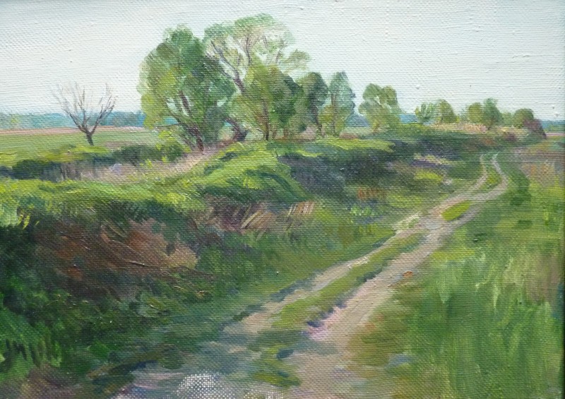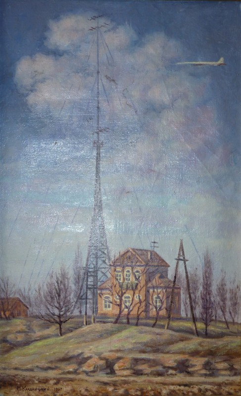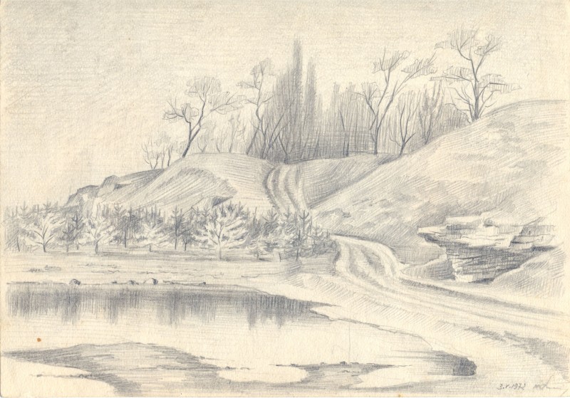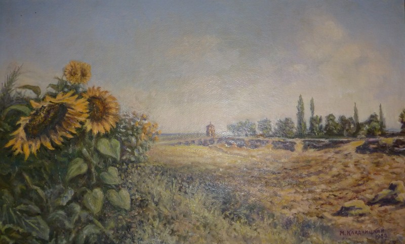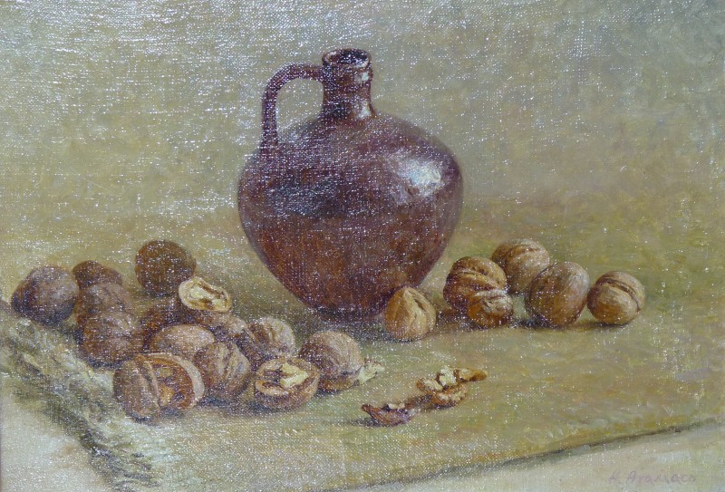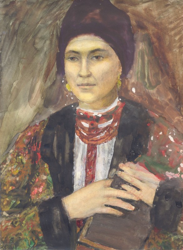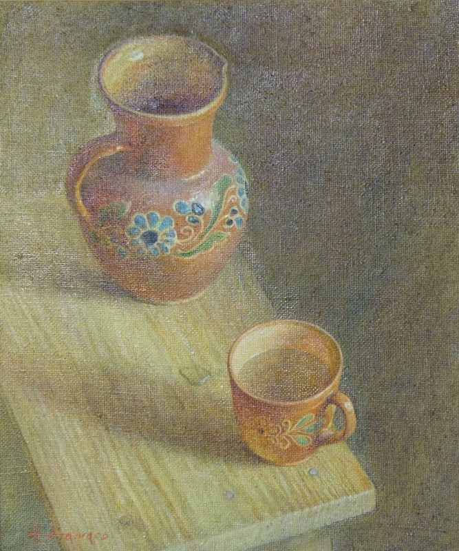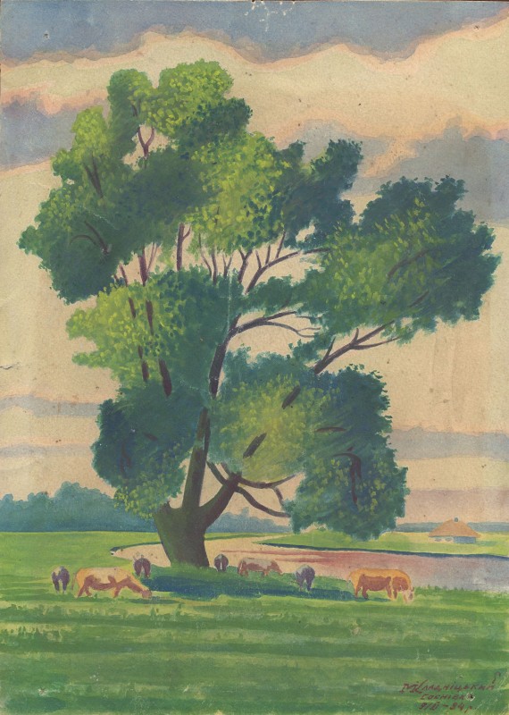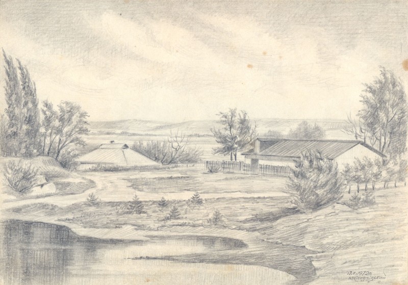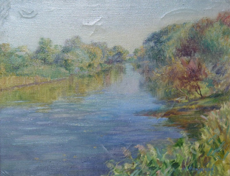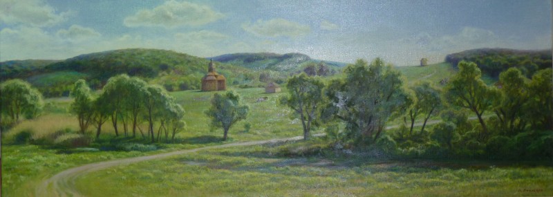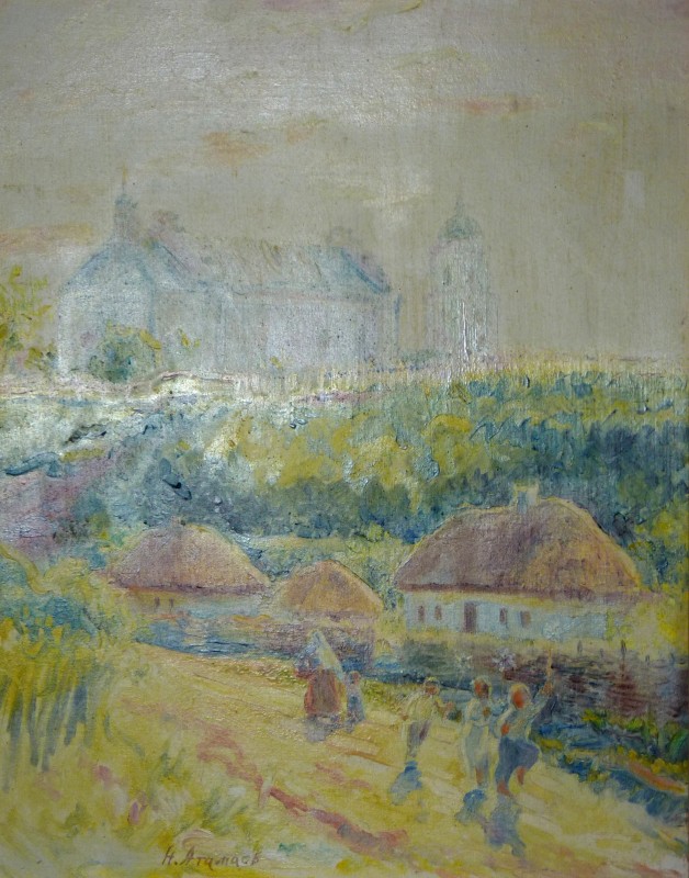 Зображення кольорове (домінують відтінки сірого, коричневого та білого кольорів), вертикальне, виконане олійними фарбами на полотні. На картині змальовано пейзаж зимового села. На передньому плані зображено дівчину, вдягнуту в кожух, вишиту сорочку, вишневу спідницю та червоний фартух, на голові жовта хустка, на ногах - коричневі чобітки. Дівчина несе на плечі коромисло з двома відрами. На другому плані - засніжені околиці села: безлисті дерева, плетені тини та глиняні хатки, вдалині на пагорбі видніється вітряк. В нижньому правому куті авторський підпис "Н.Атамась".