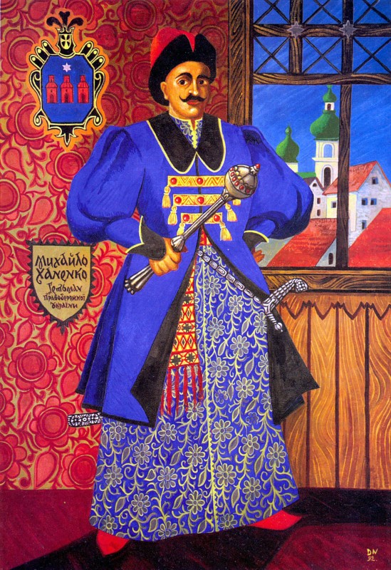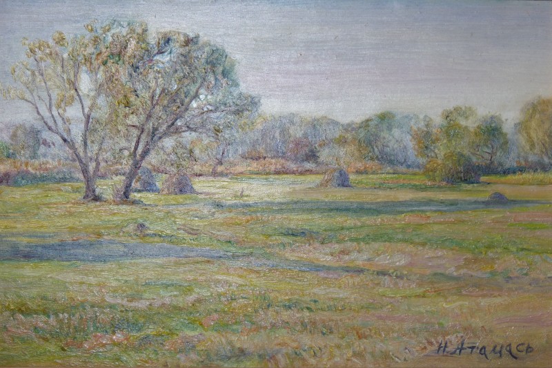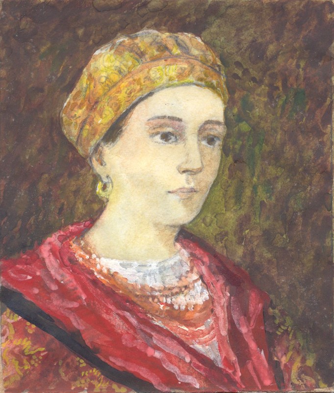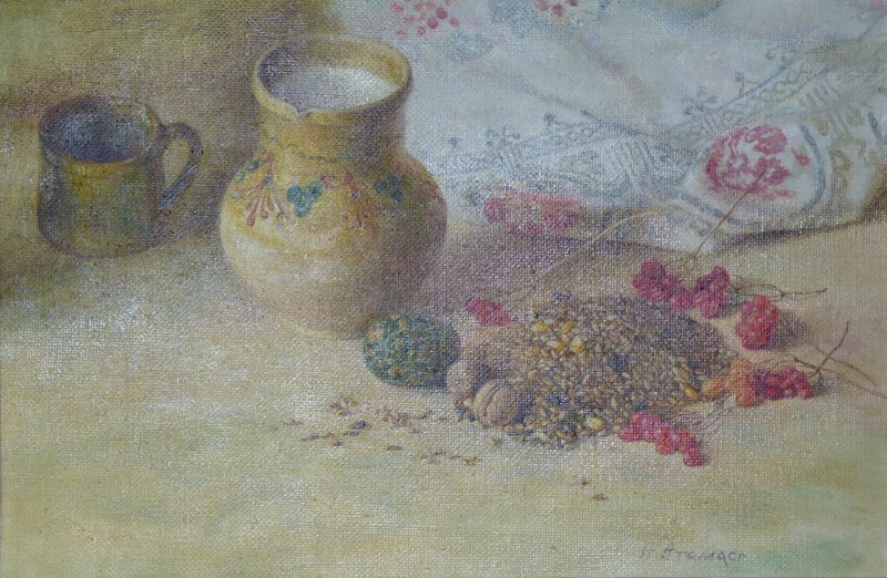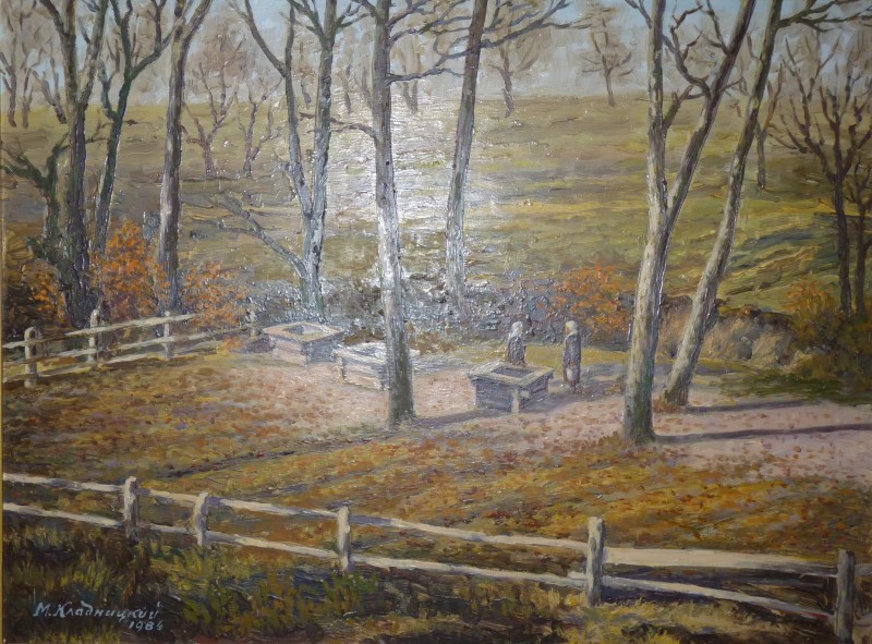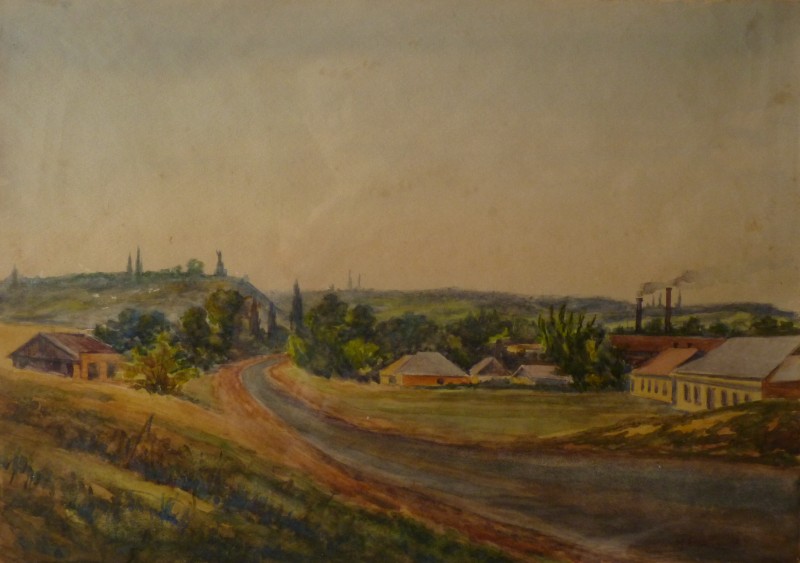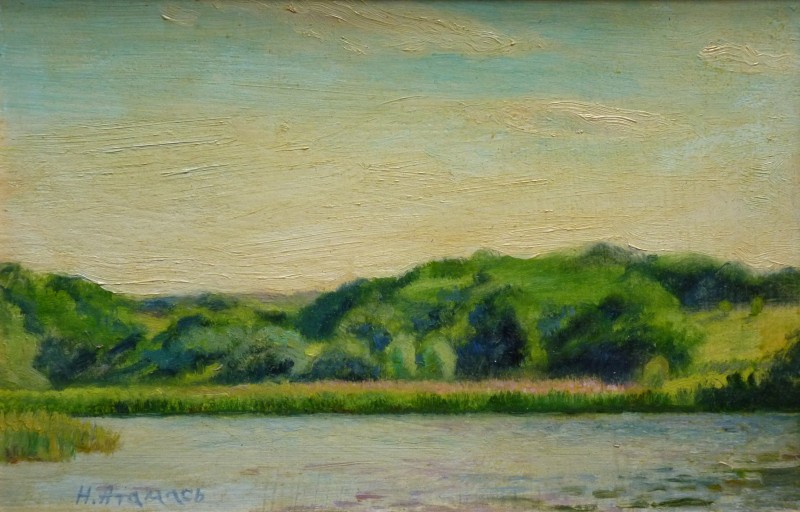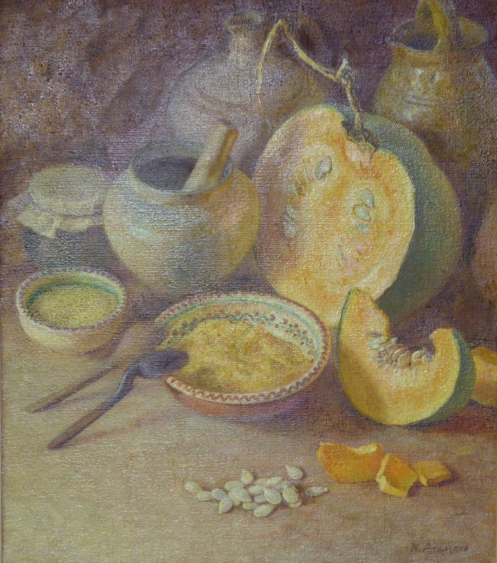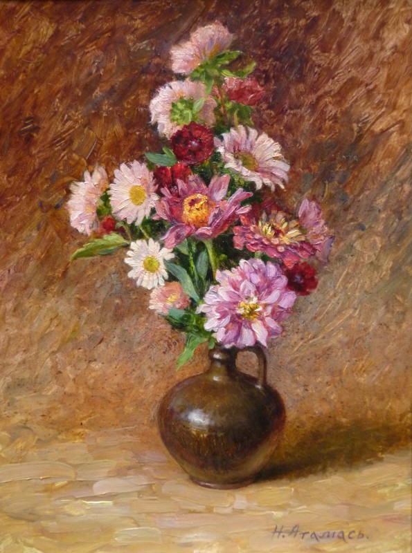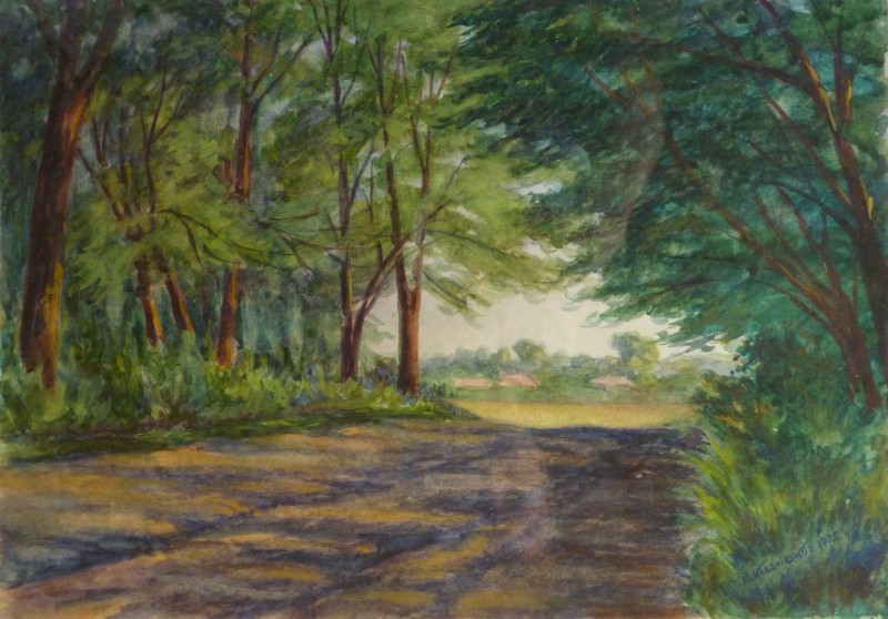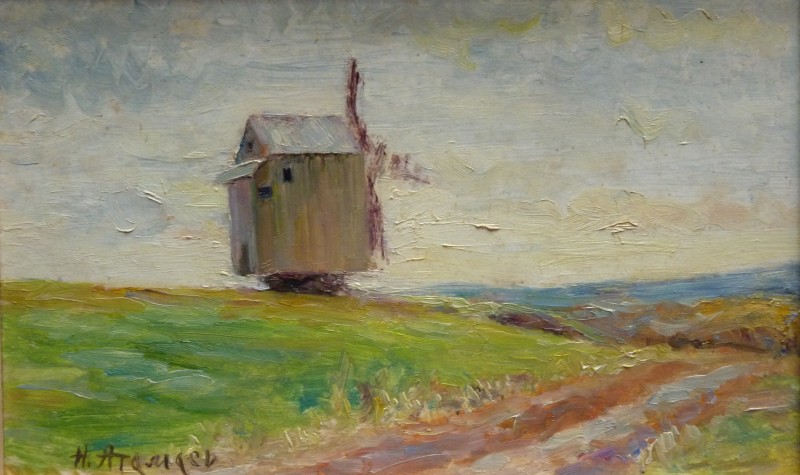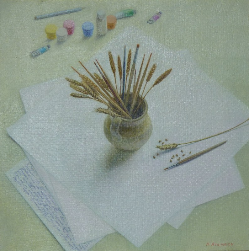Зображення кольорове (домінують відтінки сірого, коричневого та білого кольорів), вертикальне, виконане олійними фарбами на полотні. На картині змальовано пейзаж зимового села. На передньому плані зображено дівчину, вдягнуту в кожух, вишиту сорочку, вишневу спідницю та червоний фартух, на голові жовта хустка, на ногах - коричневі чобітки. Дівчина несе на плечі коромисло з двома відрами. На другому плані - засніжені околиці села: безлисті дерева, плетені тини та глиняні хатки, вдалині на пагорбі видніється вітряк. В нижньому правому куті авторський підпис "Н.Атамась".