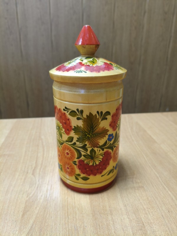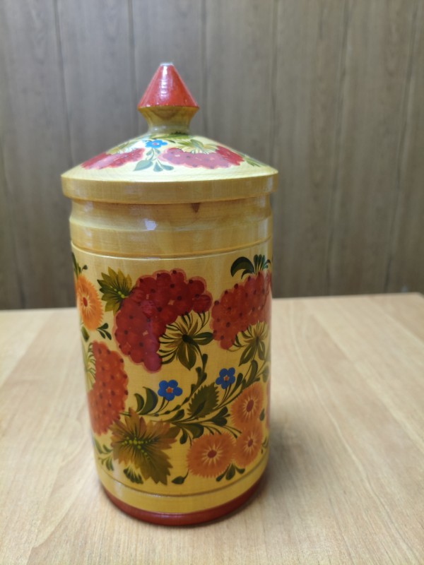 Ложка з довгою вигнутою ручкою, звуженою наприкінці. Прикрашена петриківським розписом. В середині основи намальовано букет з червоного кетягу калини, двох синіх квіток-ромашек, двох червоних ягід (велика і мала) та зеленого листя різних розмірів. Навколо букету, по верхньому краю основи, намальовано зелену ламану лінію. Зовні основа прикрашена букетом з двох кетягів калини, китиці порічок, синьої квітки-ромашки, дрібних червоних ягід та зеленого листя різних розмірів. Навколо, по краю основи - зелена ламана лінія. Вздовж центральної частини ручки, з лицьової сторони, розміщена композиція, в центрі якої - синя квітка-ромашка, по обидва боки від неї намальовано по два великих і кілька малих зелених листків, за ними по китиці червоних порічок і на завершення - по одиному зеленому листку з кожної сторони. Виготовлено на фабриці художніх виробів "Дружба» (пізніше «Петриківський розпис") 70-80-ті роки ХХ ст.