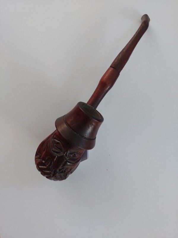 Люлька дерев'яна, малої форми, світло-коричневого кольору. Тютюнова камера бочечкоподібна, всередині металева. Має мундштук, який з'єднаний рухомо з чашечкою та закінчується канавкою загубника. Прикрашена люлька об'ємним різьбленням та стилізованими квіточками чорного кольору.