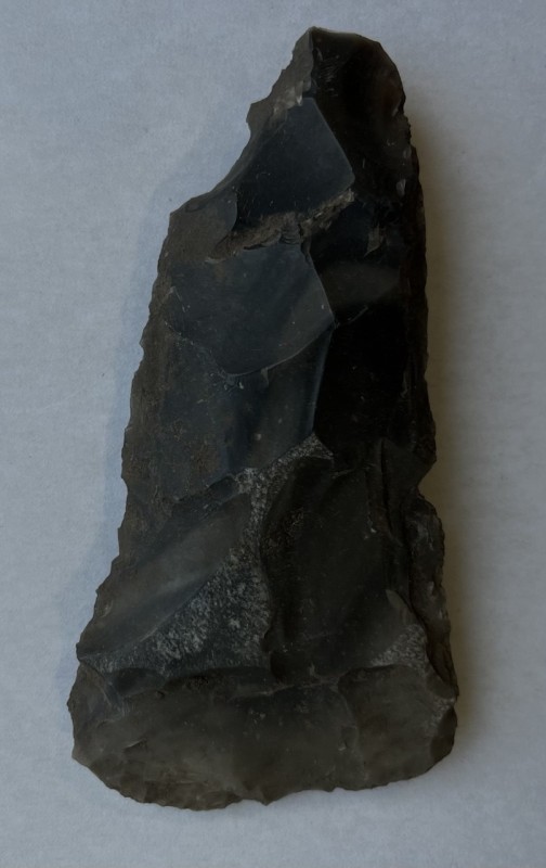 Крем’яна пластина неправильної трикутної форми. Виріб нагадує вістря та має світло- і темно-сіре непрозоре забарвлення. Пластина була сколота з нуклеуса, а краї додатково оброблені ретушшю для надання потрібної форми. Артефакт належить до неолітичної доби. Передав Г. В. Охріменко.