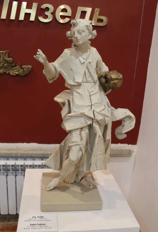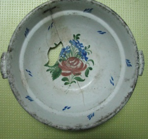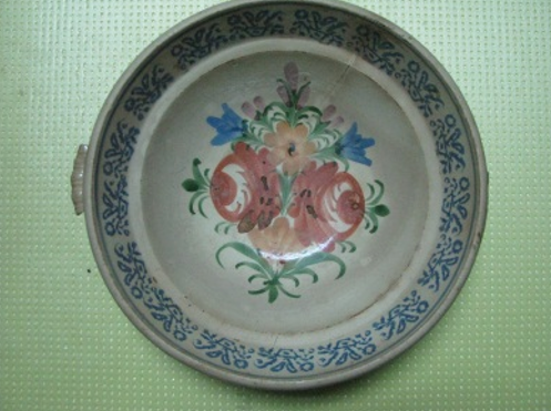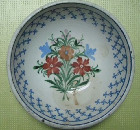 Миска фаянсова, глибока, бортики конічно розхилені, покрита білою глазур’ю. На дзеркалі дна бутоньєрка з квітів, під вінцями орнаментальна смуга синього кольору. Миска без вух. На дзеркалі дна бутоньєрка - в букеті виділяються дві червоні трояндочки і три блакитні. Під вінцями синя гірлянда. На дні клеймо «Lubycza кrо». Фаянс, ручний розпис, полива, штамп. Кінець XIX - поч. XX ст.