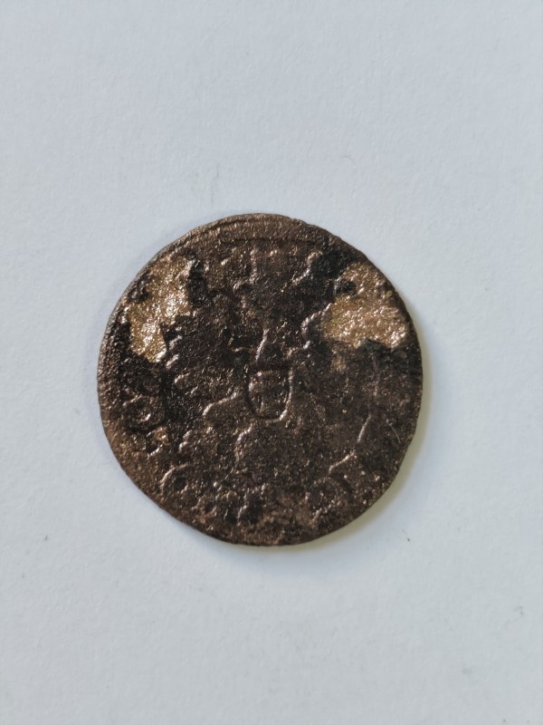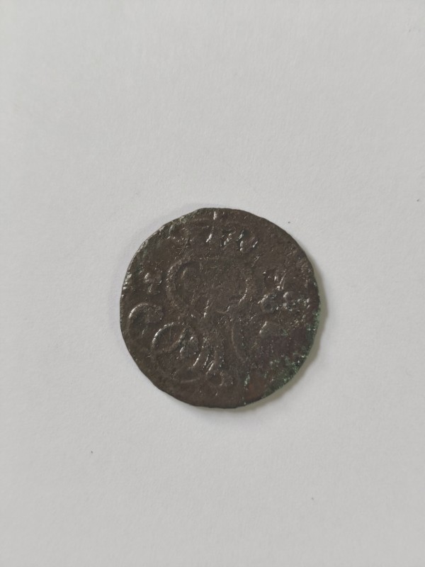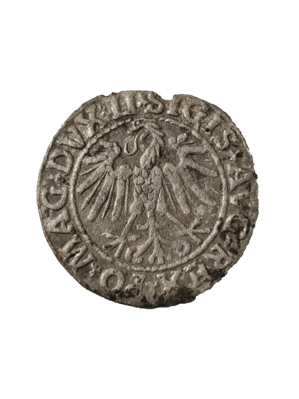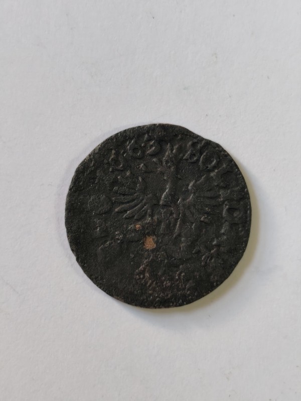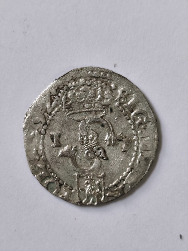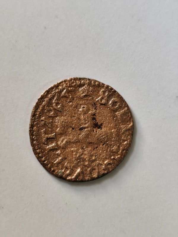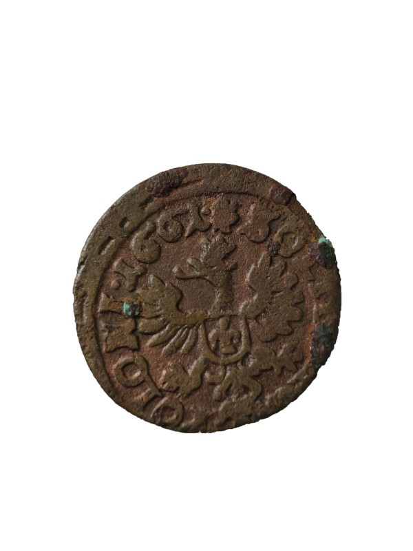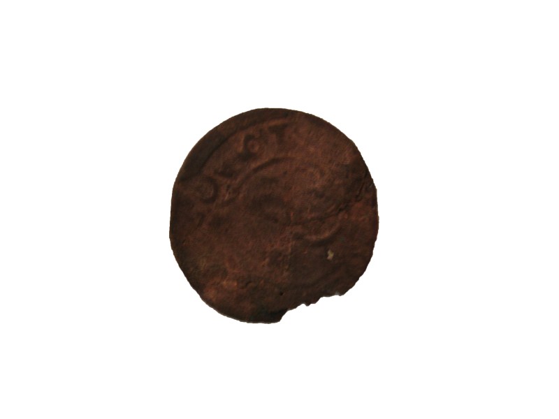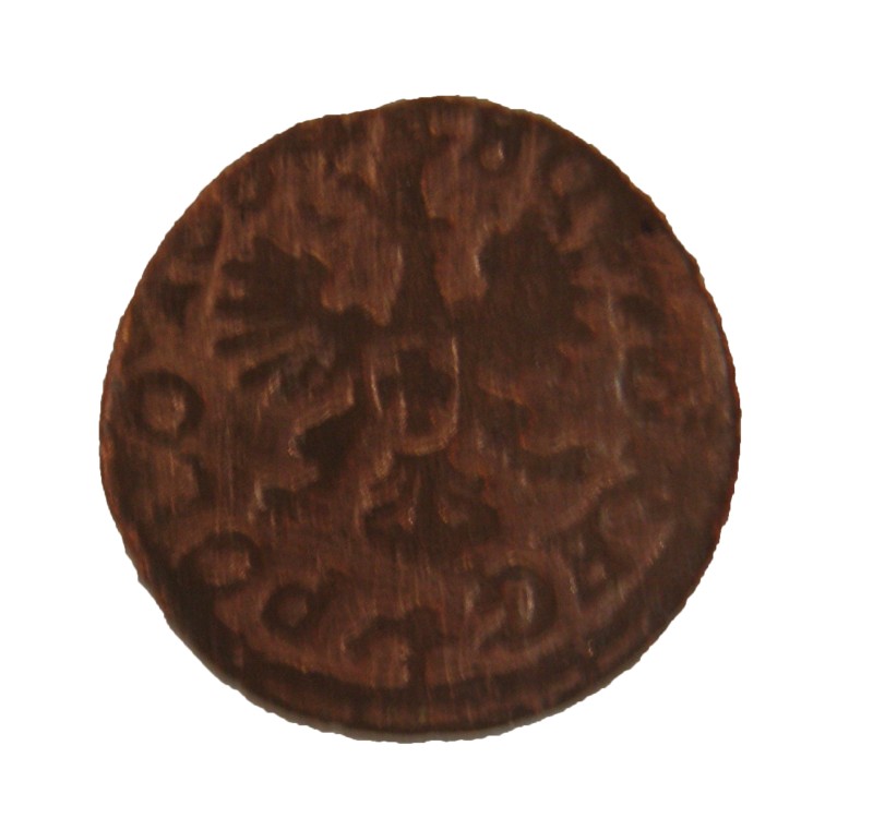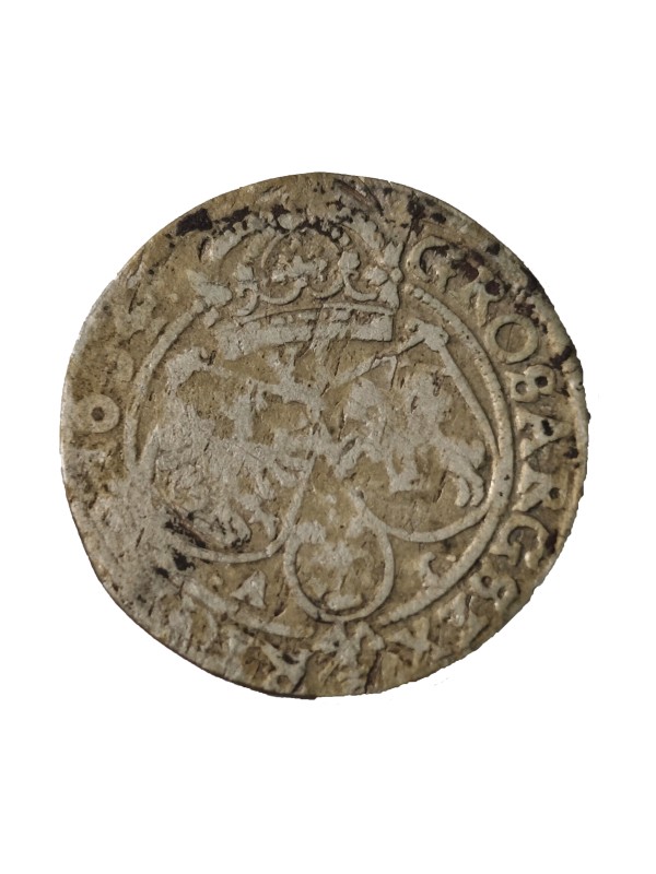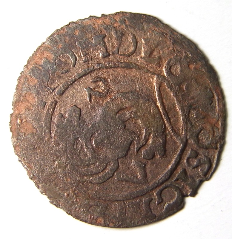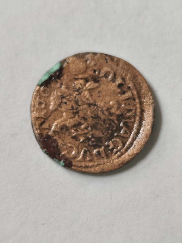 Монета круглої форми - боратинка. Аверс монети стертий, зображення і легенда монети не простежується. Реверс монети - зображено герб Погоня (вершник на коні із мечем у руках). Навколо частково прочитується легенда монети "CO...G LI..."