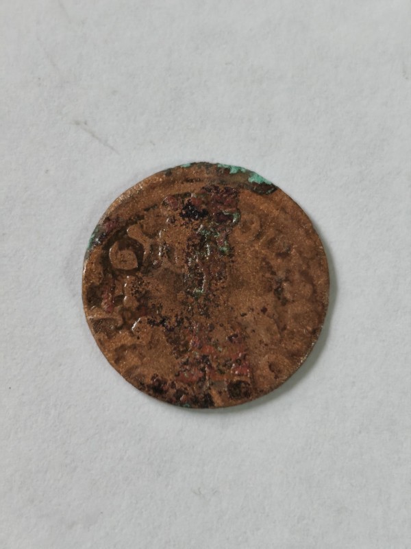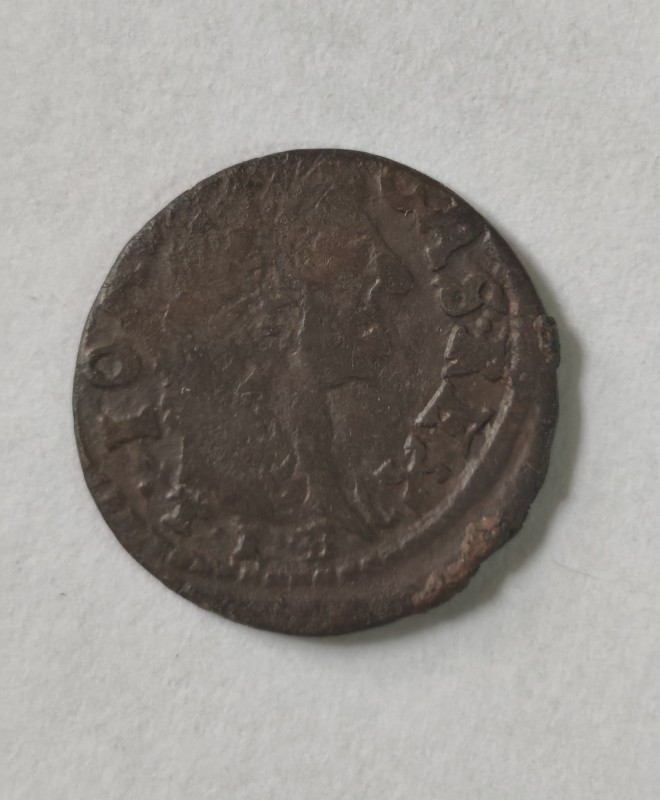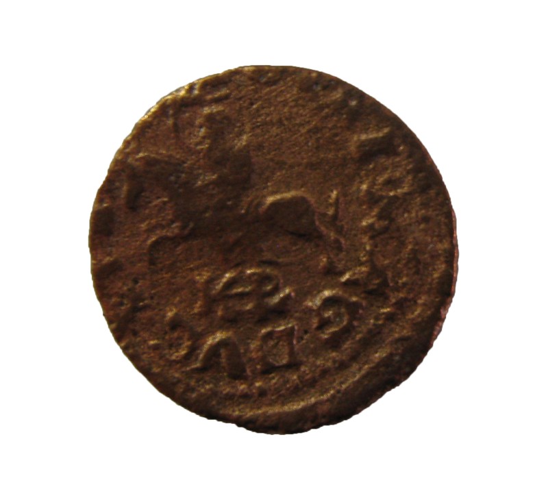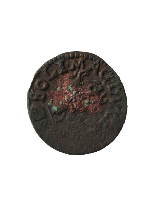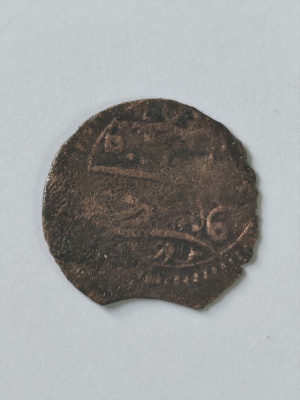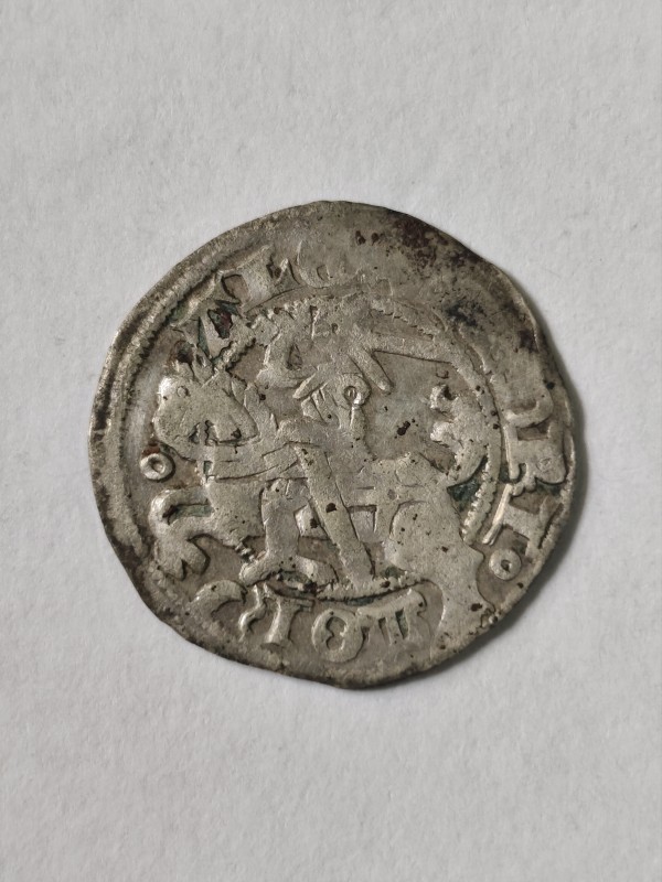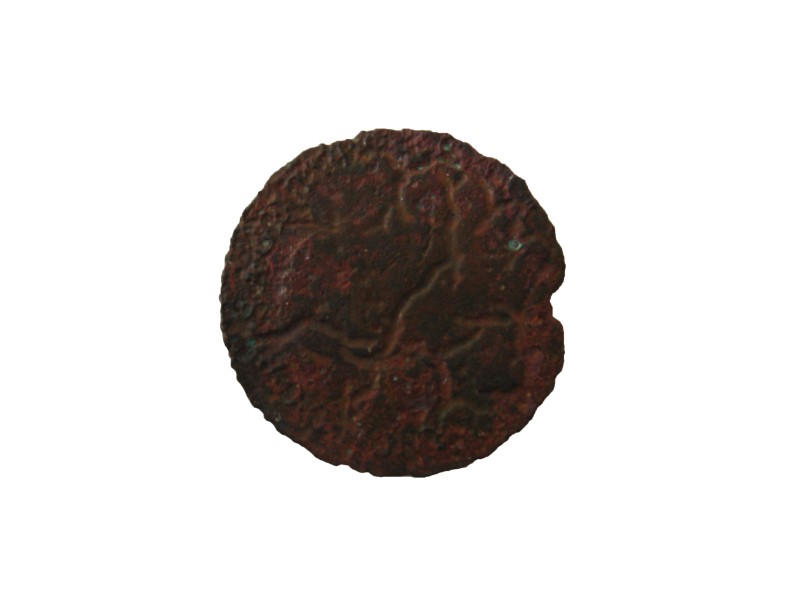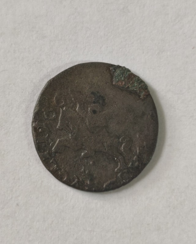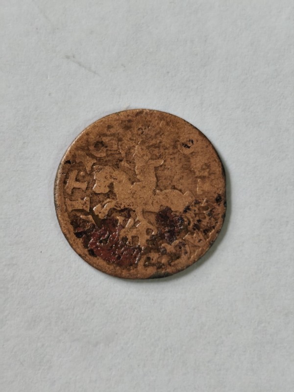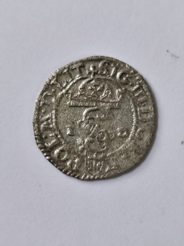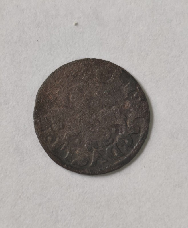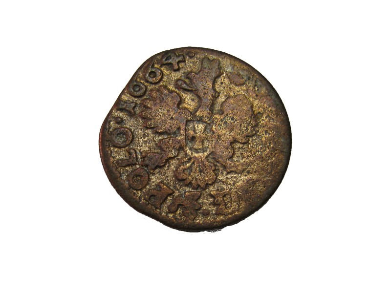 Монета круглої форми - боратинка. Аверс монети стертий, зображення і легенда монети не простежується. Реверс монети - зображено герб Погоня (вершник на коні із мечем у руках). Навколо частково прочитується легенда монети "CO...G LI..."