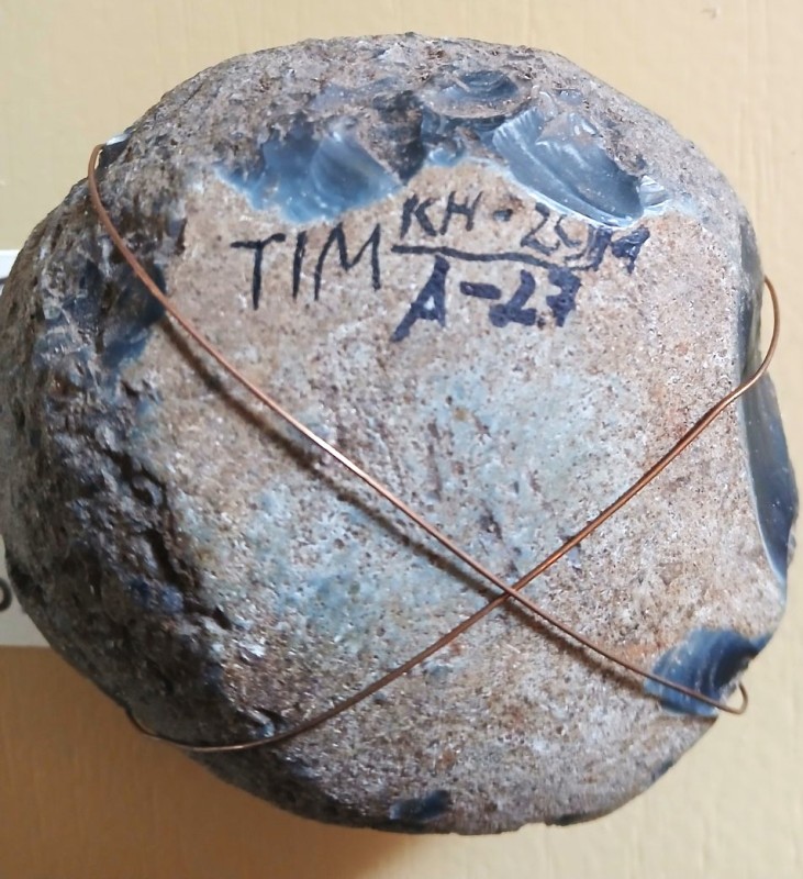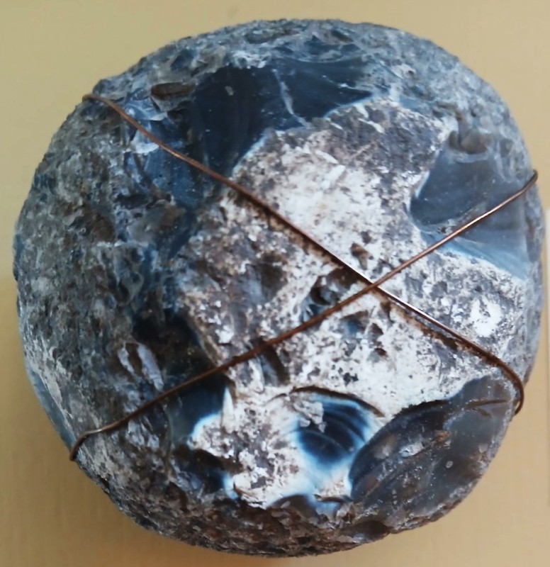 Морська черепашка (мушля). Спіральної форми. Сірого кольору. Зі смужками світло-коричневого кольору.