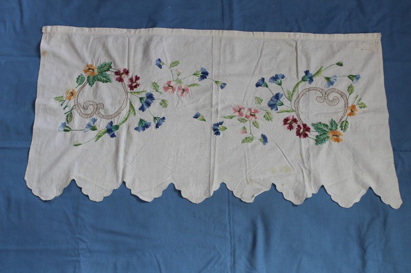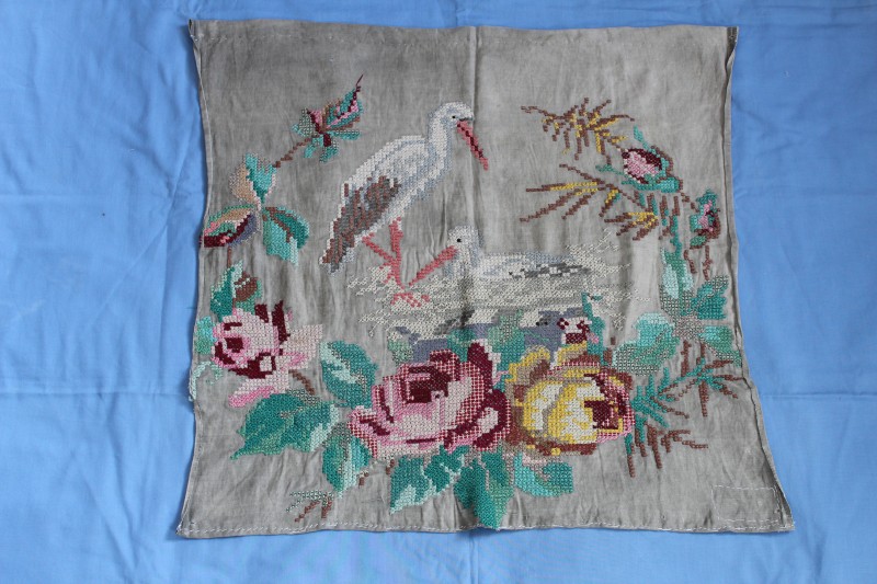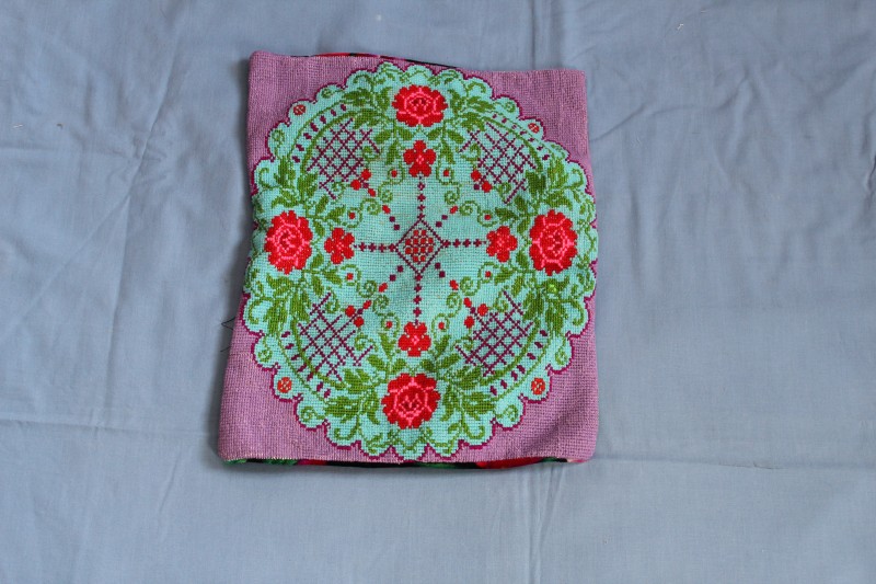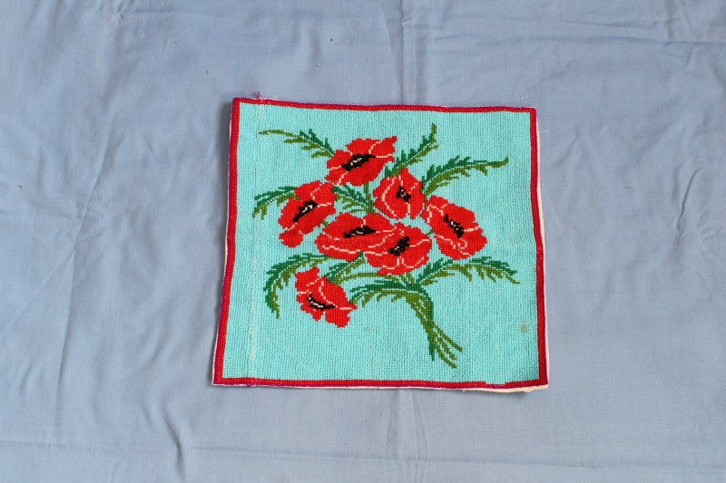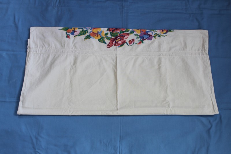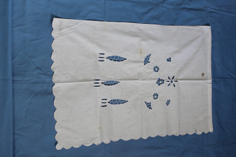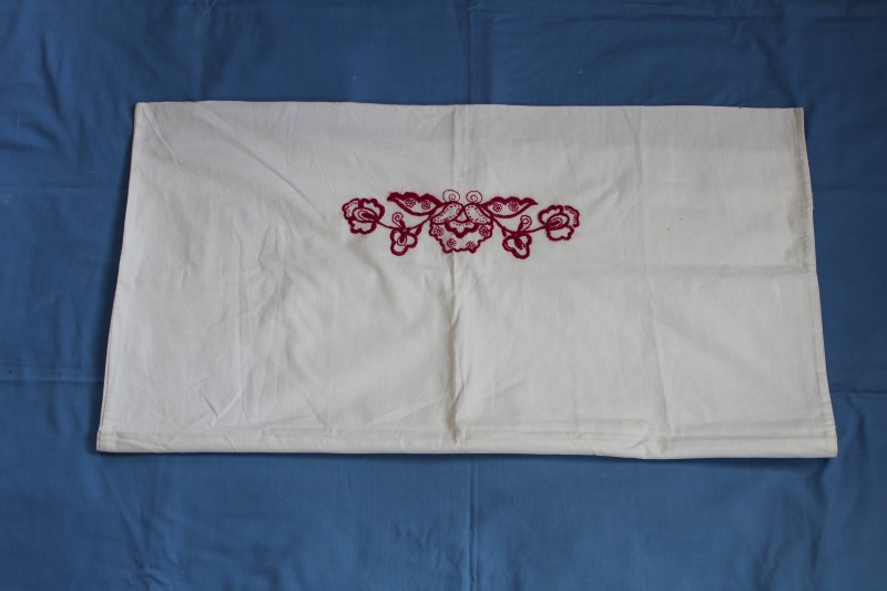 Наволочка невелика вишита. Вишивка виконана на полотняній тканині сірого кольору. З двох кутів оздоблена декоративним малюнком коричнево – чорного кольору. В основі вишивки - букет із польових квітів у полігамних кольорах. Україна. ХХ-ХХІ століття. Тканина, нитки. Машинна вишивка. Була у користуванні. l – 40см, а - 33см.