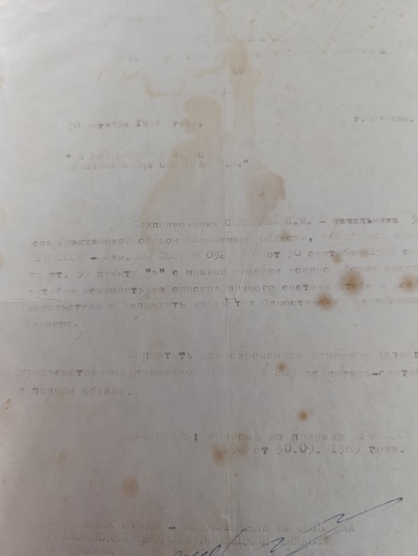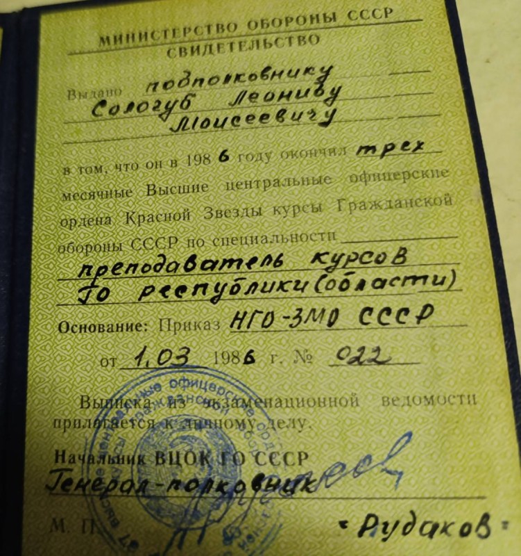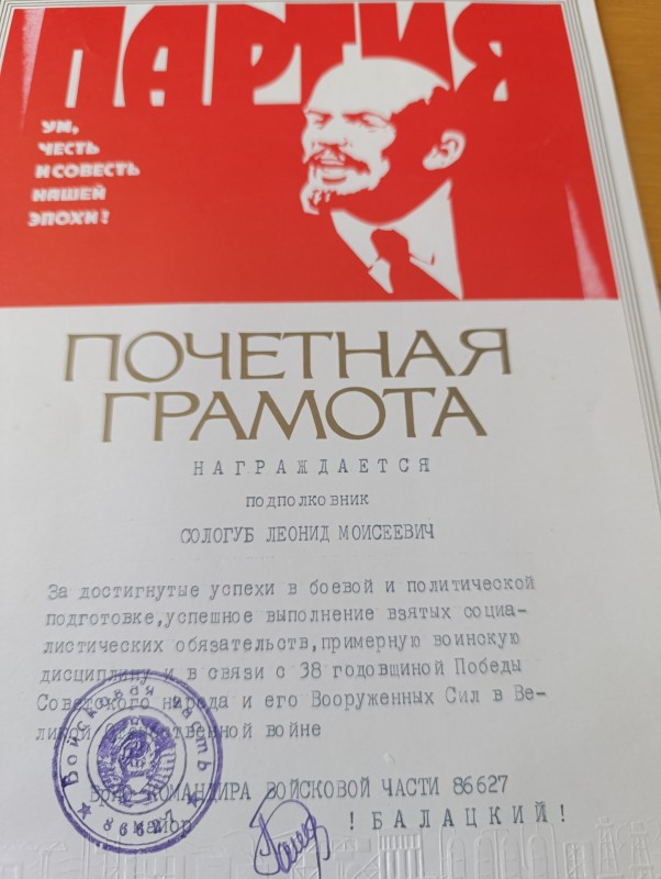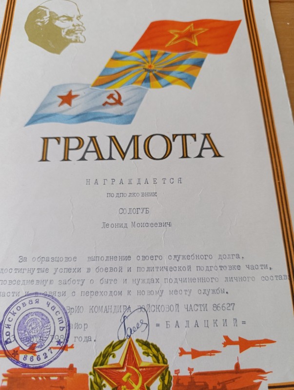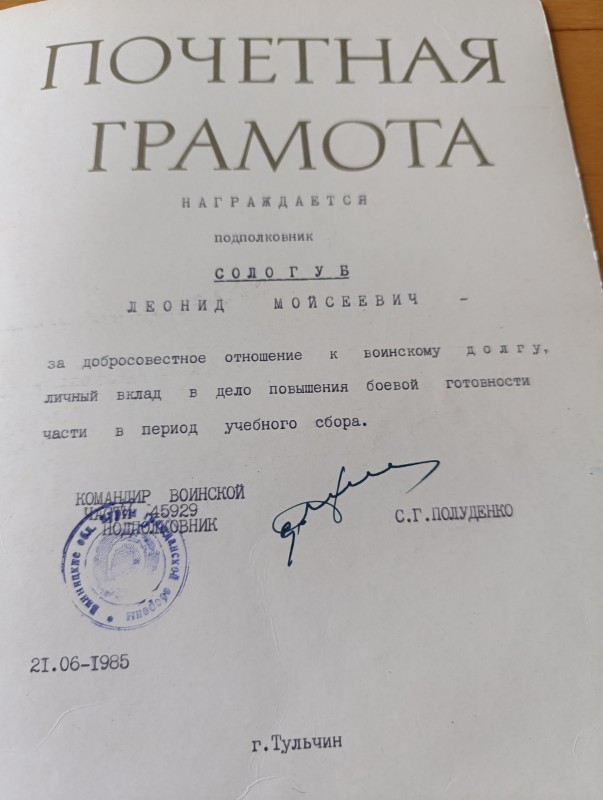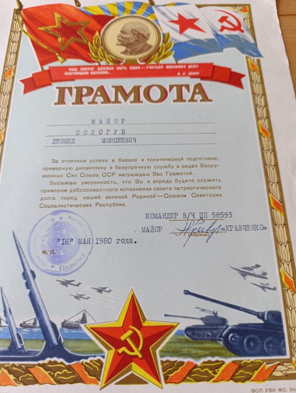 Почесна грамота майора Сологуба Л. М. 1980р.