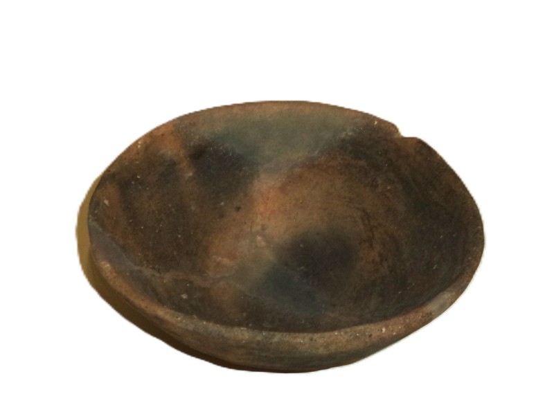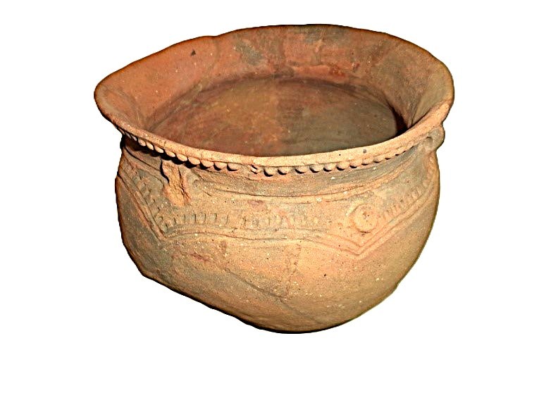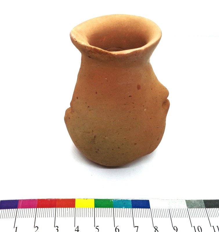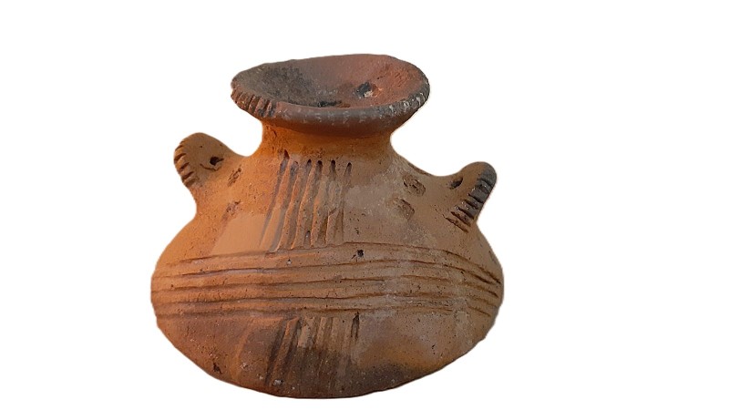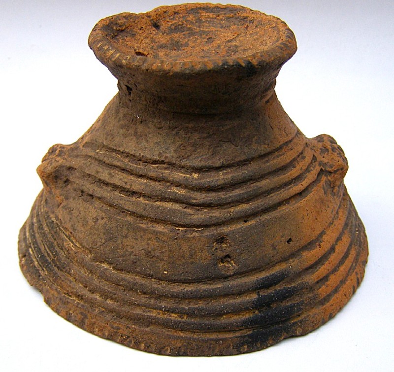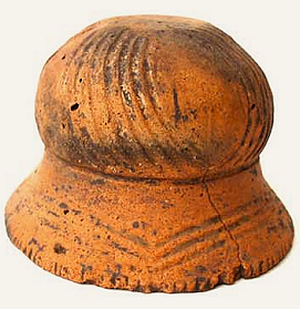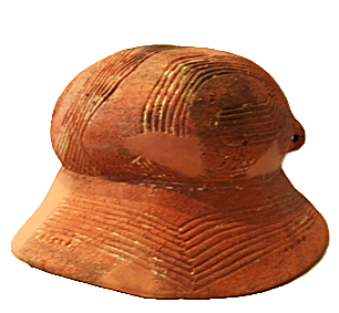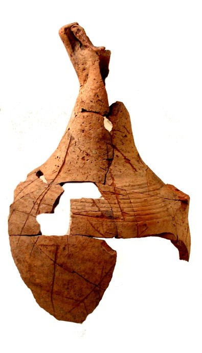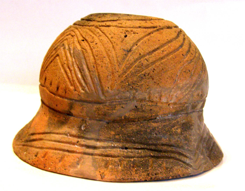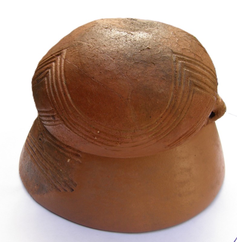 Покришка конічна з двома вушками, які мають вертикальні проколи. Поверхня жовтого, місцями сірого, кольору. Орнаментальна композиція складається з двох стрічок із горизонтальних, заглиблених ліній, в яких частково збереглись залишки інкрустації білою пастою. На тулубі стрічка із чотирьох ліній утворює два фестони з вушками в центрі; під ручкою також стрічка з чотирьох ліній оперізує основу тулуба. Ручку та вушка прикрашено по краю насічками. Такі покришки могли входити в комплект до грушоподібних посудин. Вушка з отворами використовували для прив’язування , запечатування посудини із припасами. В профіль такі кришки нагадують постать людини з піднятими вгору руками. Орнамент на покришці відповідав декору посудини, для якої ця покришка призначалася. Подібні антропоморфні покришки з заглибленим орнаментом були типовими для так званої Східнотрипільської культури, що була поширена, починаючи з етапу В І – ІІ у межиріччі Південного Бугу та Дніпра.