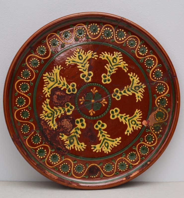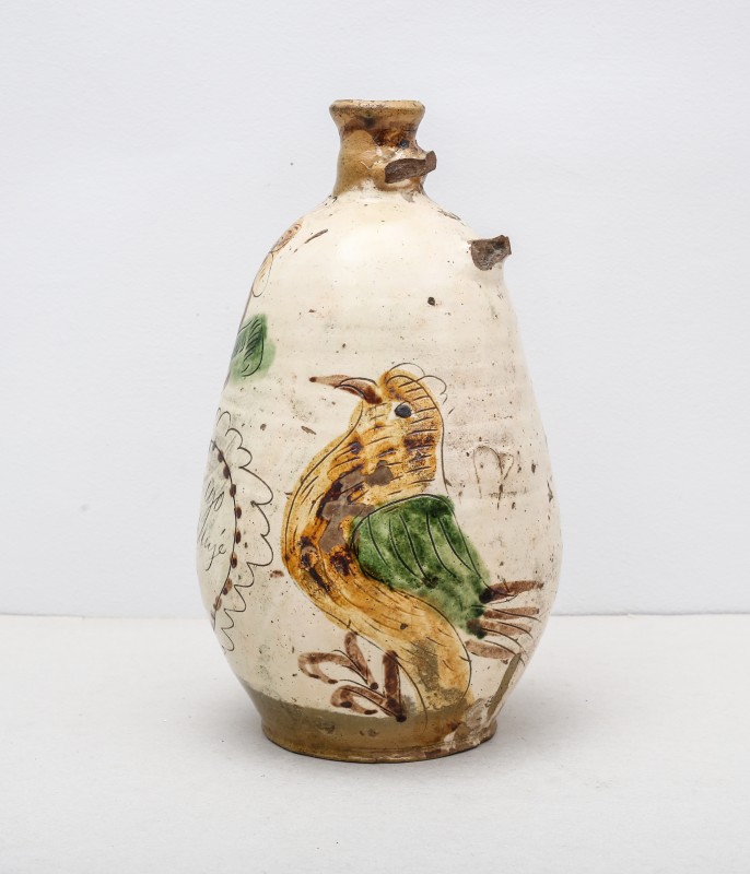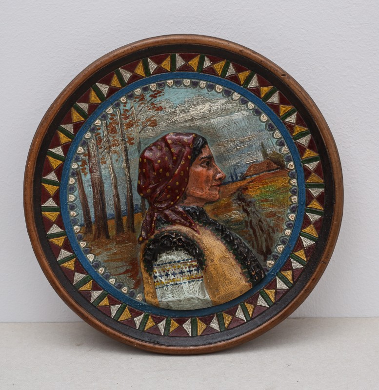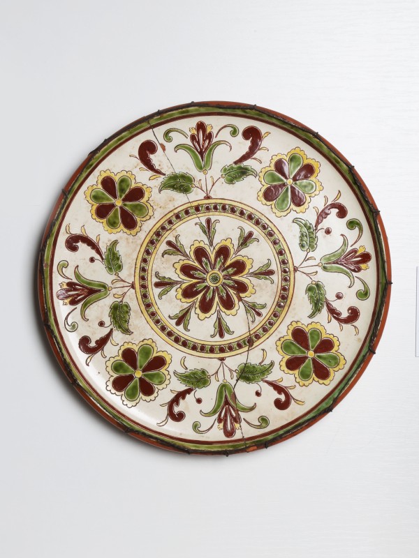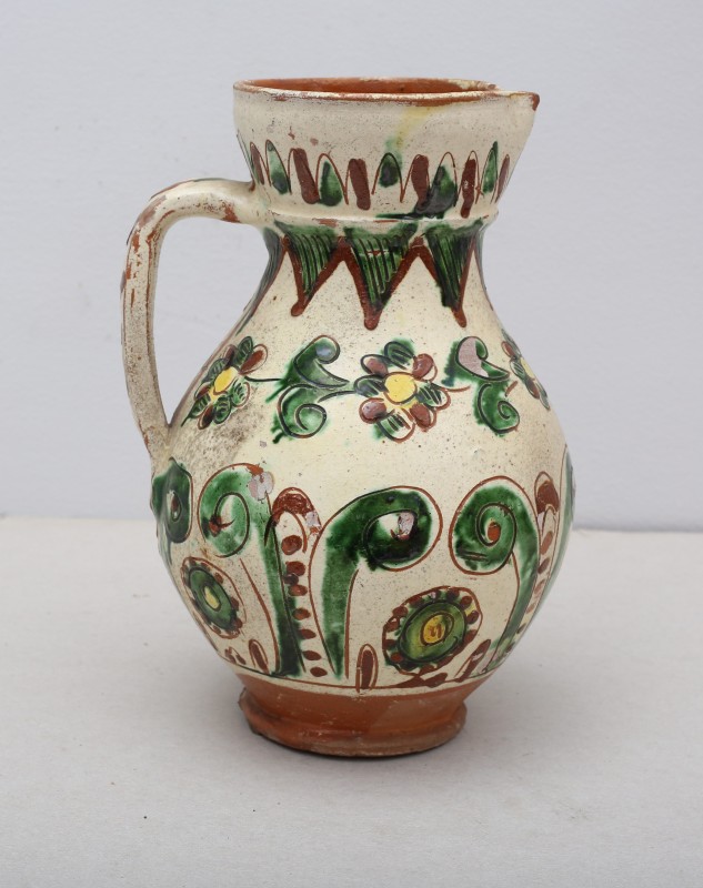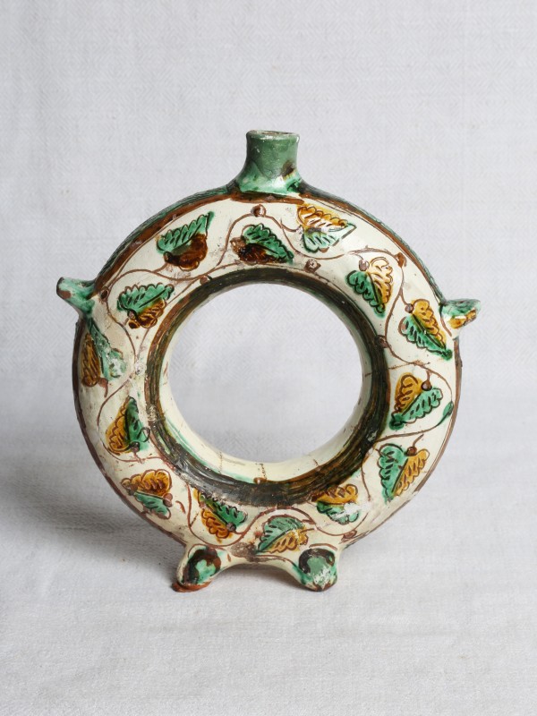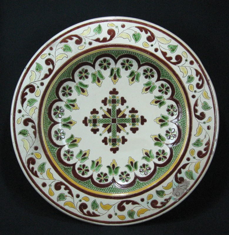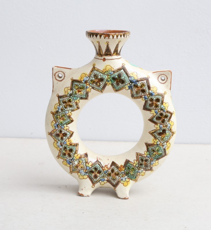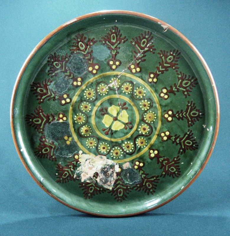 Посудина на свячену воду у формі овалу, випалена з червоної глини, поливана і розмальована зеленою, жовтою, коричневою, синьою та білою фарбами. Декор: в центрі - барельєфне зображення Розп'яття, по боках дві квітки з листками, вгорі та внизу є півокруглі заглиблення у вигляді чаші; нижнє заглиблення - на воду. Такі посудини підвішувались на стіну під образами.