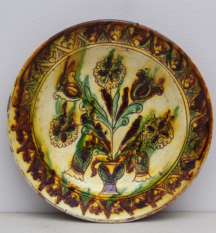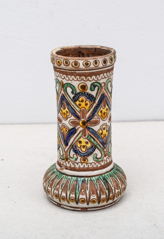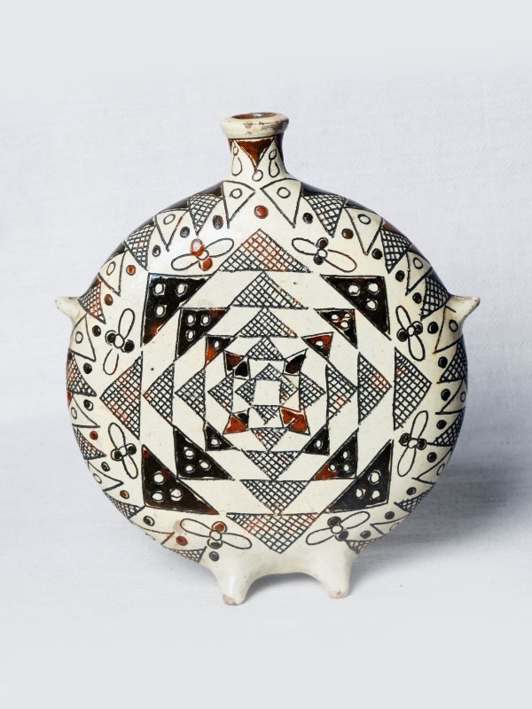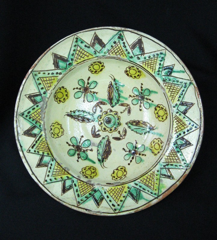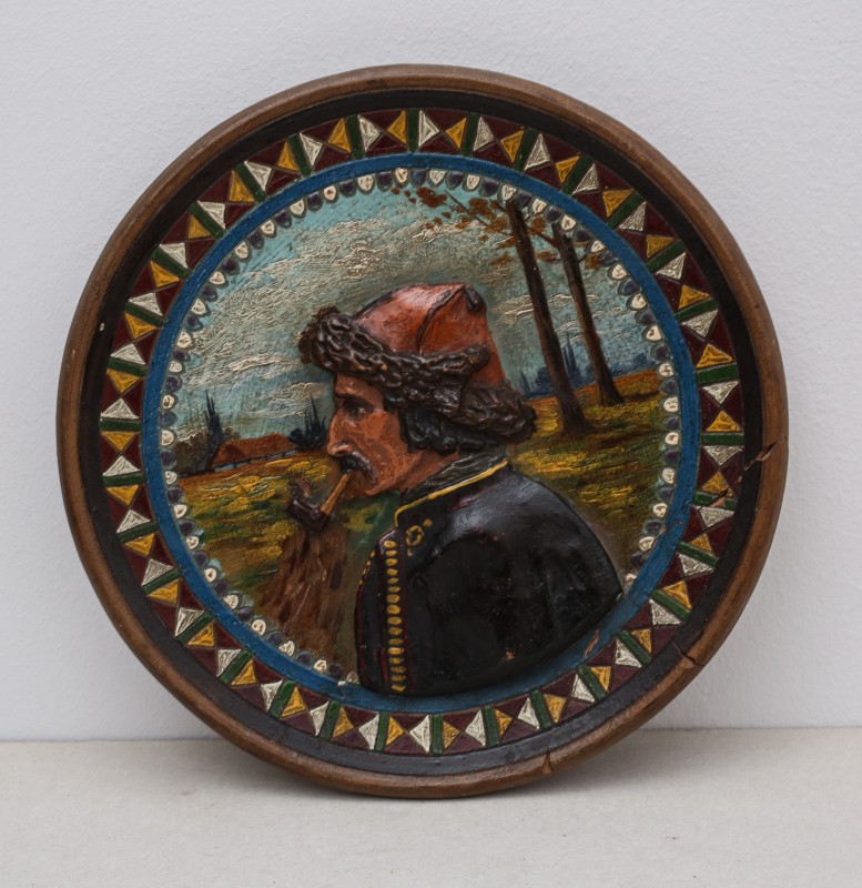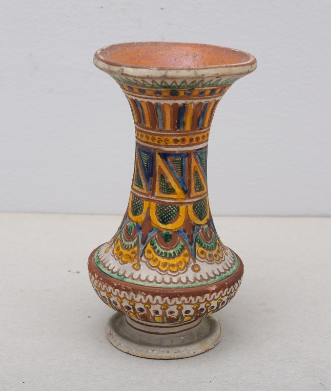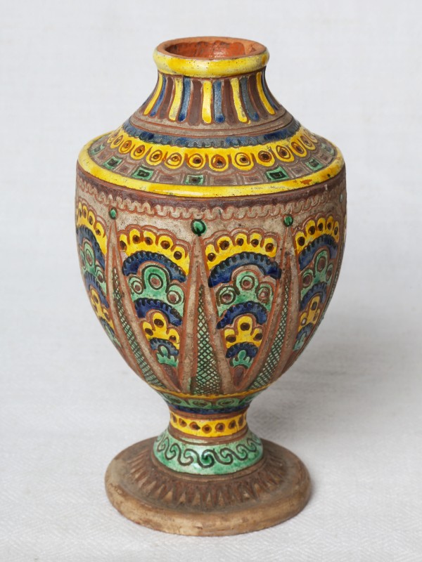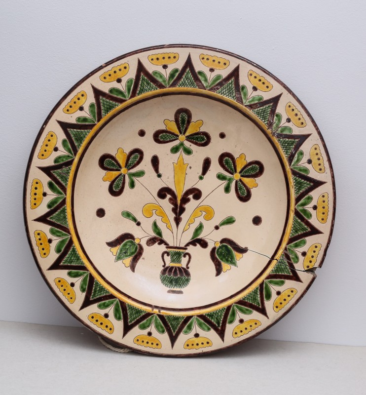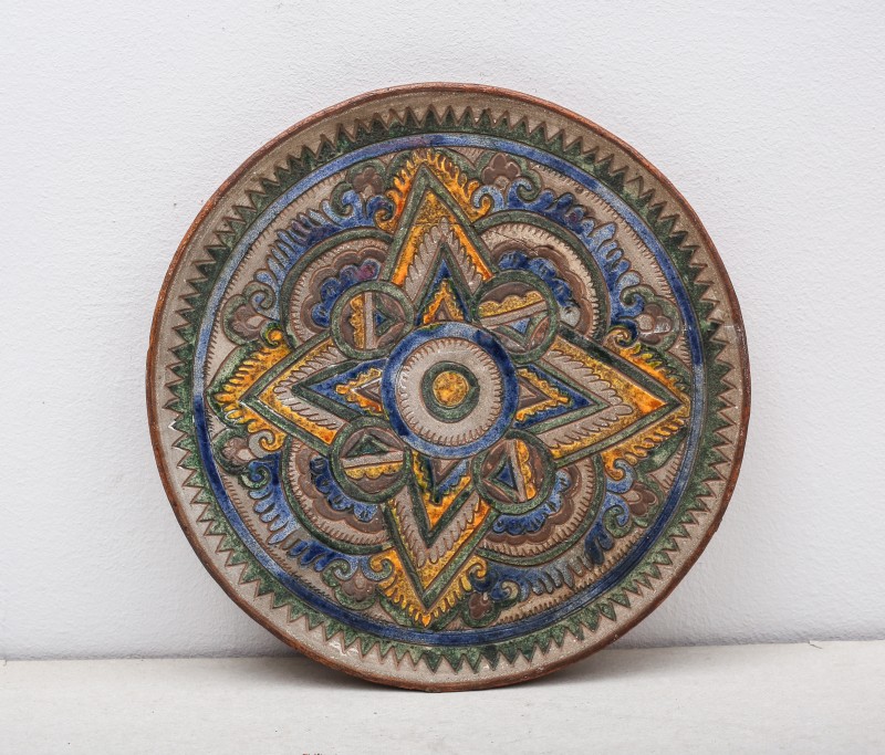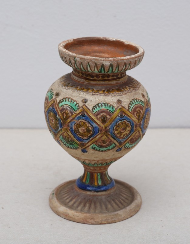 Посудина на свячену воду у формі овалу, випалена з червоної глини, поливана і розмальована зеленою, жовтою, коричневою, синьою та білою фарбами. Декор: в центрі - барельєфне зображення Розп'яття, по боках дві квітки з листками, вгорі та внизу є півокруглі заглиблення у вигляді чаші; нижнє заглиблення - на воду. Такі посудини підвішувались на стіну під образами.