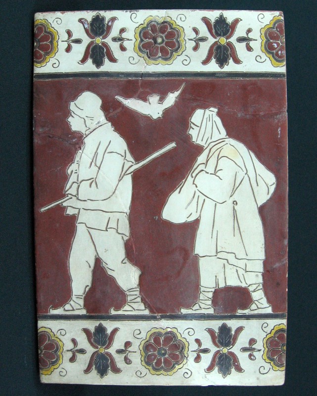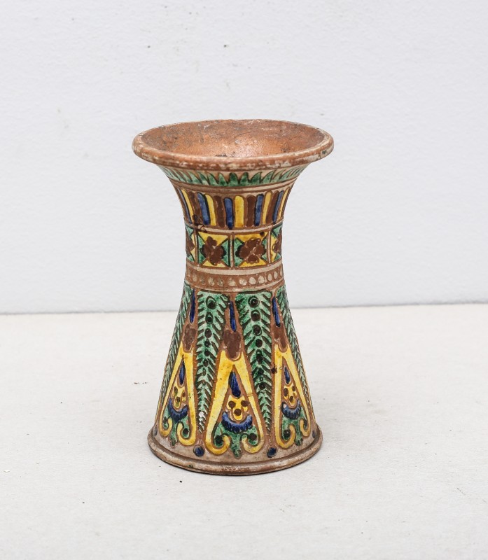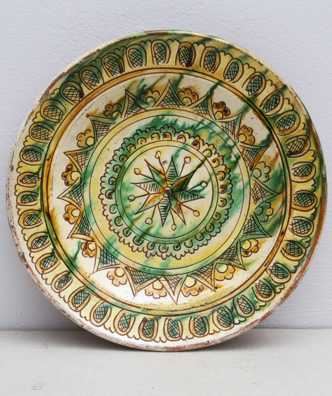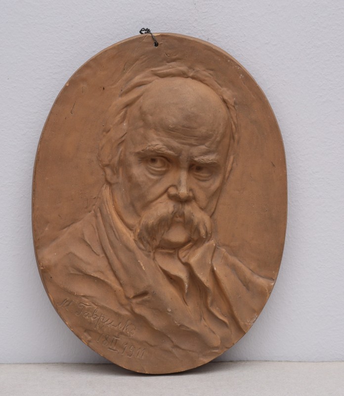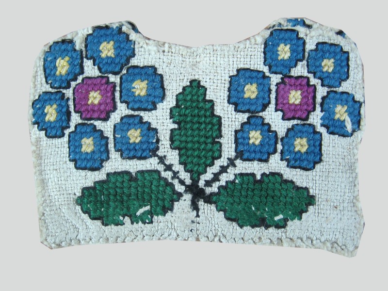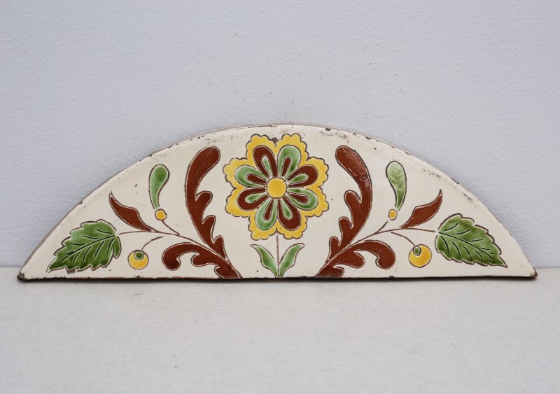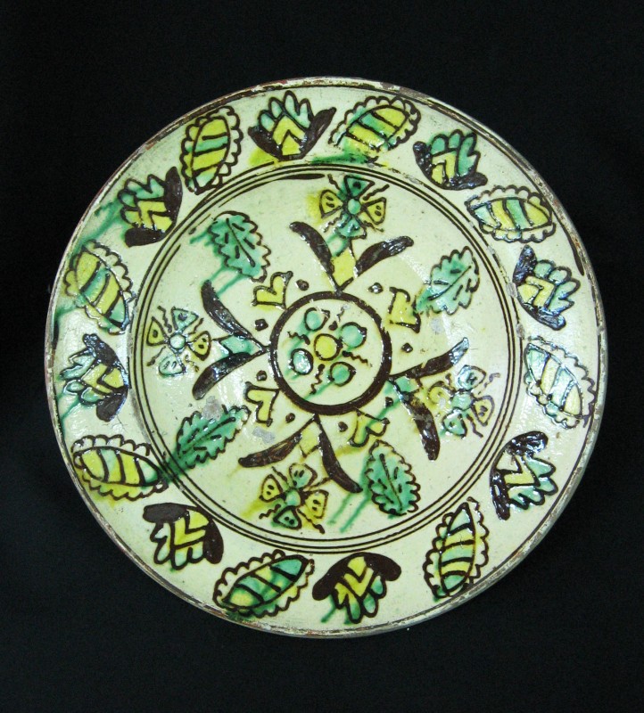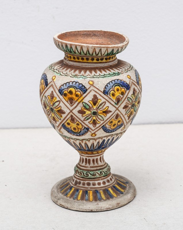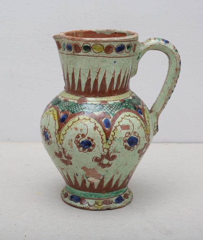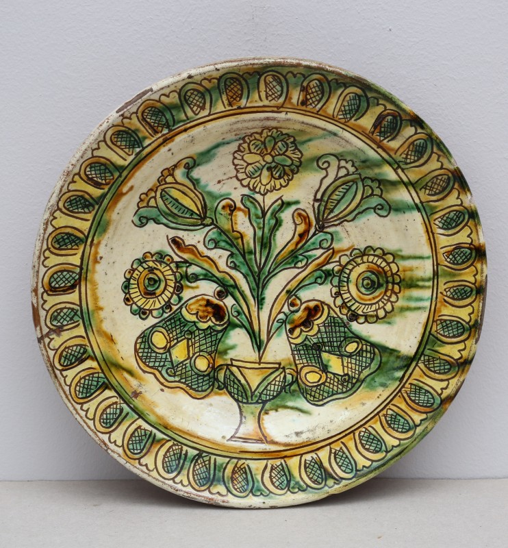 Посудина на свячену воду у формі овалу, випалена з червоної глини, поливана і розмальована зеленою, жовтою, коричневою, синьою та білою фарбами. Декор: в центрі - барельєфне зображення Розп'яття, по боках дві квітки з листками, вгорі та внизу є півокруглі заглиблення у вигляді чаші; нижнє заглиблення - на воду. Такі посудини підвішувались на стіну під образами.
