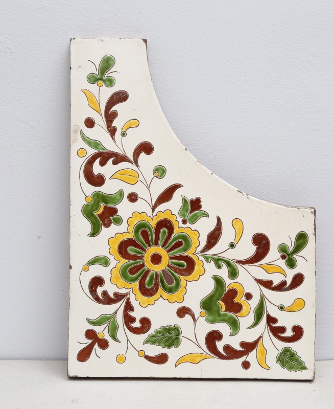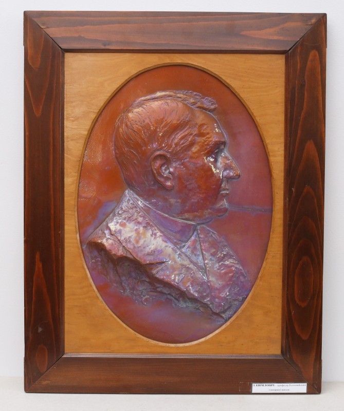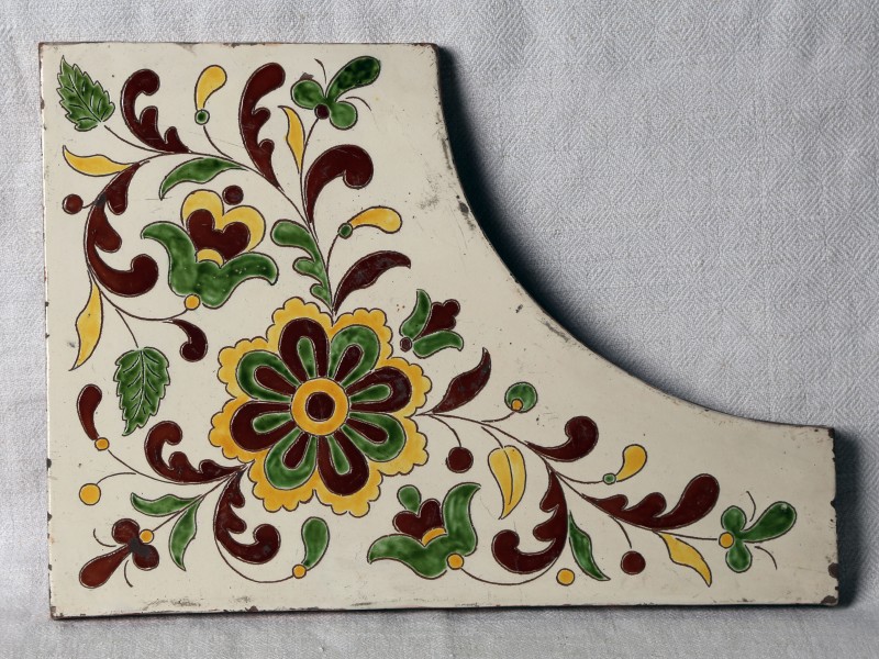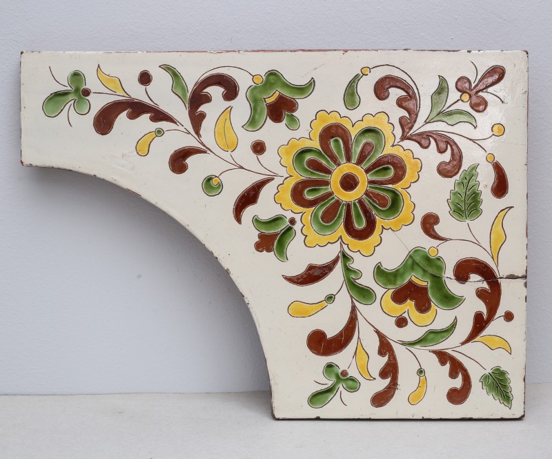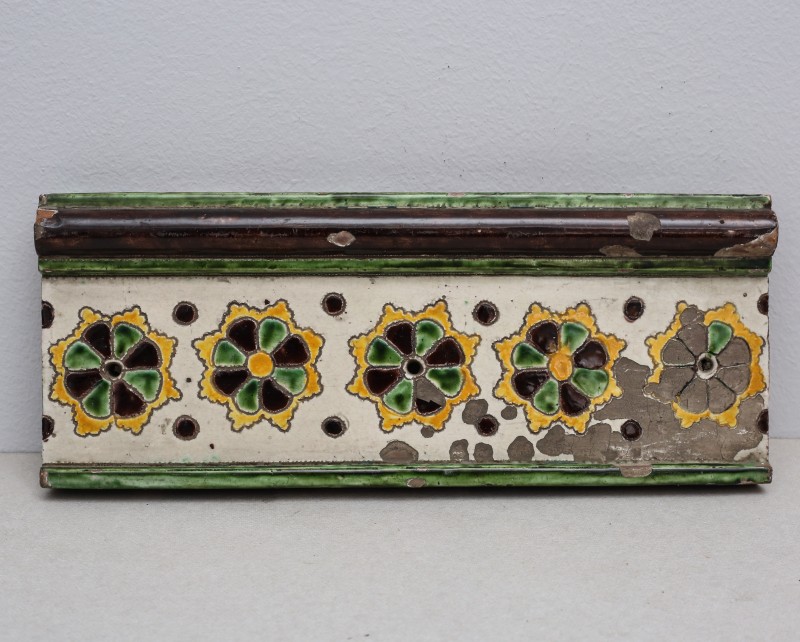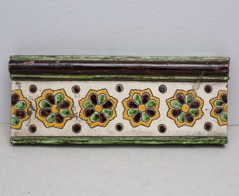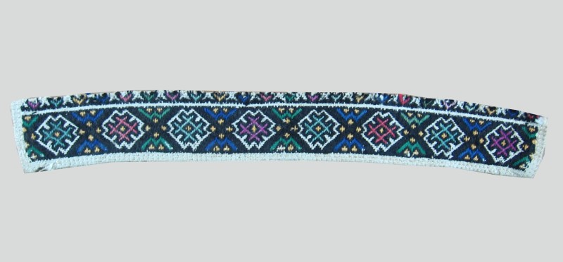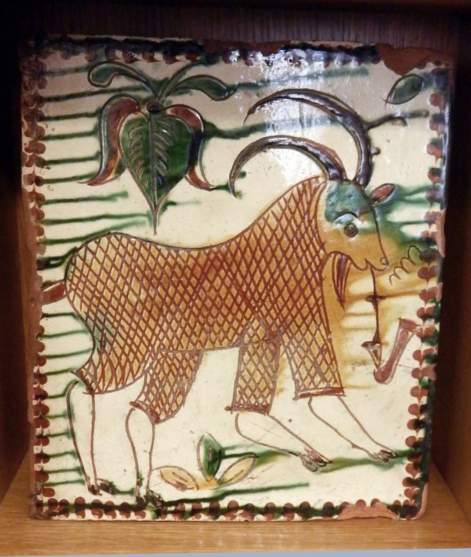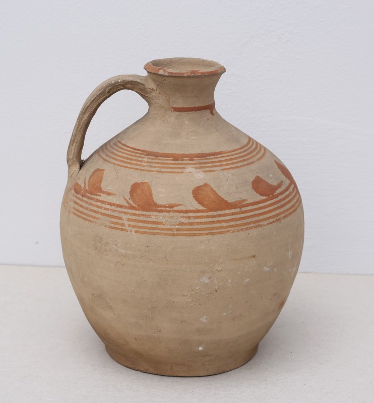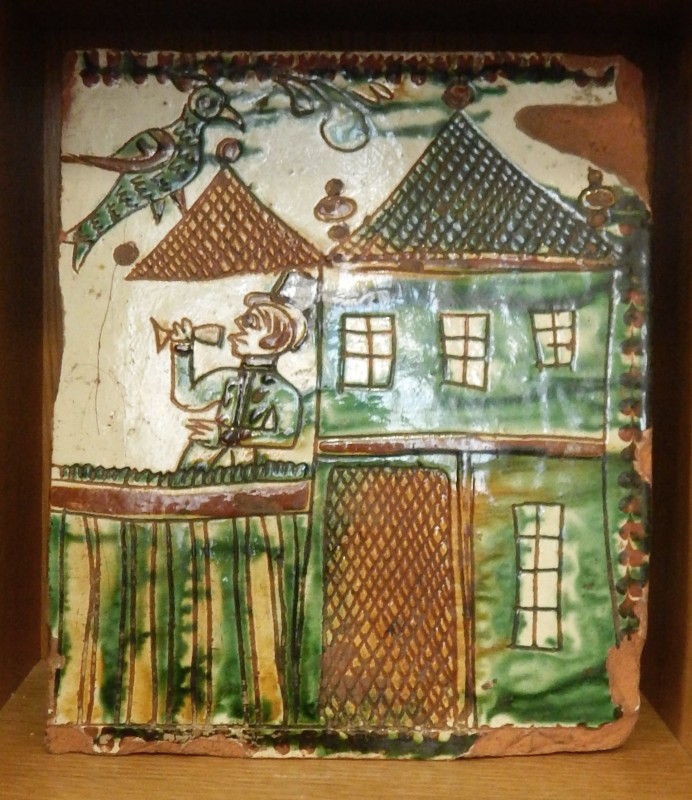 Посудина на свячену воду у формі овалу, випалена з червоної глини, поливана і розмальована зеленою, жовтою, коричневою, синьою та білою фарбами. Декор: в центрі - барельєфне зображення Розп'яття, по боках дві квітки з листками, вгорі та внизу є півокруглі заглиблення у вигляді чаші; нижнє заглиблення - на воду. Такі посудини підвішувались на стіну під образами.