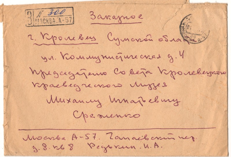 Повідомлення. Копія. Від 30 червня 1949 року. Кролевецький райвійськкомат повідомляє, що Макаренко Михайло Федорович, уродженець м. Кролевець, будучи на фронті пропав без вісти 31.08.1944 на вис. 552,2 Опанцевського повіту Радомської губернії (Польща). Видане для ходотайства про пенсію на основі наказу НКО СРСР (народний комісаріат оборони). Рукописний напис зроблений на жовто-оранжевому аркуші паперу синім чорнилом на російській мові.