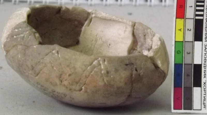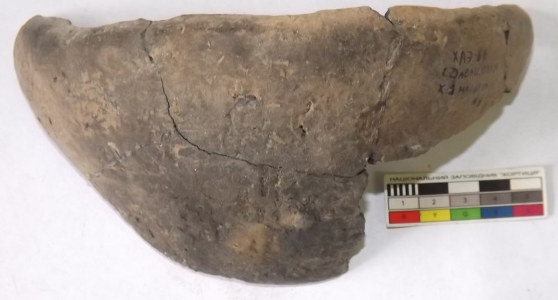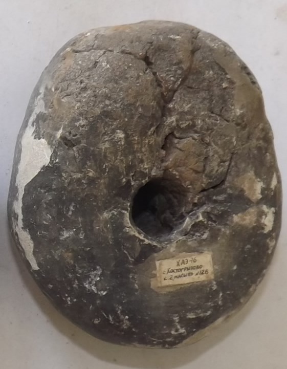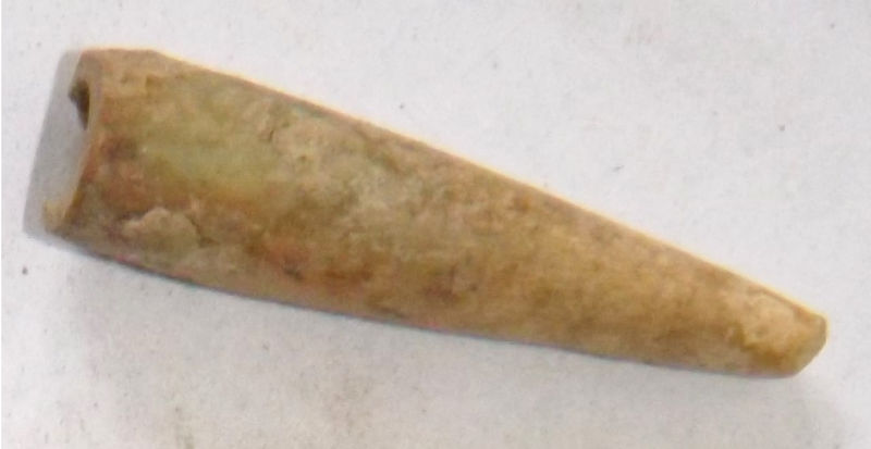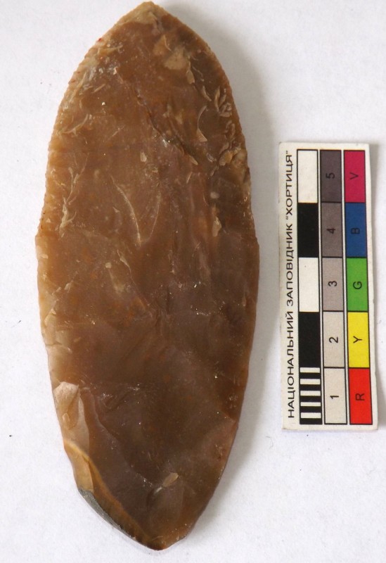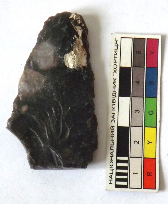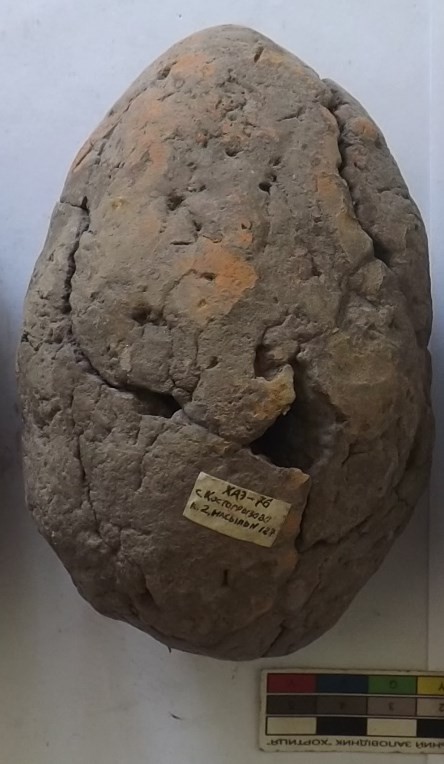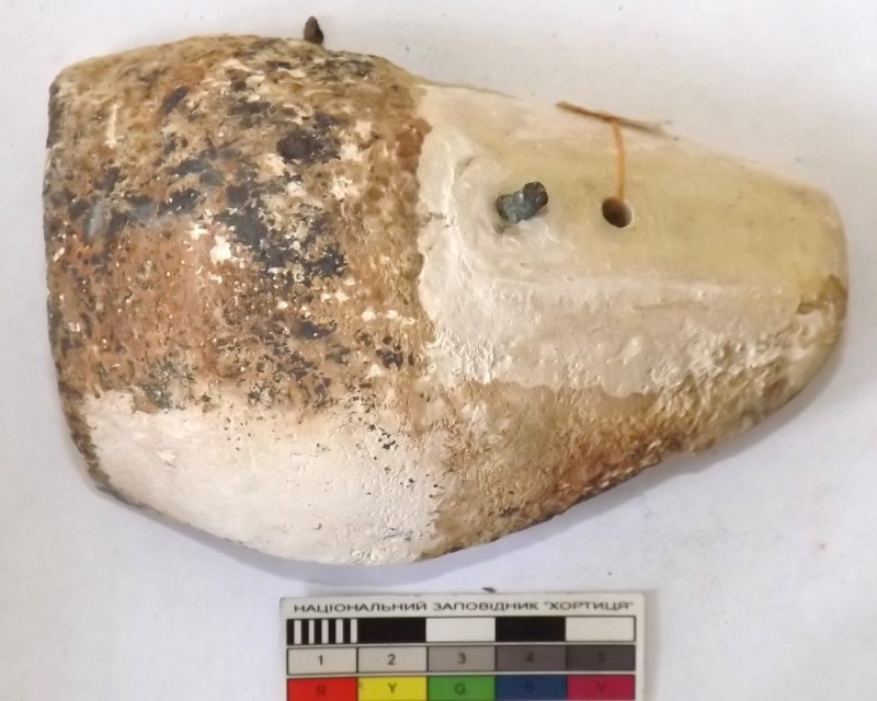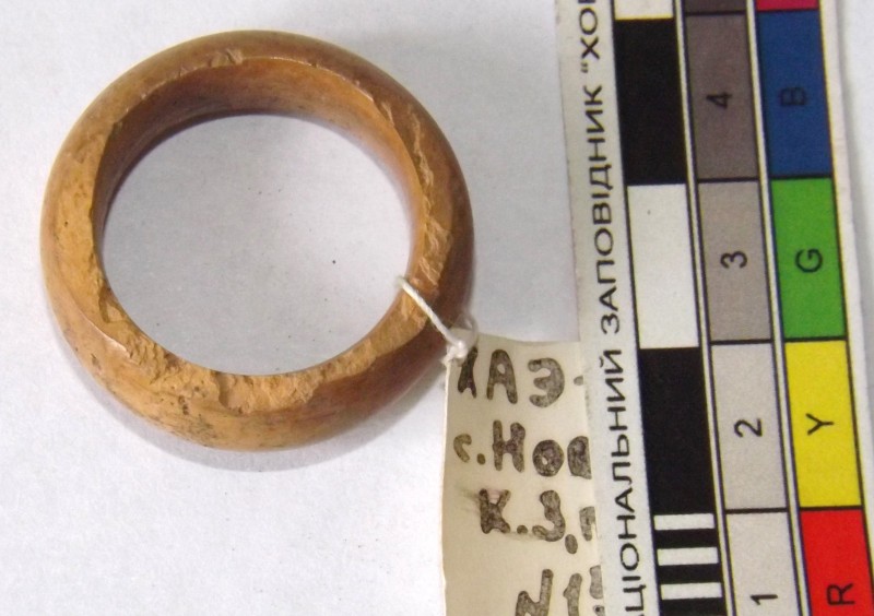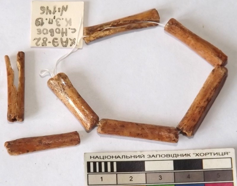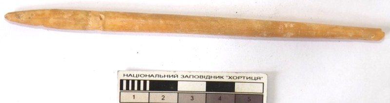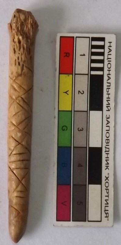 Проколка кістяна, виготовлена з трубчастої довгої кістки. Лицьова поверхня заокруглена згідно морфології будови кістки. Товщина кістки 5 мм. За формою проколка видовжена, з загостреним робочим кінчиком, овальним в перетині і фігурним верхом, прямокутним в перетині. На внутрішньому боці залишки губчатої речовини.