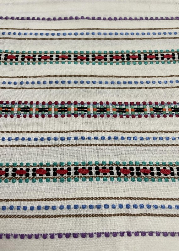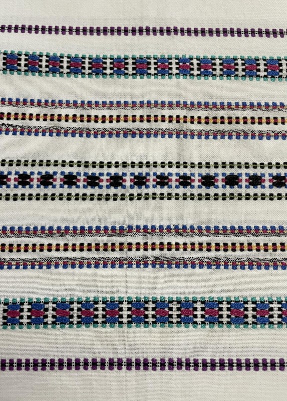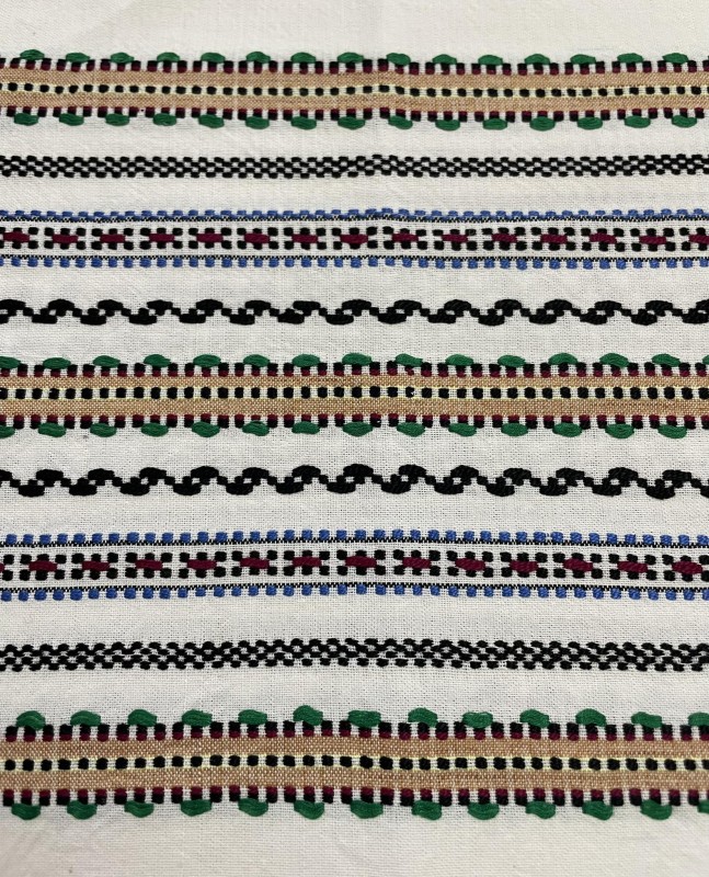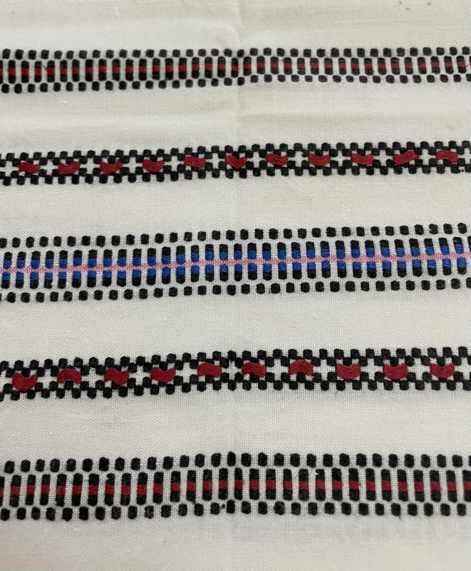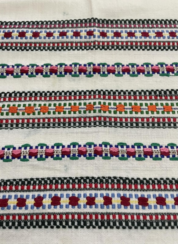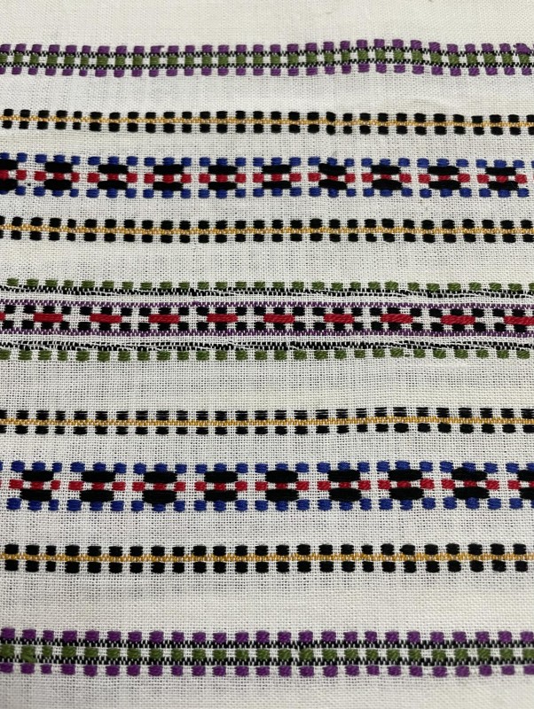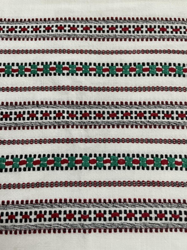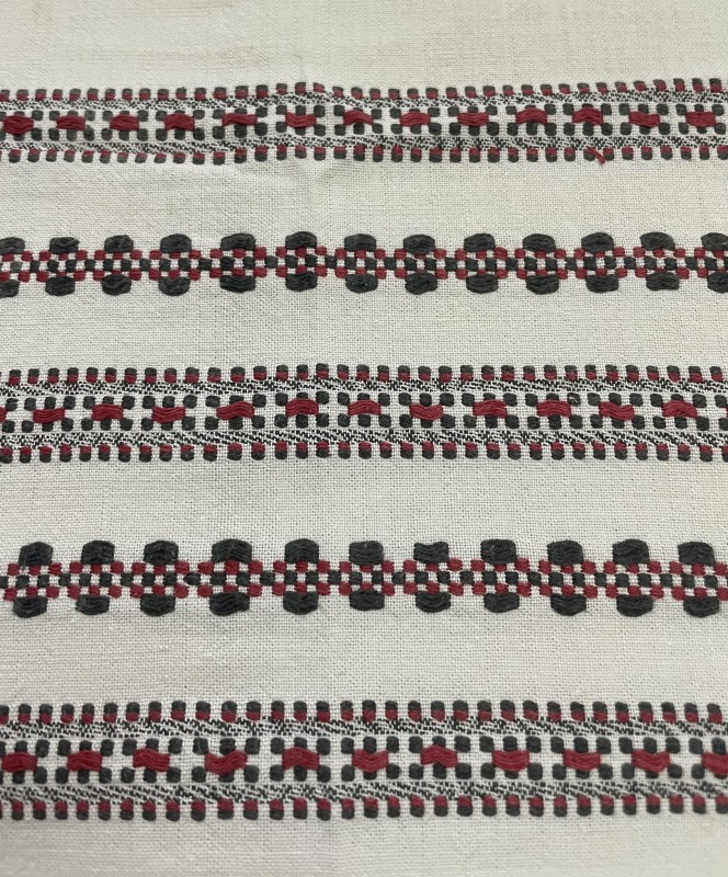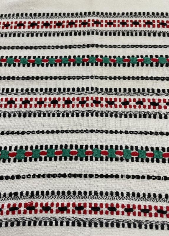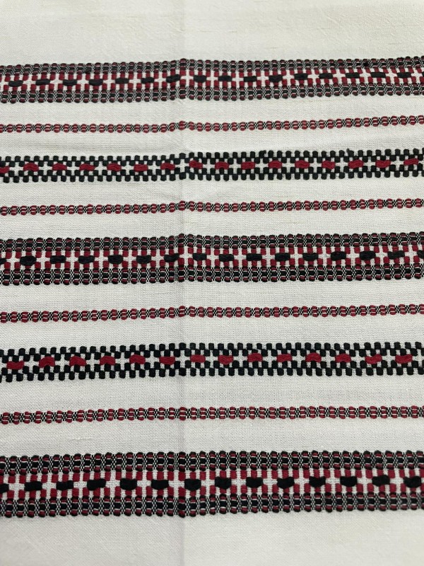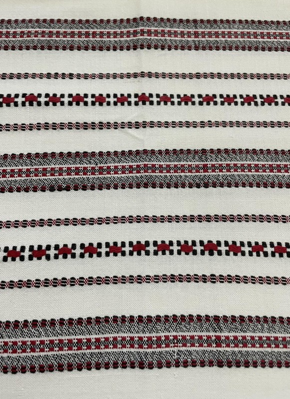 На білому полотні вишиті широкі та вузькі смужки з обох сторін рушника. Перша, третя та п’ята широка смужка, яка складається зі стібків жовтого, сірого та бордового кольорів. Між ними тонка смужка зі стібків жовтого та червоного кольорів.