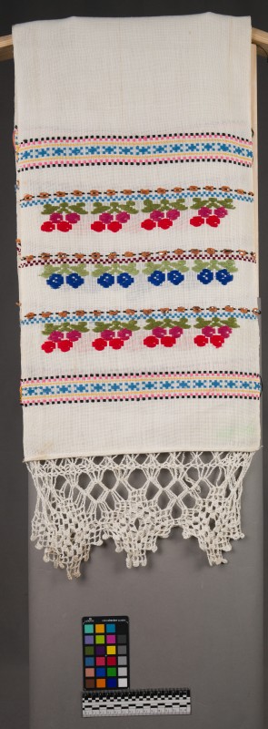 Домотканий рушник, традиційний елемент українського побуту та культури, виготовлено з конопляних ниток на ткацькому верстаті. Результат роботи ткалі - сіре гребінне полотно, з якого виготовлено рушник. По краях рушник прикрашений вишивкою «колодочка» у вигляді геометричної фігури: 12 стилізованих підсвічників з свічками, розташованих у два ряди по 6 у кожному ряду. Характерна риса: візерунок однаковий з обох сторін рушника, тому друга назва вишивки - «двостороння гладь». Основна палітра кольорів: чорний, червоний, зелений, коричневий, сірий.