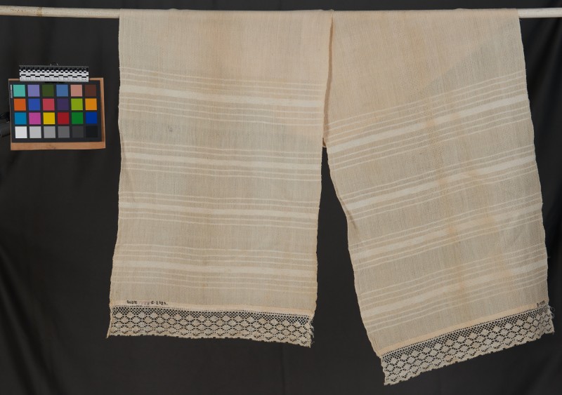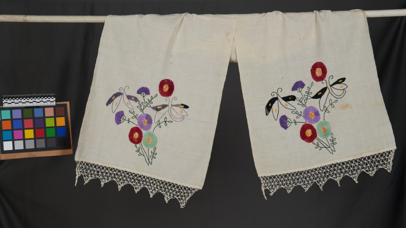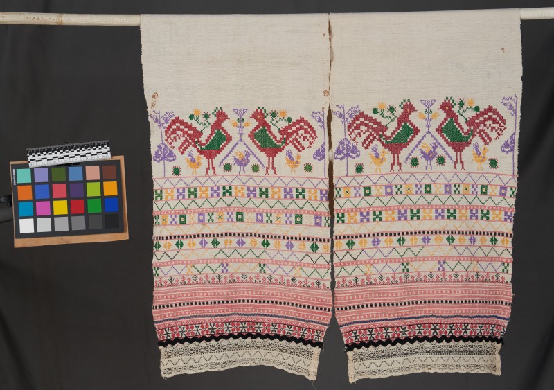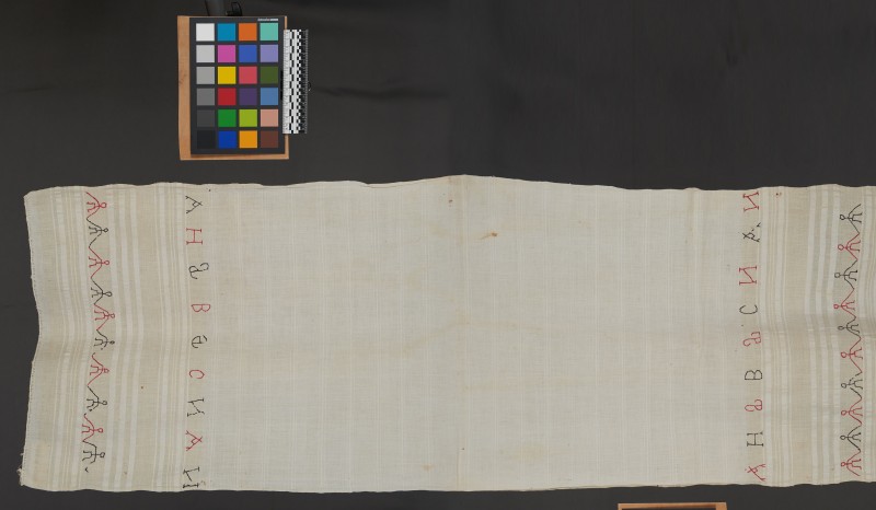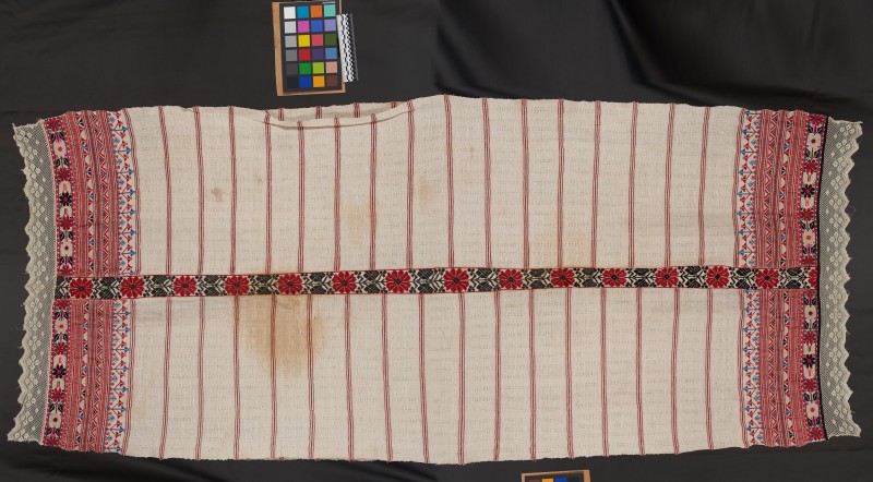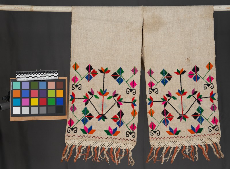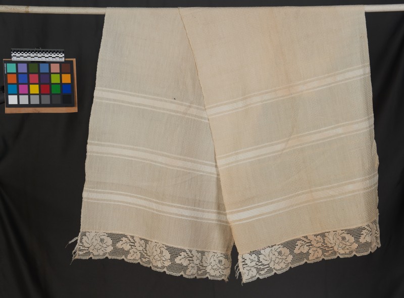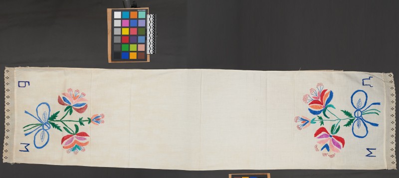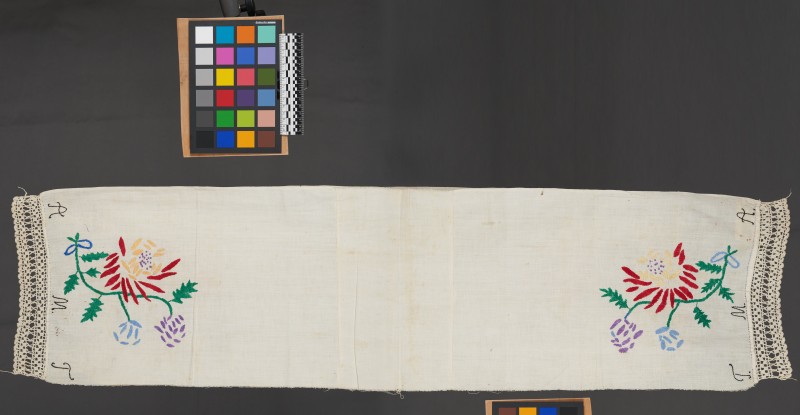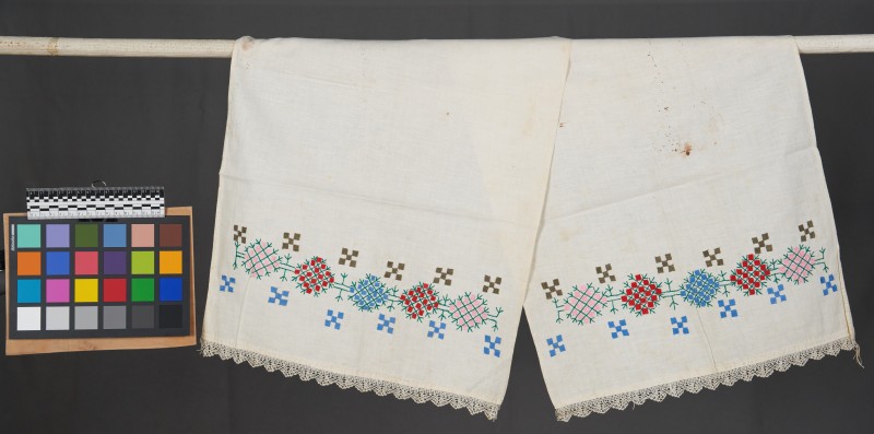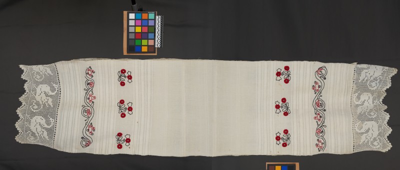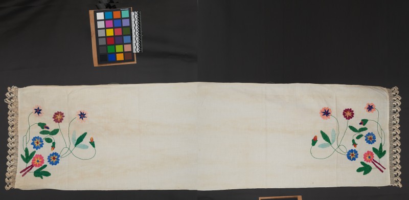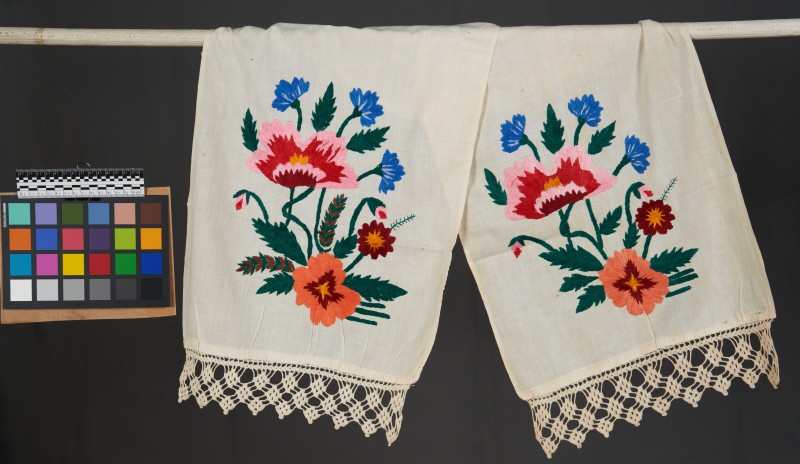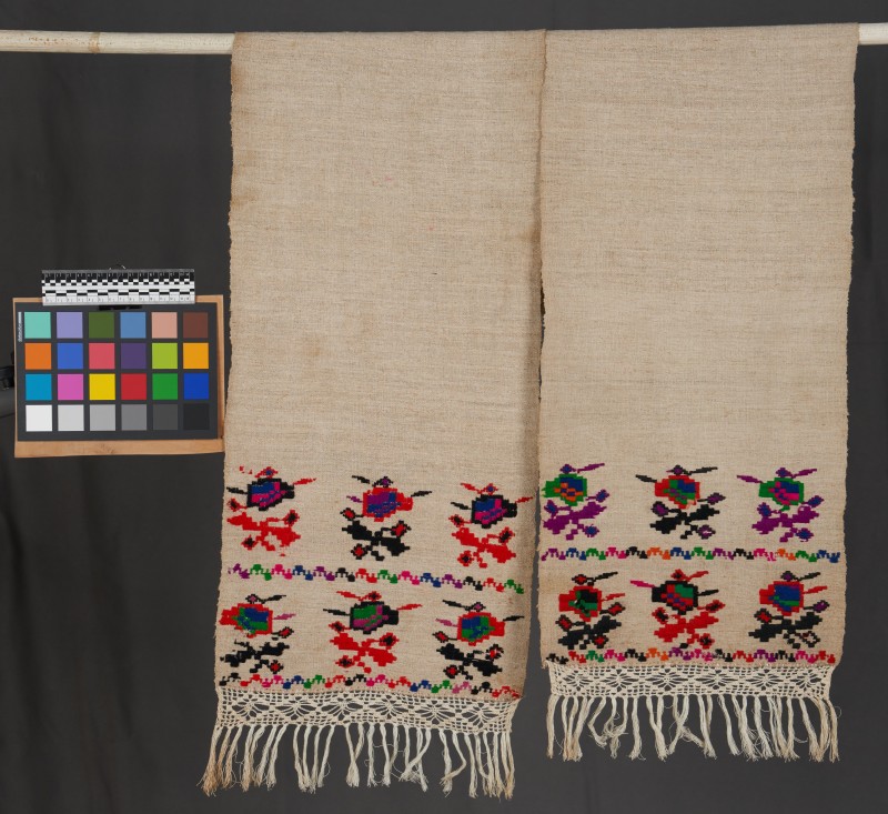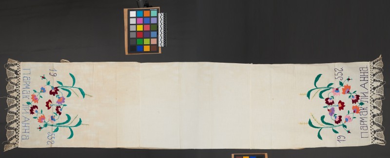 Рушник білий молдавський декоративний, по краях він'єтка з квітів, листя, птахи, надпис "Ариков В.Г.", на кінцях мереживо.