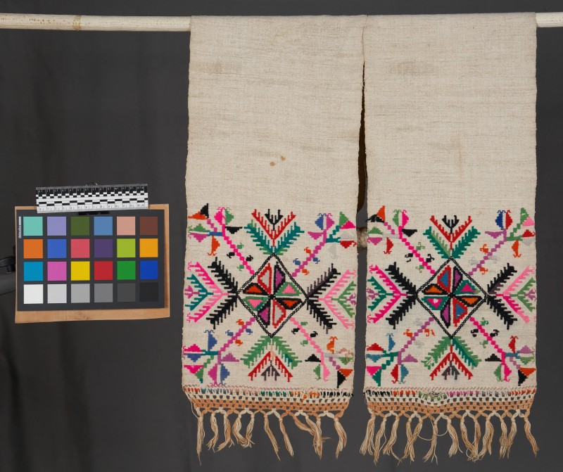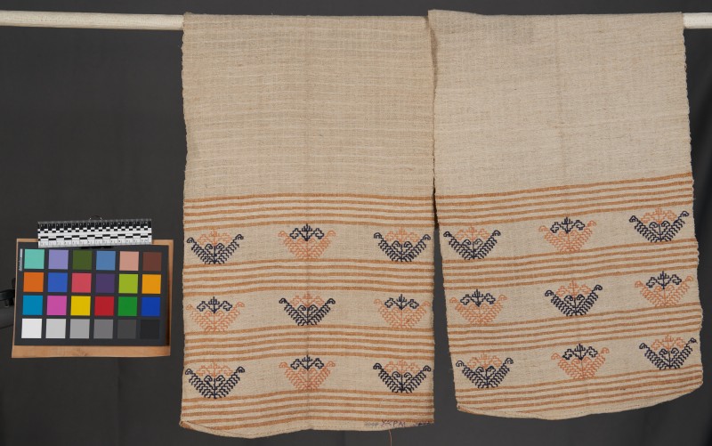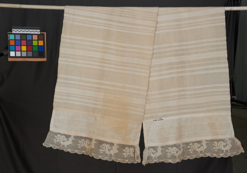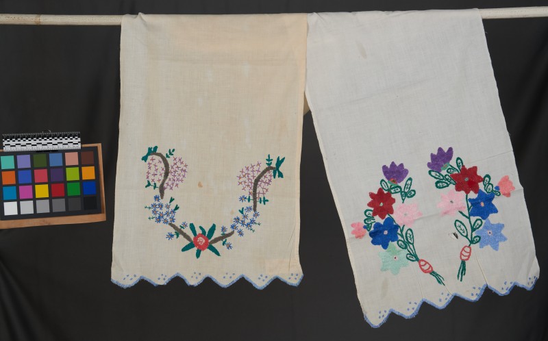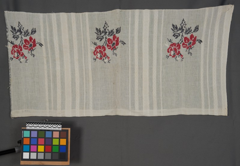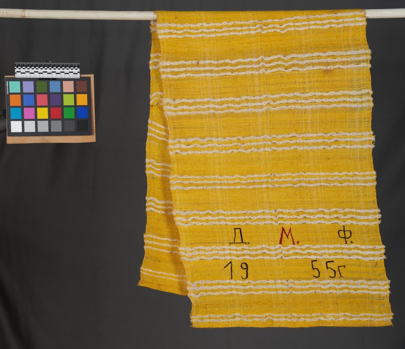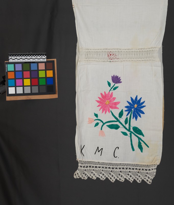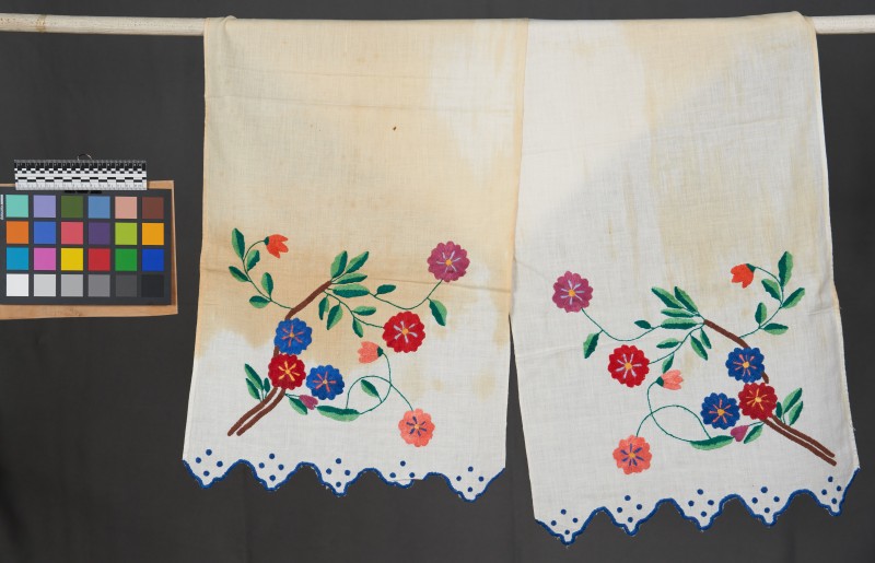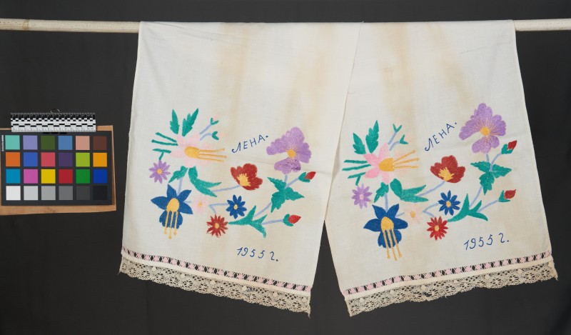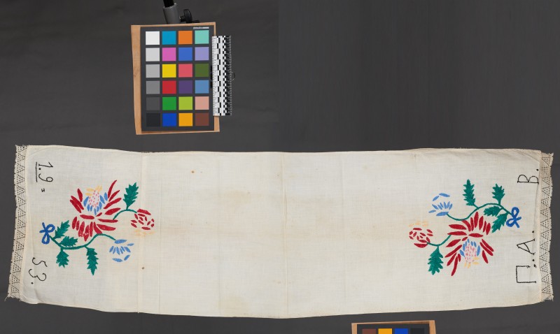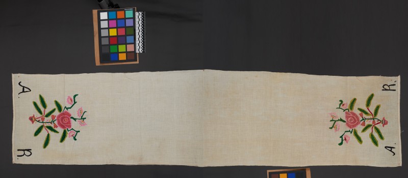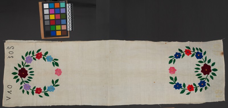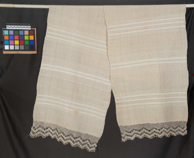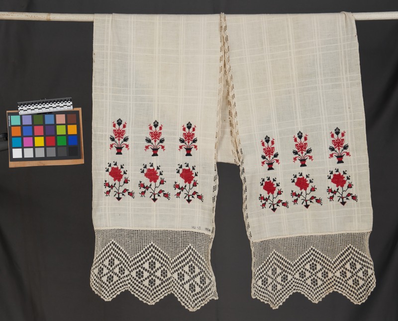 Рушник білий молдавський декоративний, по краях він'єтка з квітів, листя, птахи, надпис "Ариков В.Г.", на кінцях мереживо.