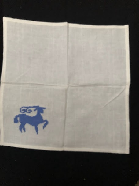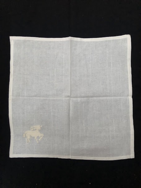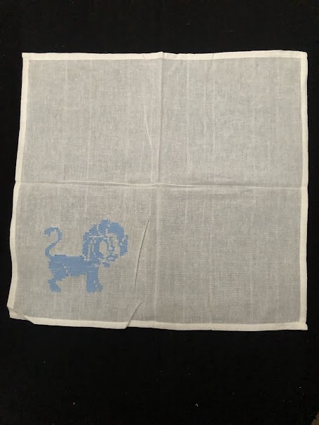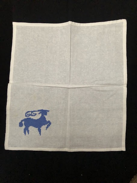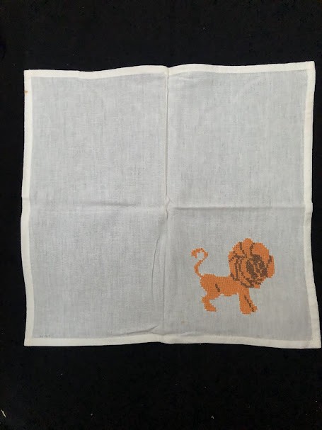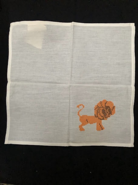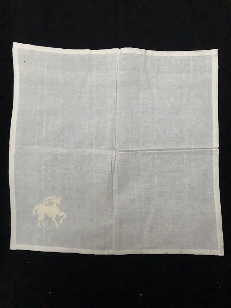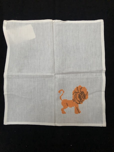 Серветка ткана. Виготовлено на початку ХХІ століття на кролевецькій фабриці художнього ткацтва. Полотно бавовна. Орнамент ручне перебірне ткацтво. По полотну білого кольору виткано червоні смуги по периметру виробу. У нижньому правому куті виткано дві обручки червоного кольору. Оверлочено на швейній машинці з усих сторін.