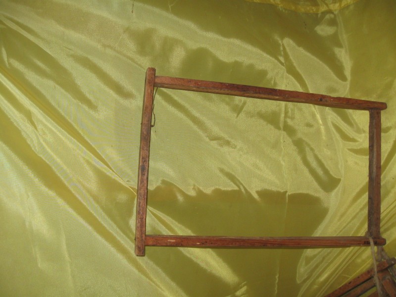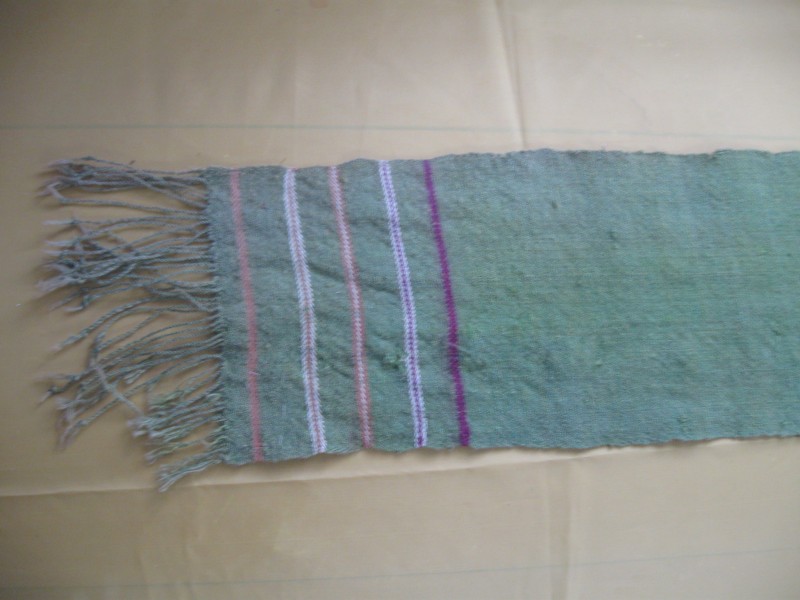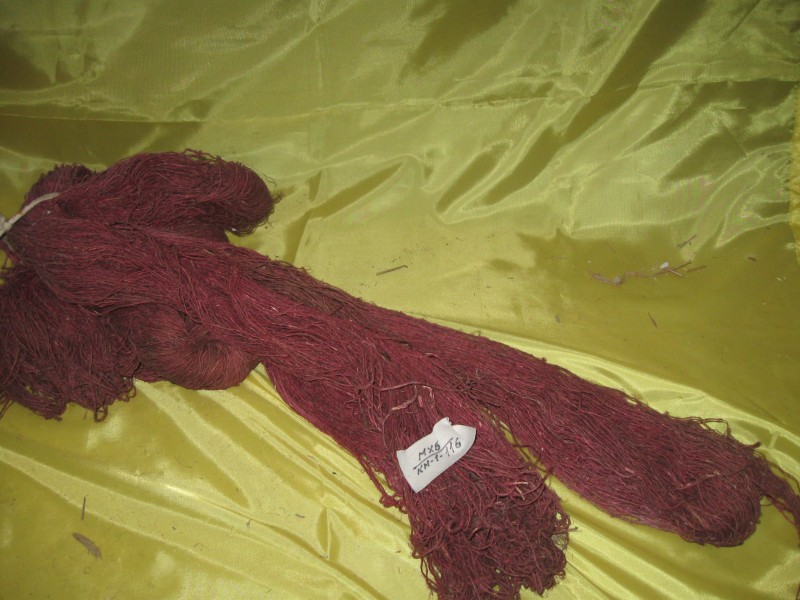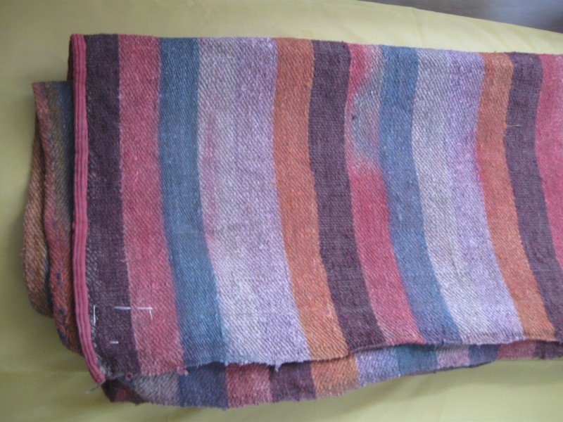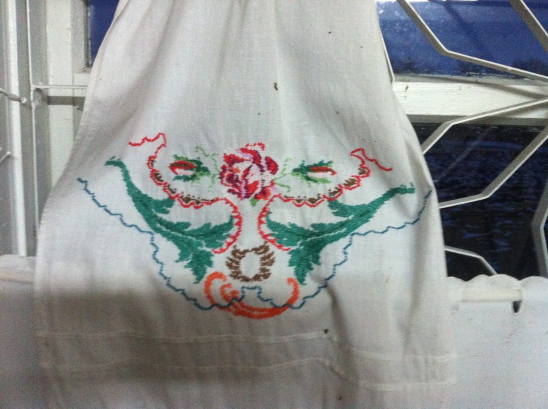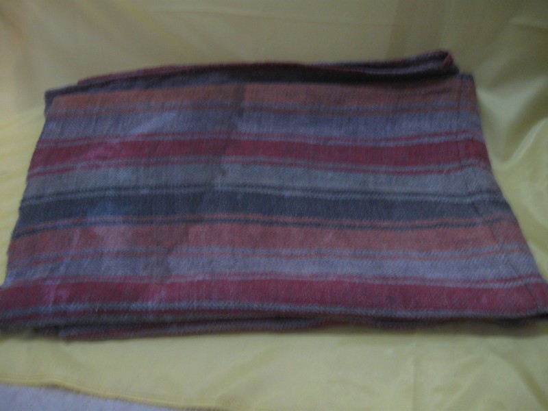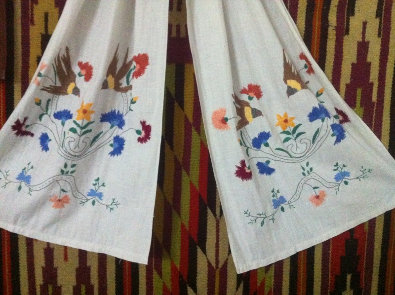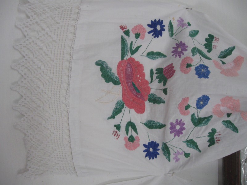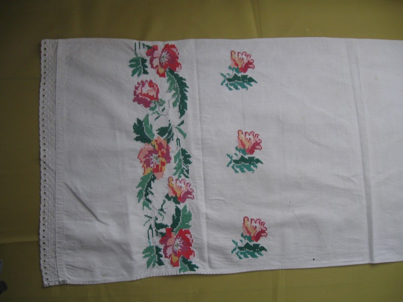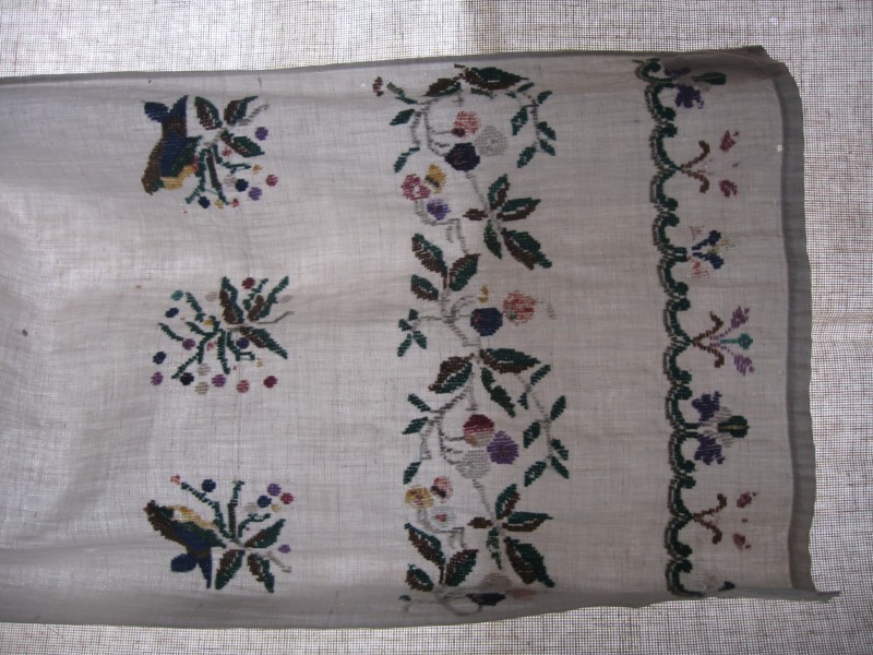 Серветка велика, червона. По периметру обшита фабричною рожевою бахромою. По всьому полю серветки нанесений малюнок у вигляді гілочок квітів – троянд. Між квітами геометричні малюнки рослинного походження. Використовувалася для домашнього вжитку. Тканина. Фабричне виробництво. Україна, ХХ ст. Була у вжитку, має вікові пошкодження: побита міллю, наявні дірки. h - 90см, а - 90см.