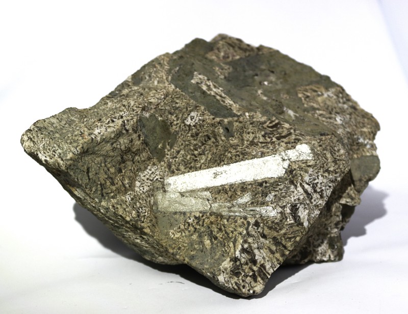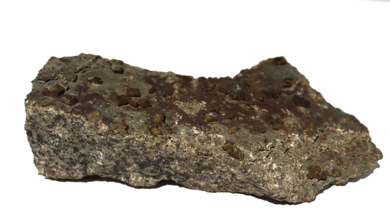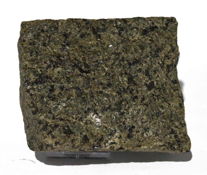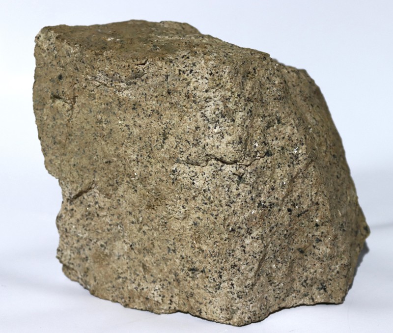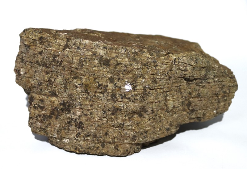 Слюда. Зразок представлений уламком (пачкою) кристалів слюди невизначеного габітусу. Зразок, на зовнішній вигляд, має зональне забарвлення з бурими плямами, що пов’язано з різною ступеню каолінізації. Блиск слюди перламутровий, непрозора. В тонких лусочках – прозора. Розділяється легко на пластинки завдяки досконалій спайності.