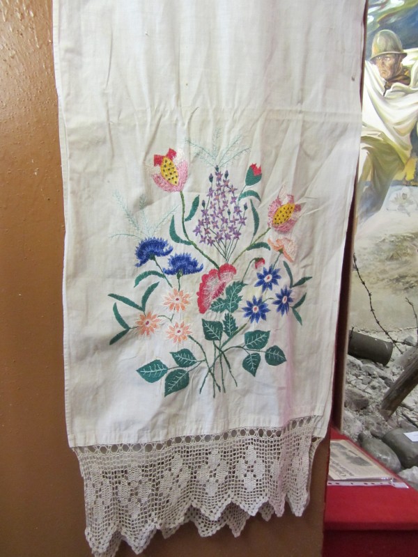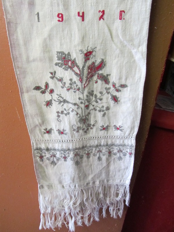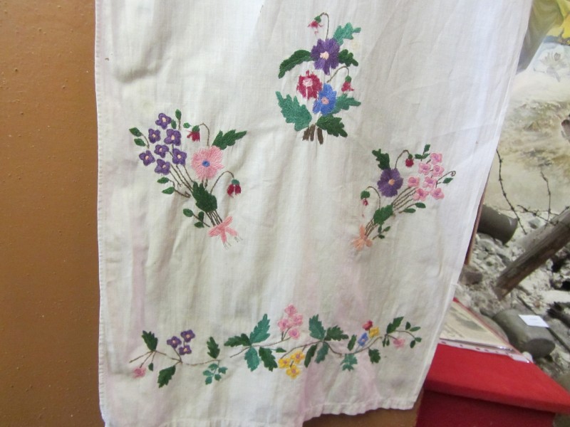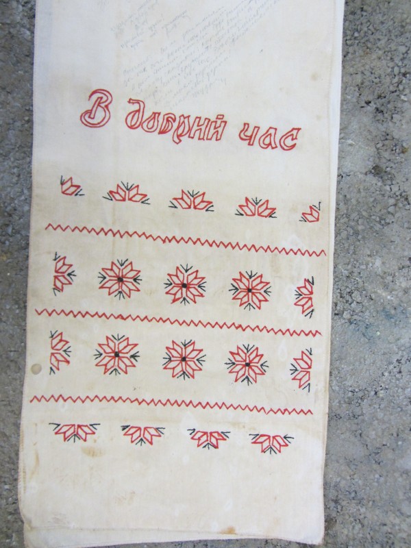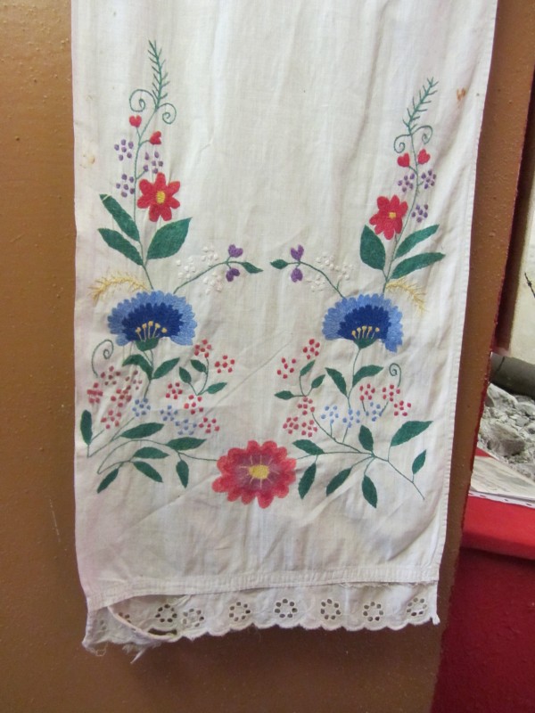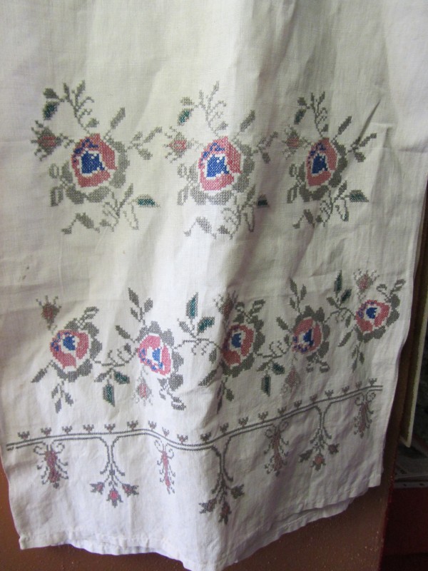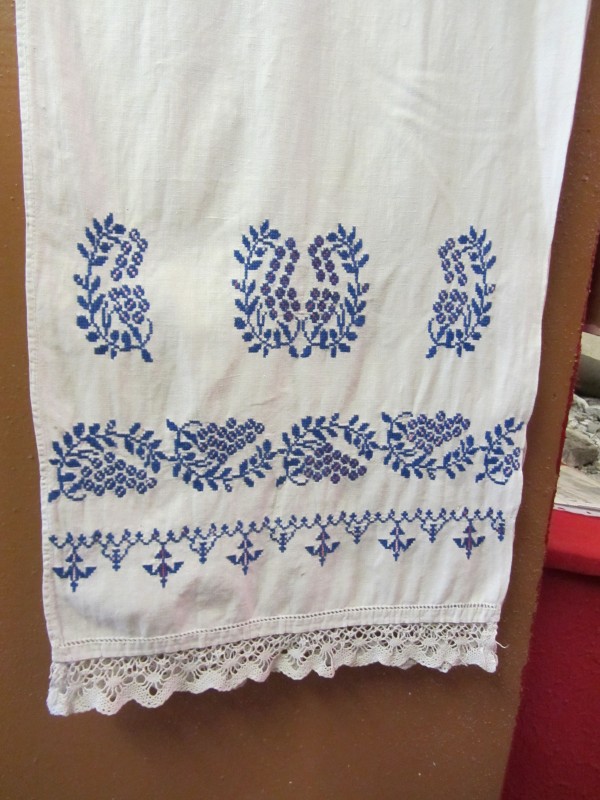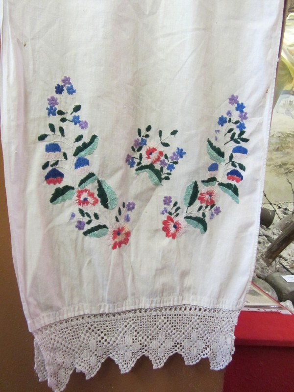 Основний орнамент на погрудках геометрично-рослинний у вигляді широкої вертикальної смуги, що складається з ромбів з ружами між якими косі (вправо та ліво) стилізовані рослинні смужки з ружами. По краю з трьох сторін хвиляста рослинна смужка. Елементи погрудок вишиті на комірі та широких манжетах, що застібаються на ґудзики. Основні кольори чорний та червоний. По низу доточена смуга тканини.